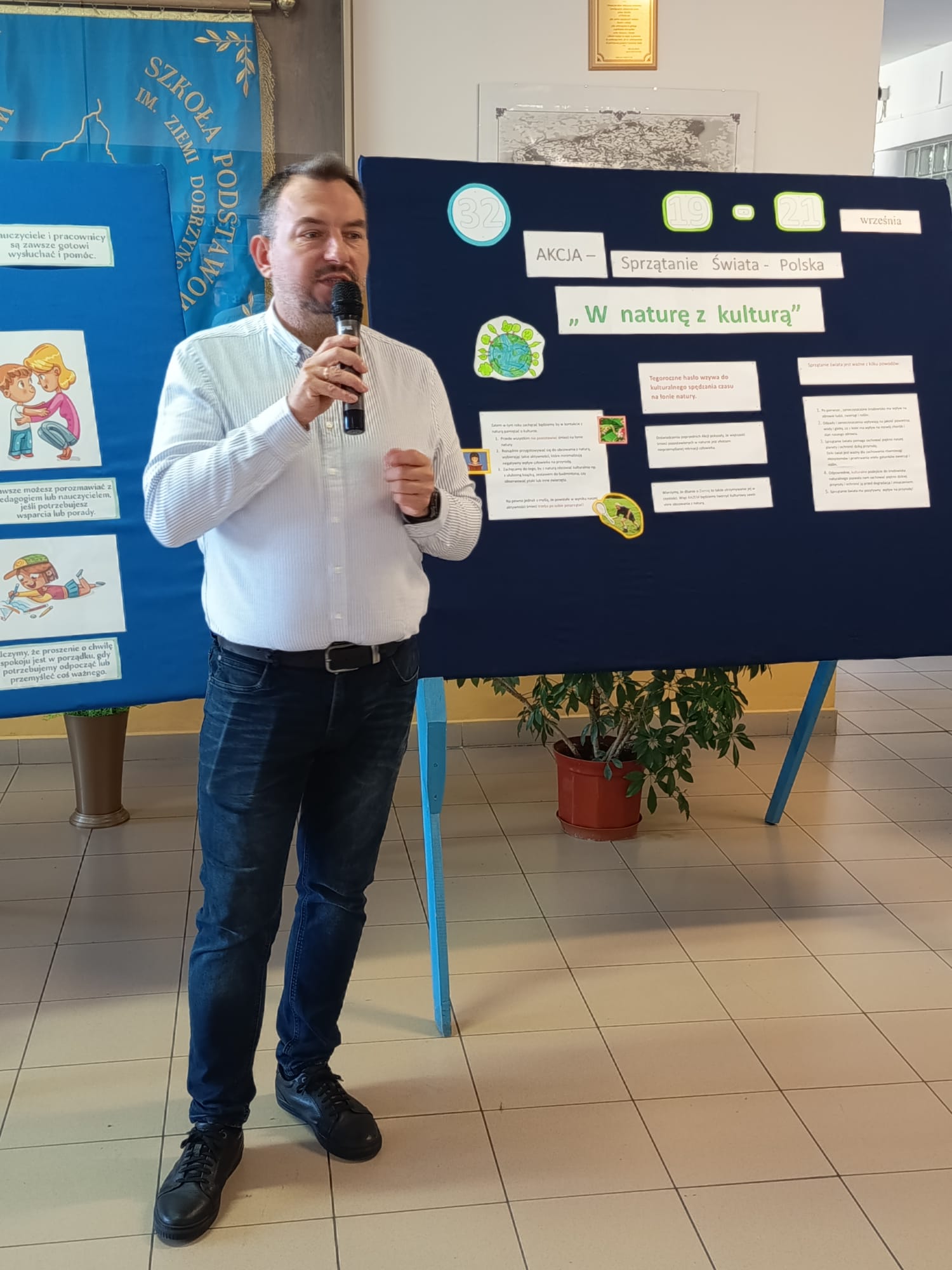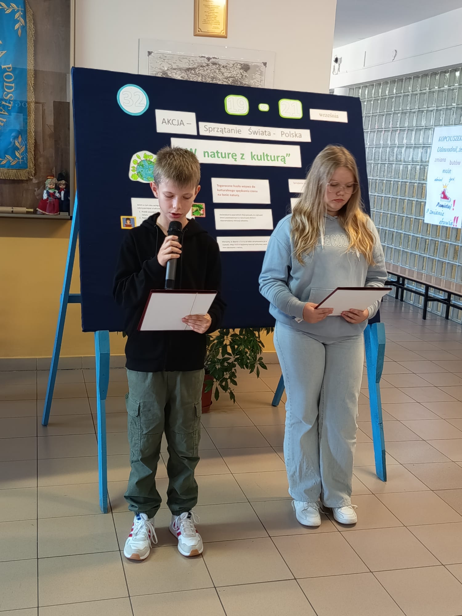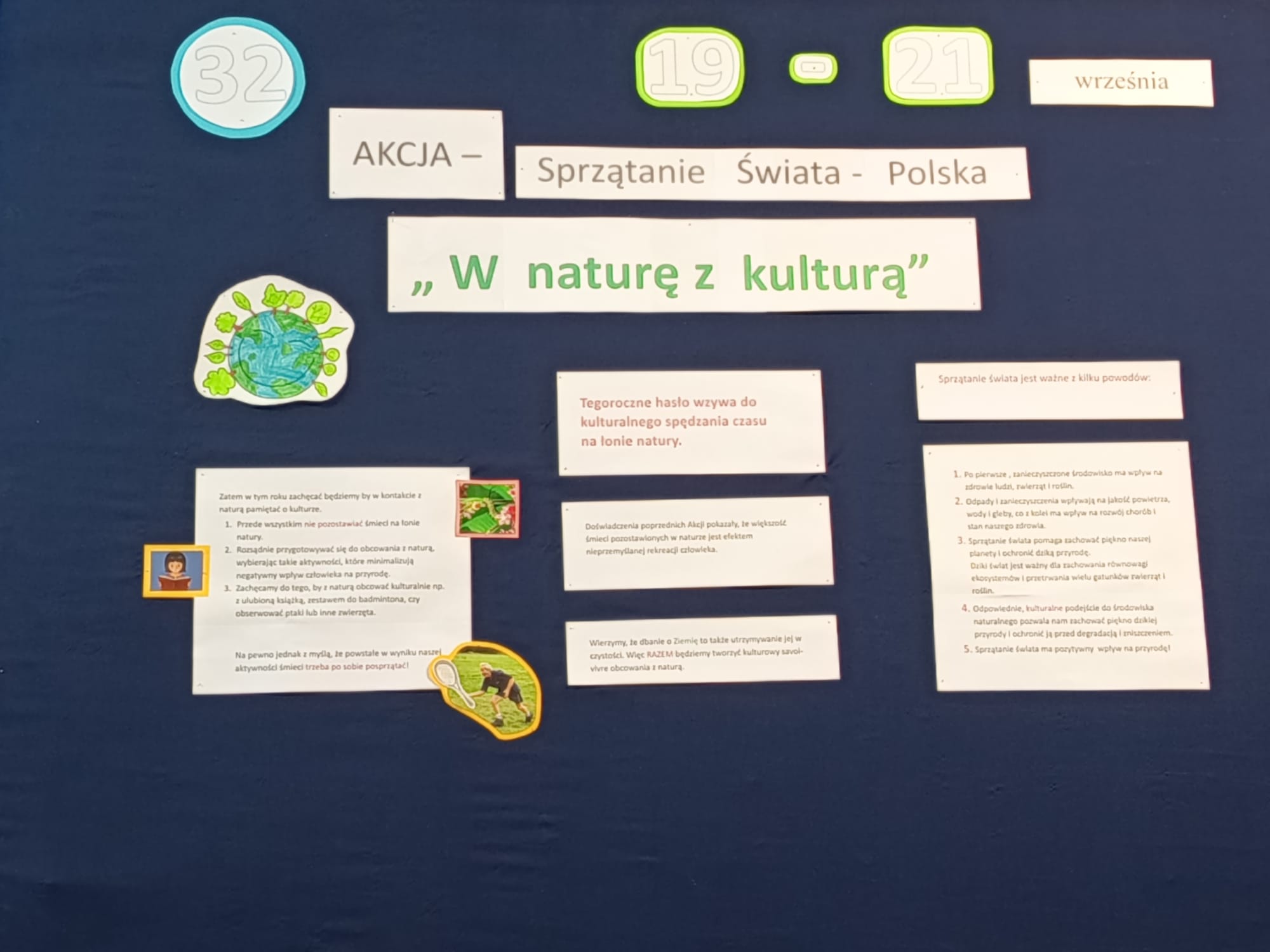 W dniu 20 września w naszej szkole odbyła się 32 akcja Sprzątania Świata pod hasłem „W naturę z kulturą”. Sprzątanie Świata jest częścią międzynarodowego ruchu na rzecz ochrony środowiska, w którym uczestniczy blisko 40 milionów wolontariuszy z ponad czterdziestu krajów na całym świecie. W Polsce akcję zainicjowano w 1994 roku. Jej celem jest promowanie nie śmiecenia, edukacja odpadowa oraz inicjowanie działań, dzięki którym zmniejszy się nasz negatywny wpływ na środowisko. W ramach wydarzenia na holu szkoły powstała promująca je gazetka oraz odbył się apel, podczas którego uczniowie zostali zapoznani z tegorocznymi celami Sprzątania. Uczniowie klas młodszych wykonali prace o tematyce ekologicznej, natomiast klasy starsze udały się na sprzątanie terenów w pobliżu szkoły oraz lasu.