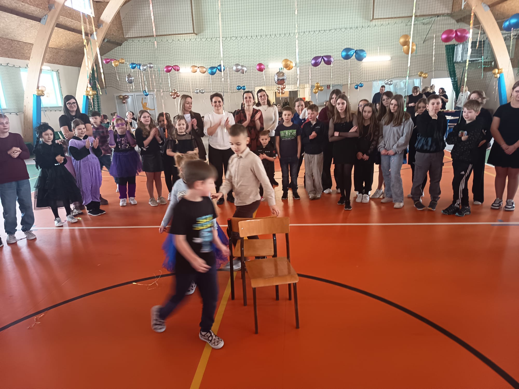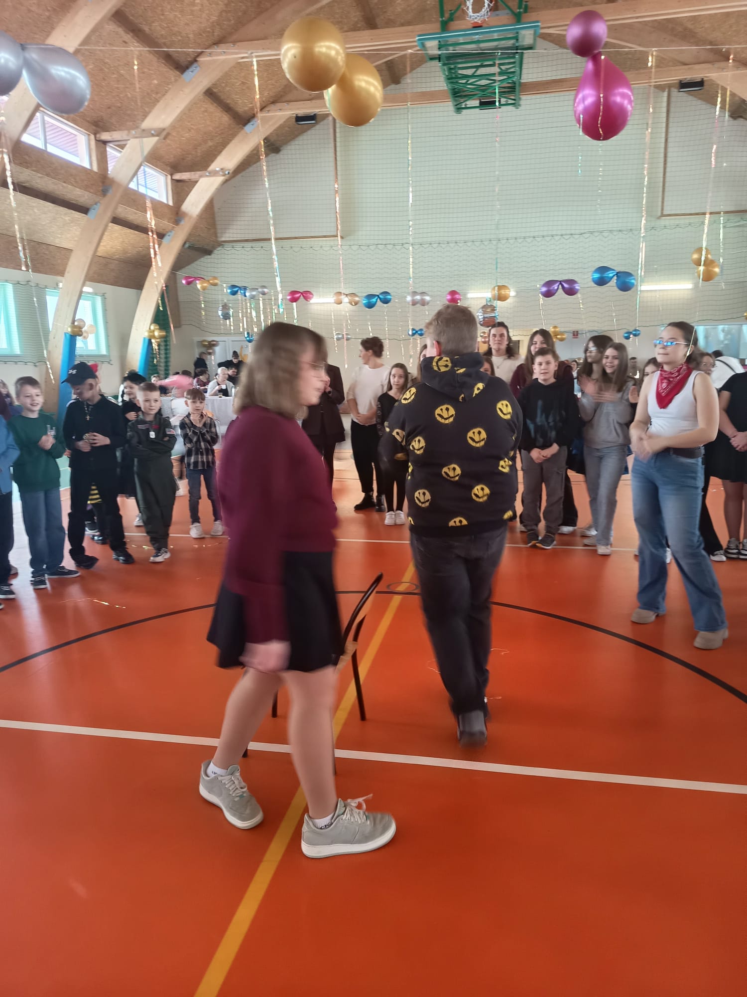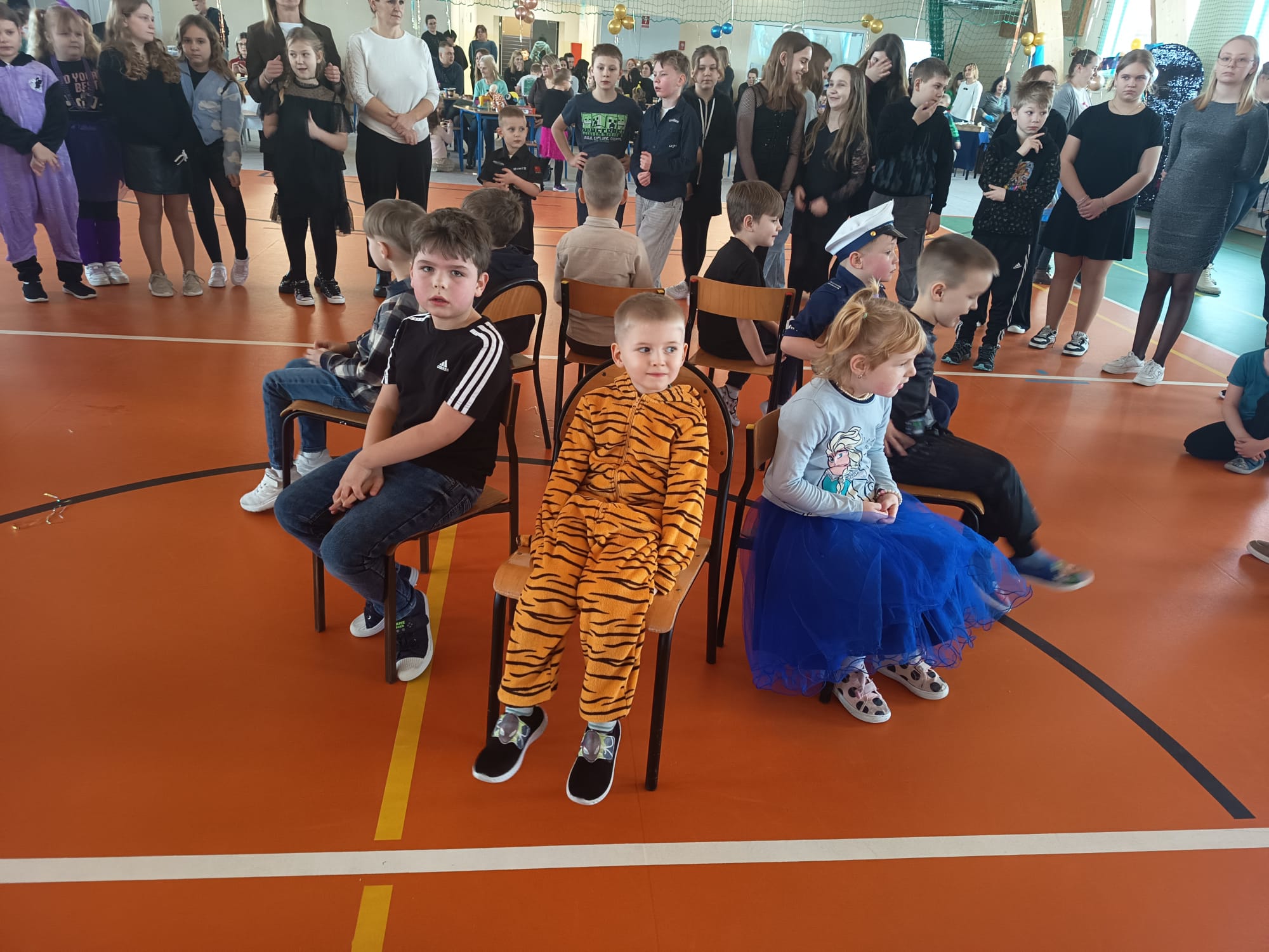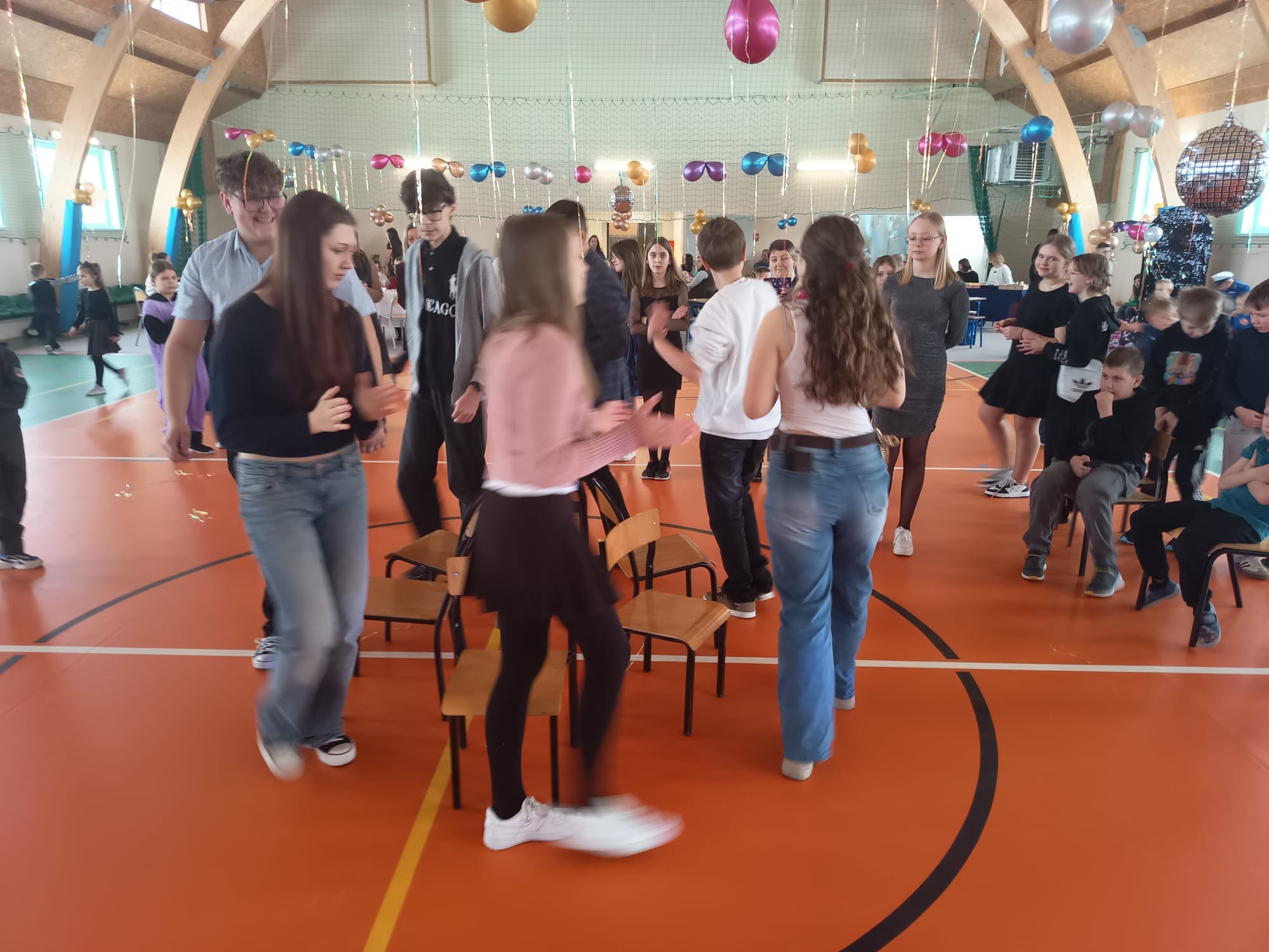 W godzinach 9.00–12.30 sala szkolna zamieniła się w barwną przestrzeń pełną muzyki, tańca oraz kolorowych strojów. Uczniowie z ogromnym entuzjazmem uczestniczyli w dyskotece, którą poprowadził uczeń i uczennica klasy ósmej. Dzięki ich zaangażowaniu oraz świetnie dobranej muzyce wszyscy bawili się znakomicie, a parkiet przez cały czas był pełen tańczących dzieci.