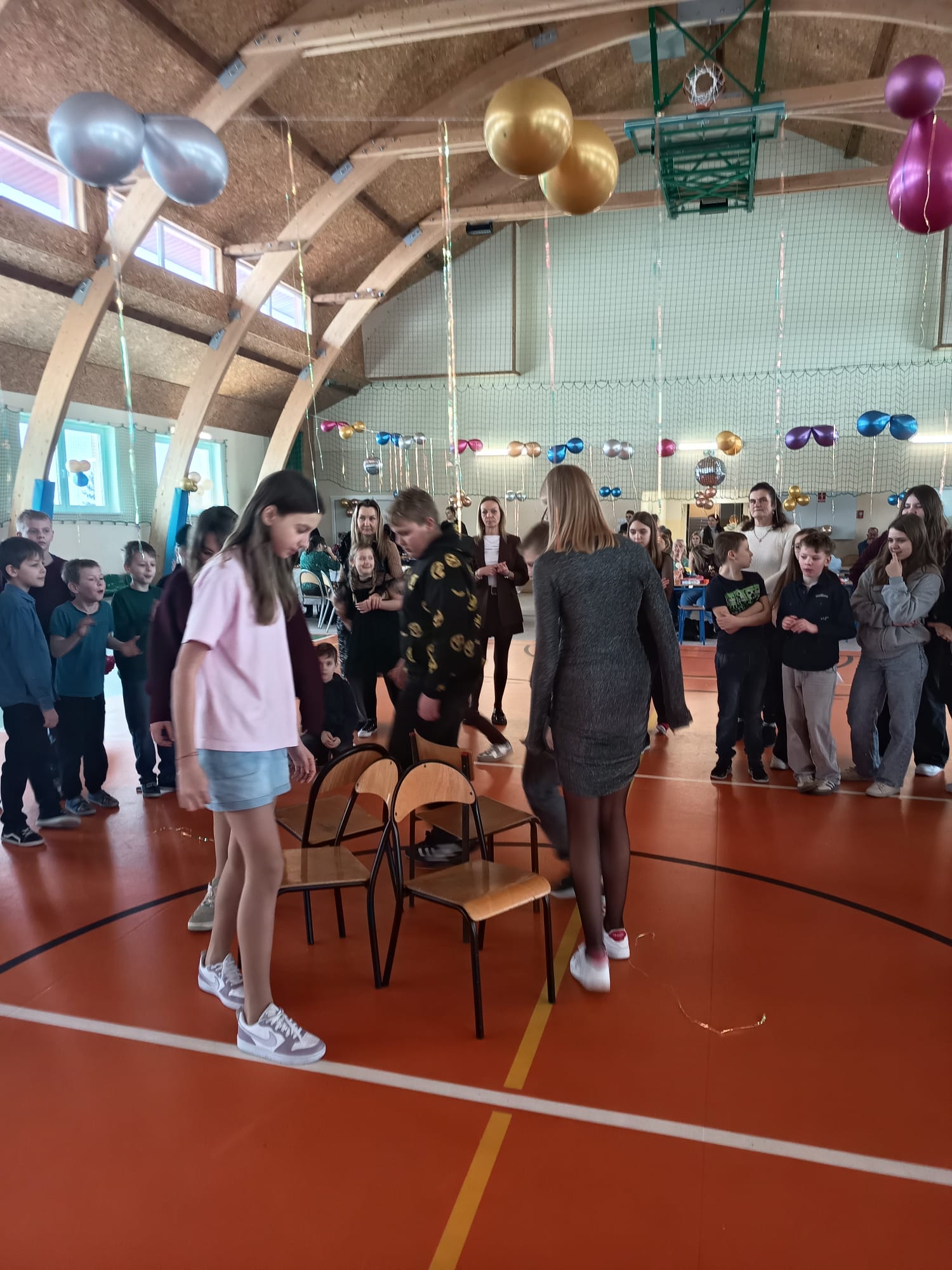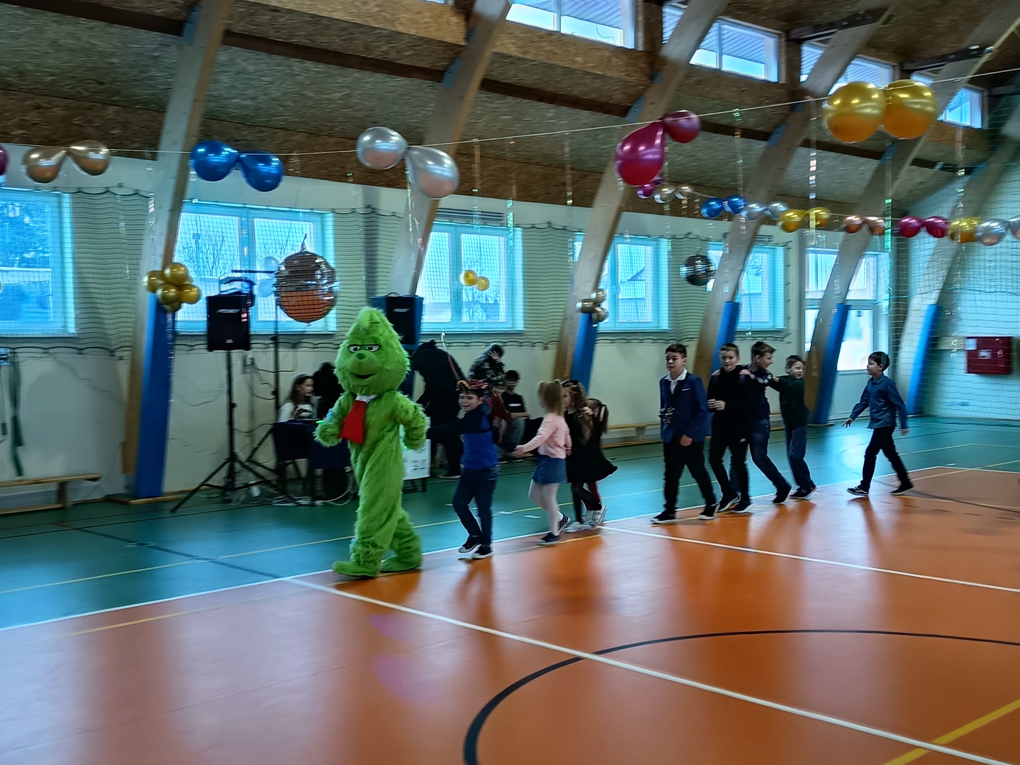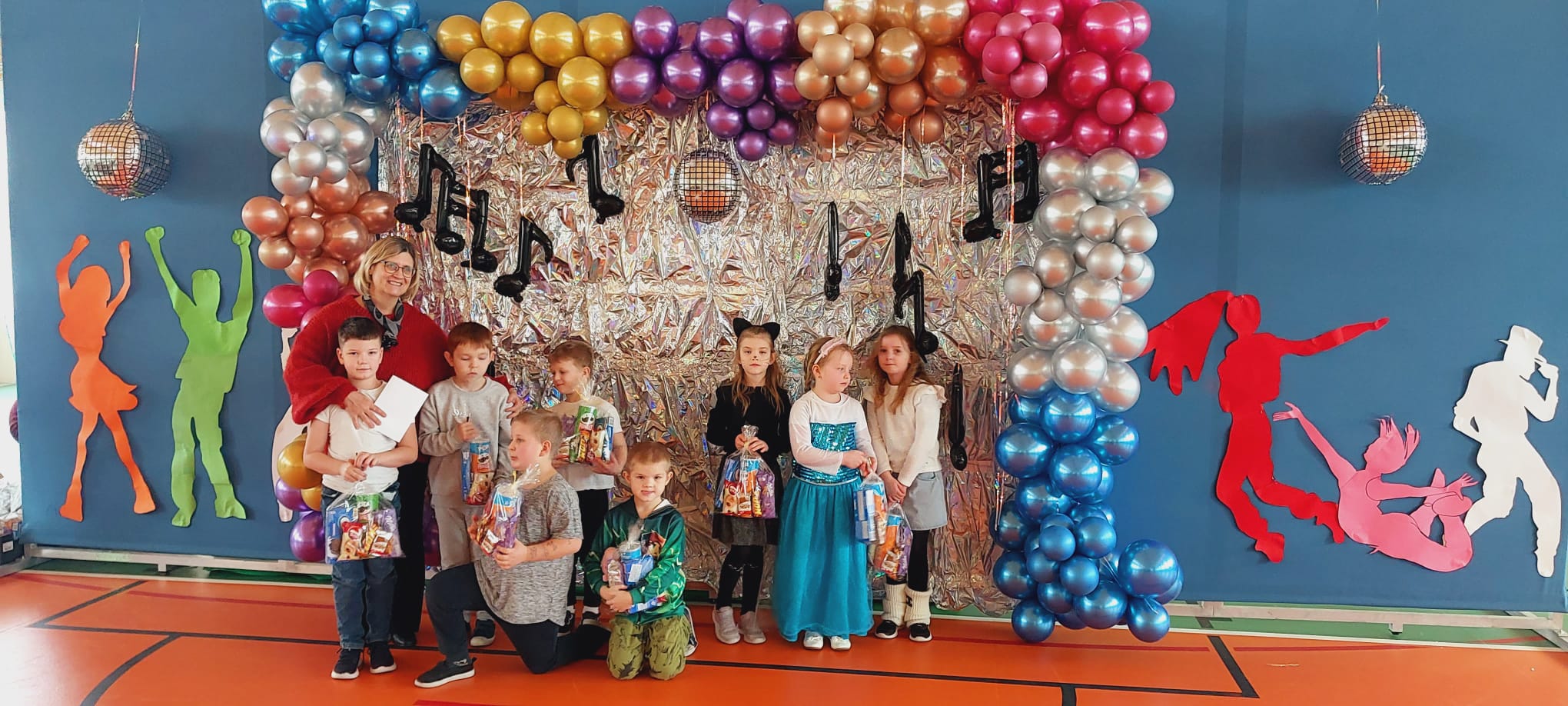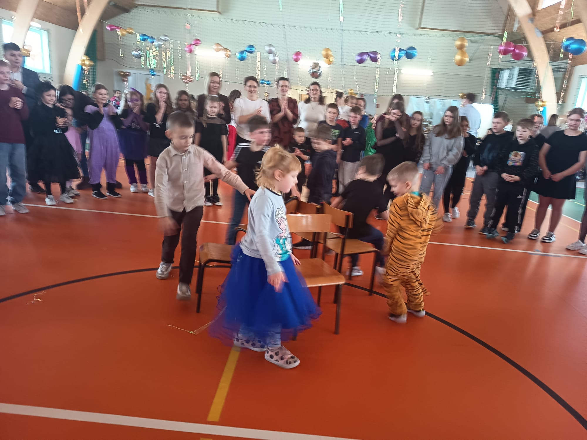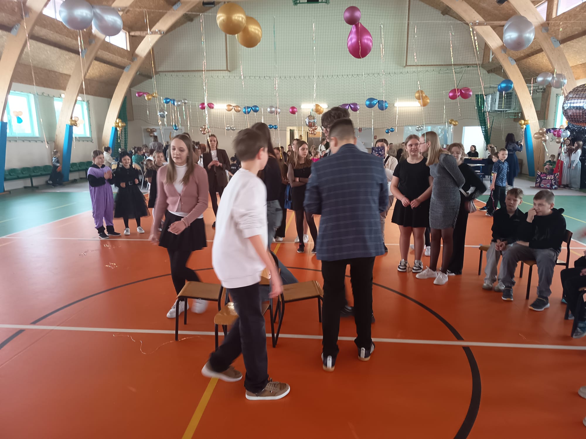 W godzinach 9.00–12.30 sala szkolna zamieniła się w barwną przestrzeń pełną muzyki, tańca oraz kolorowych strojów. Uczniowie z ogromnym entuzjazmem uczestniczyli w dyskotece, którą poprowadził uczeń i uczennica klasy ósmej. Dzięki ich zaangażowaniu oraz świetnie dobranej muzyce wszyscy bawili się znakomicie, a parkiet przez cały czas był pełen tańczących dzieci.