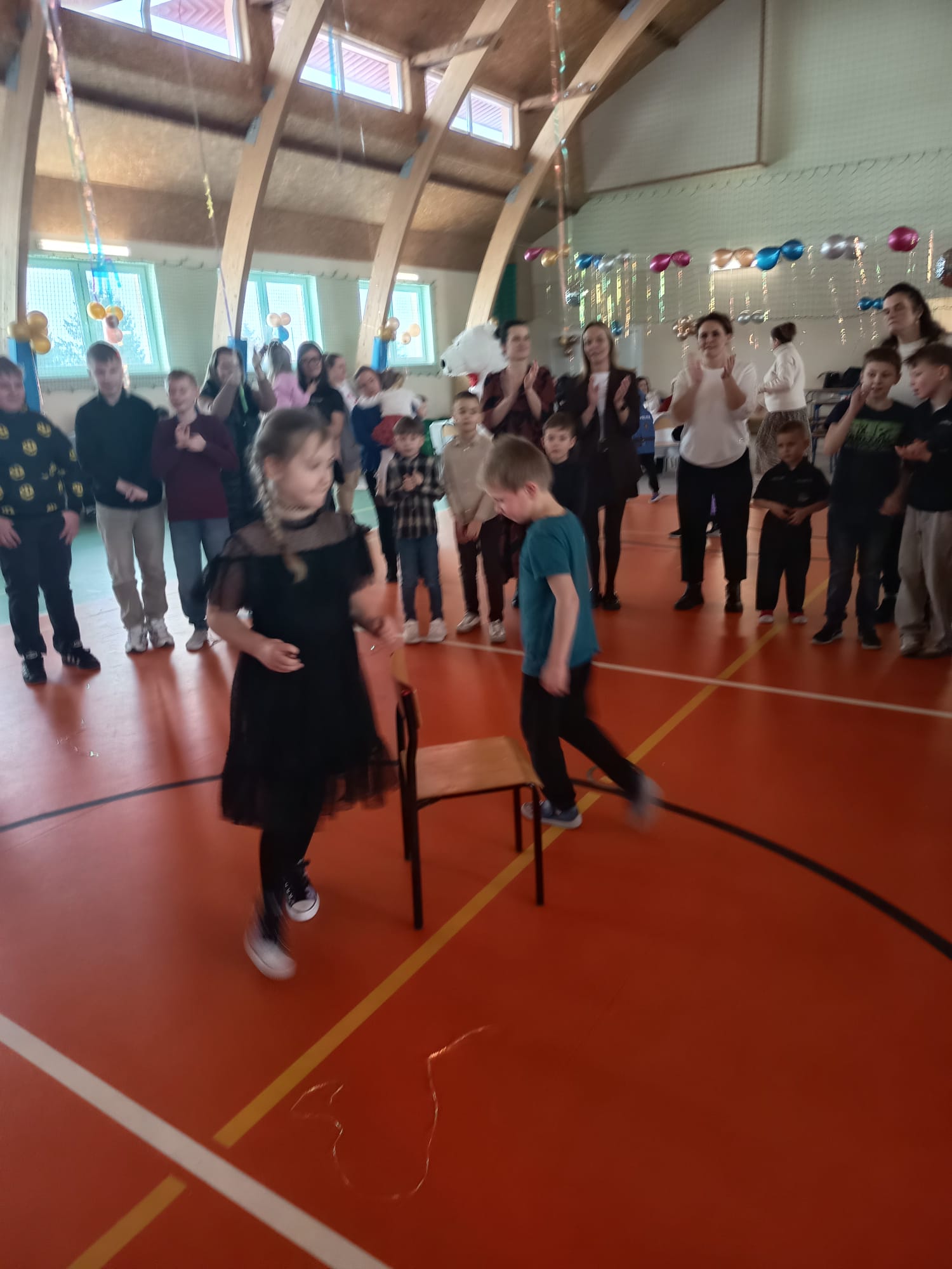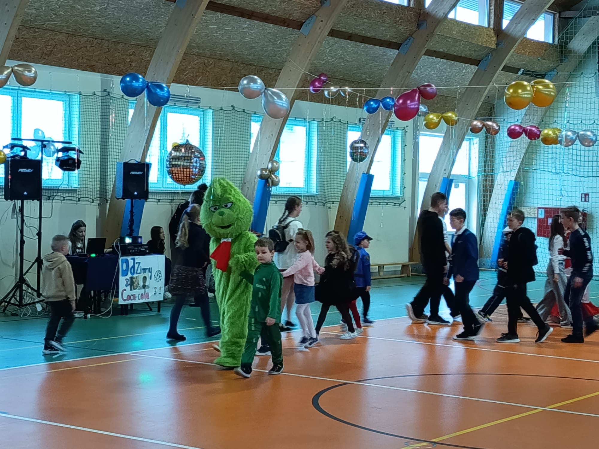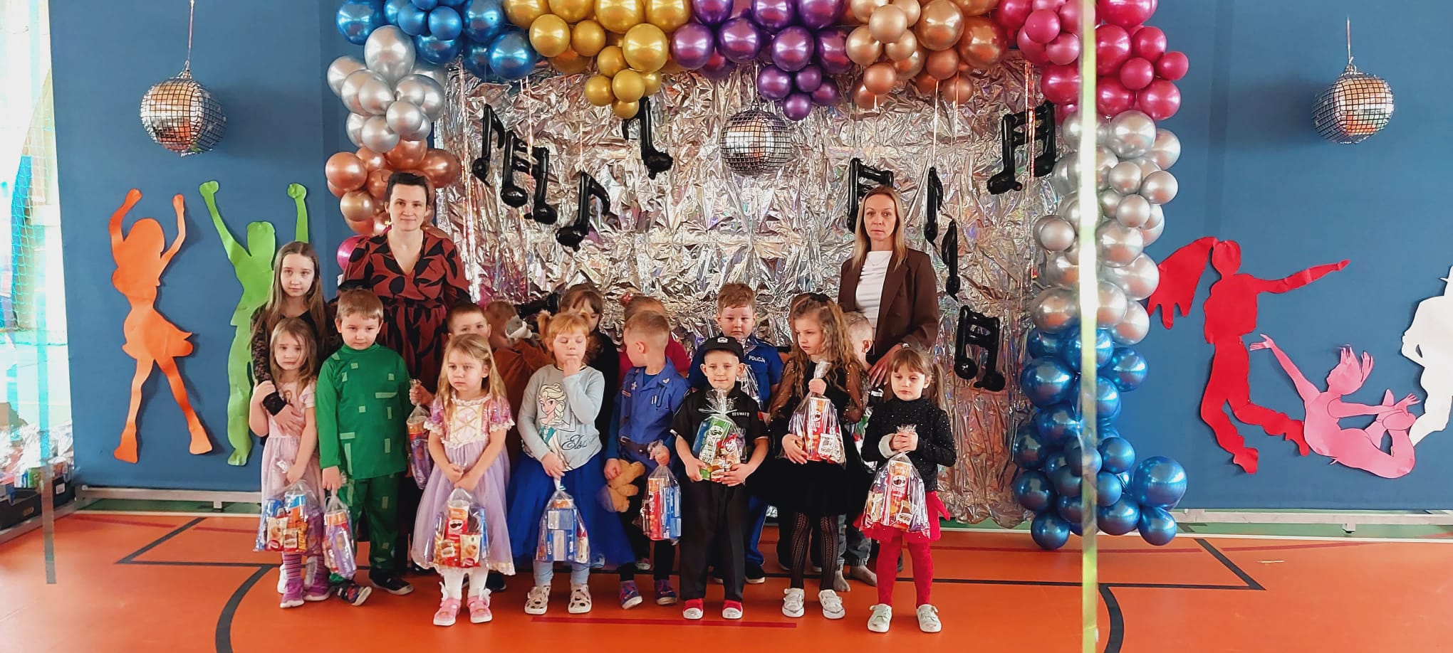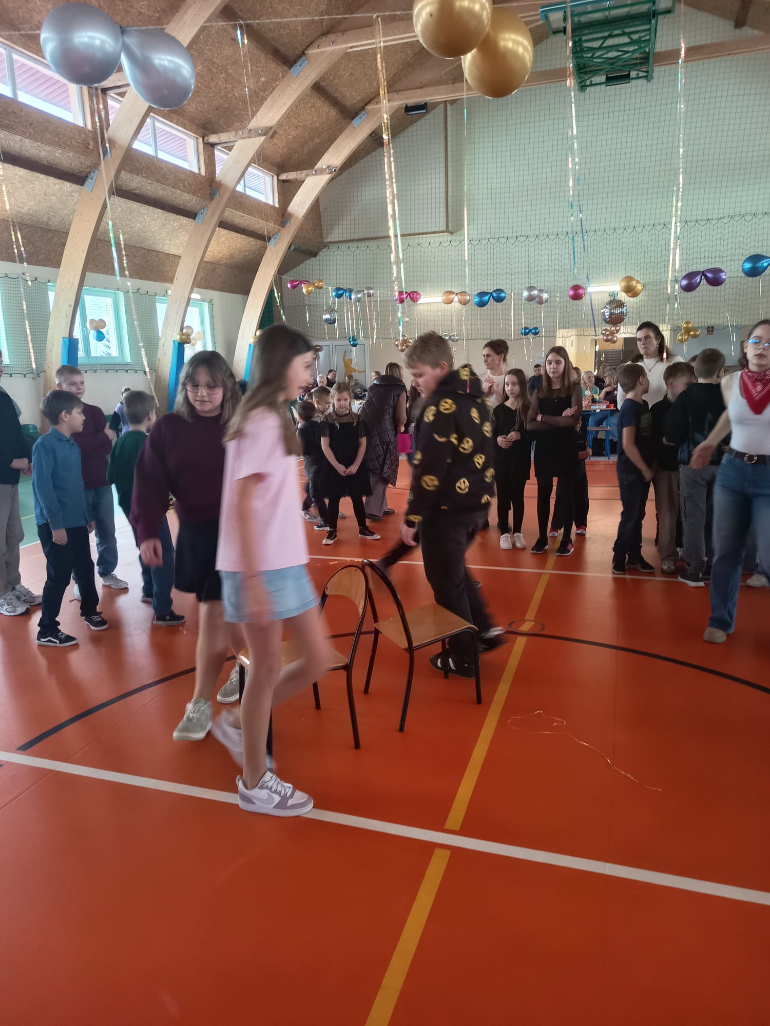 W godzinach 9.00–12.30 sala szkolna zamieniła się w barwną przestrzeń pełną muzyki, tańca oraz kolorowych strojów. Uczniowie z ogromnym entuzjazmem uczestniczyli w dyskotece, którą poprowadził uczeń i uczennica klasy ósmej. Dzięki ich zaangażowaniu oraz świetnie dobranej muzyce wszyscy bawili się znakomicie, a parkiet przez cały czas był pełen tańczących dzieci.