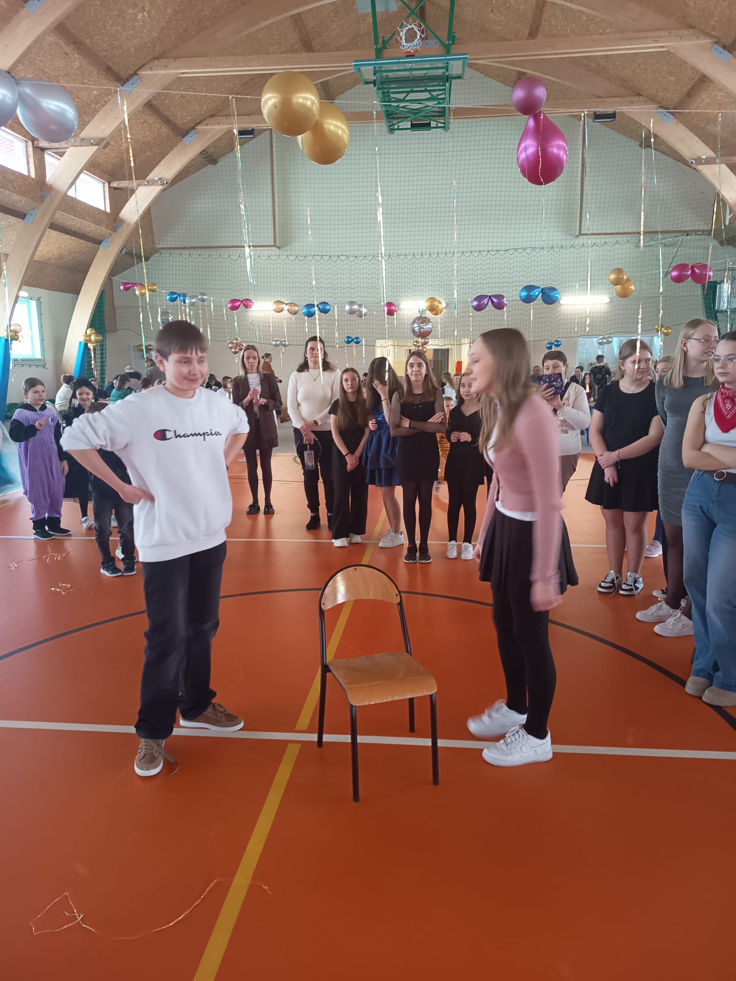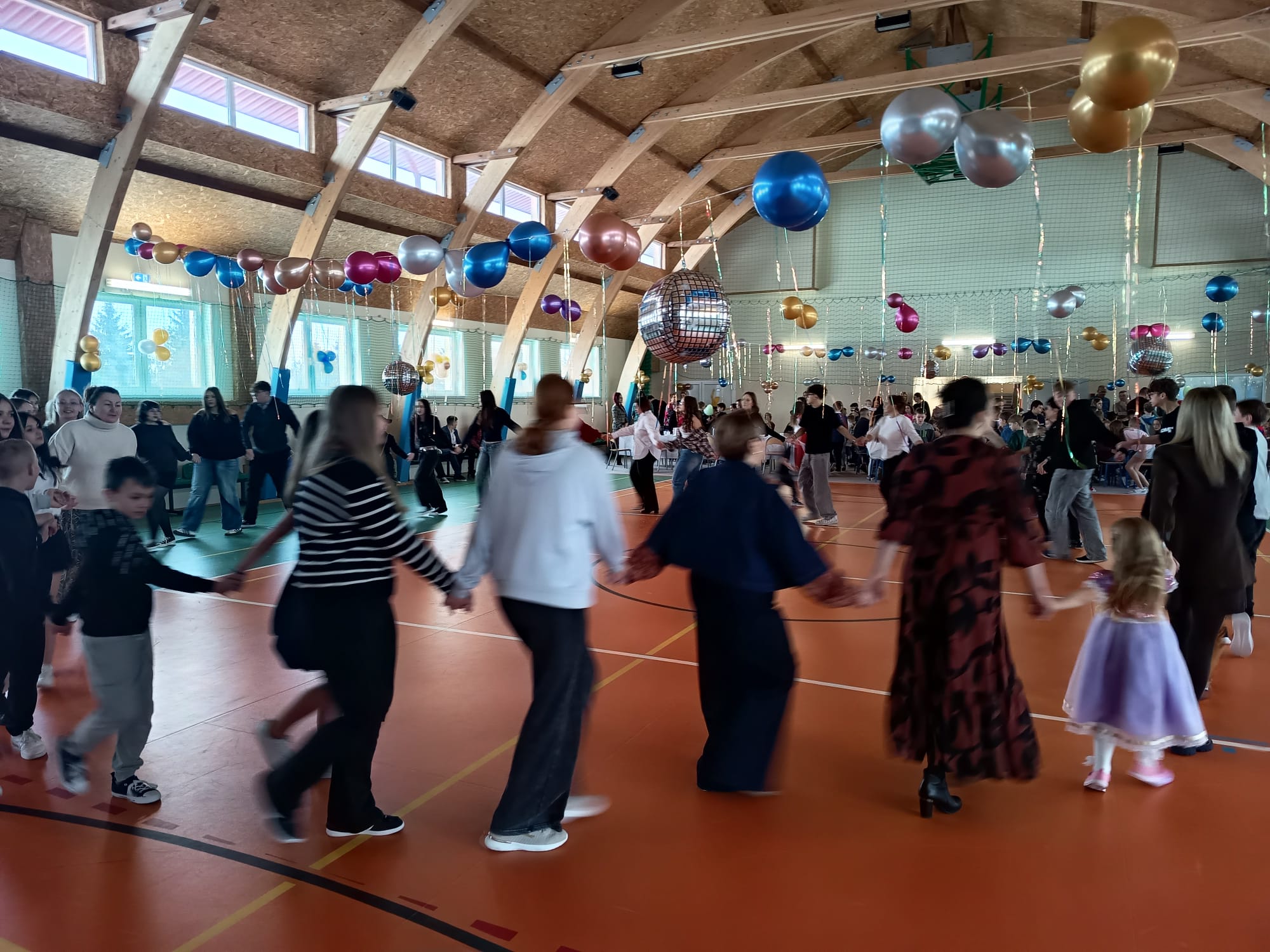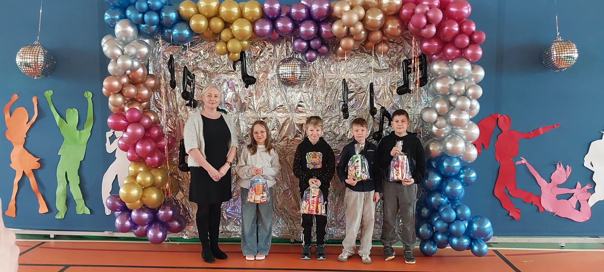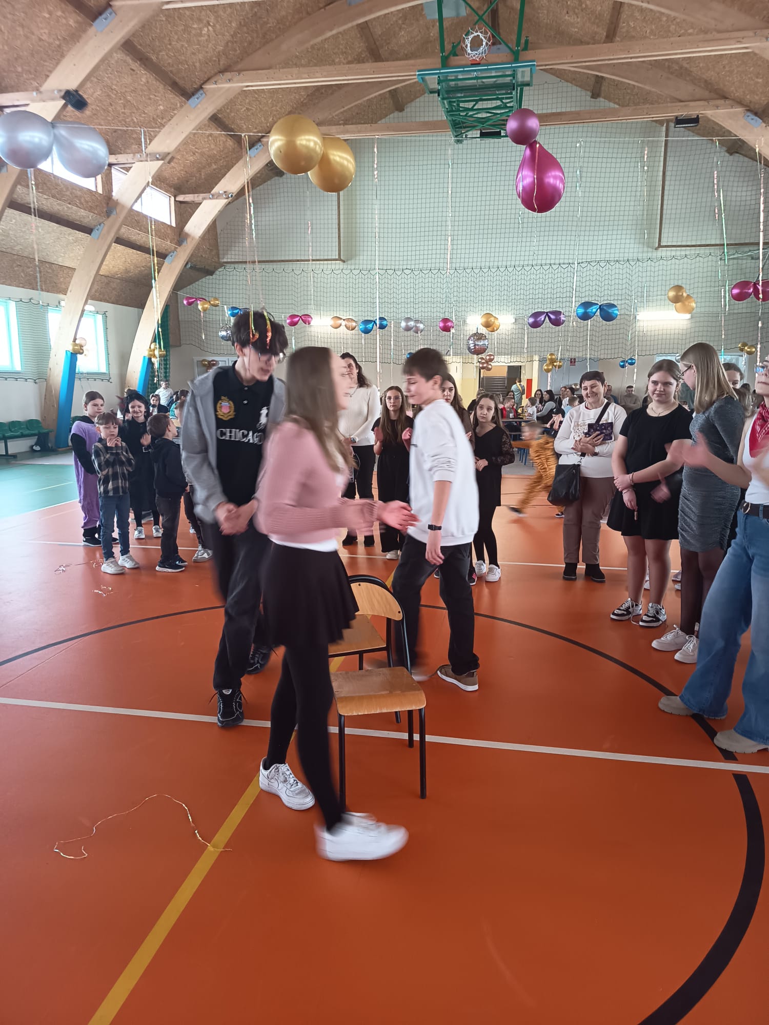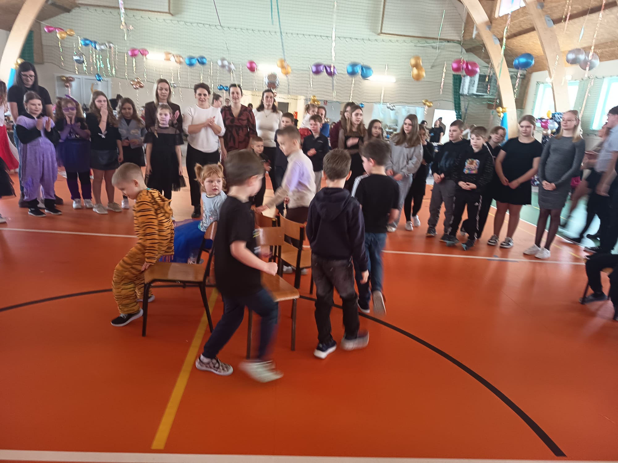 W godzinach 9.00–12.30 sala szkolna zamieniła się w barwną przestrzeń pełną muzyki, tańca oraz kolorowych strojów. Uczniowie z ogromnym entuzjazmem uczestniczyli w dyskotece, którą poprowadził uczeń i uczennica klasy ósmej. Dzięki ich zaangażowaniu oraz świetnie dobranej muzyce wszyscy bawili się znakomicie, a parkiet przez cały czas był pełen tańczących dzieci.