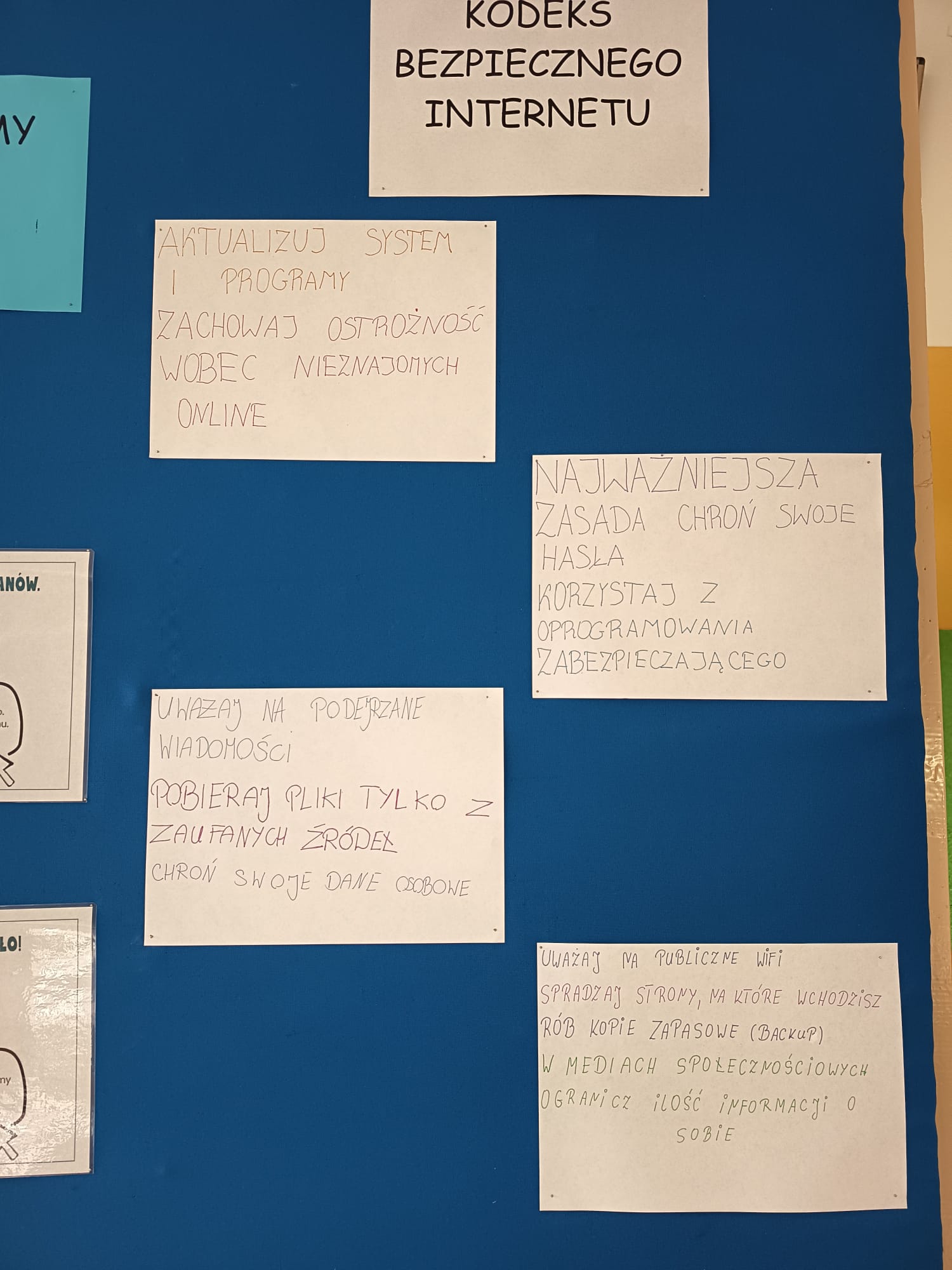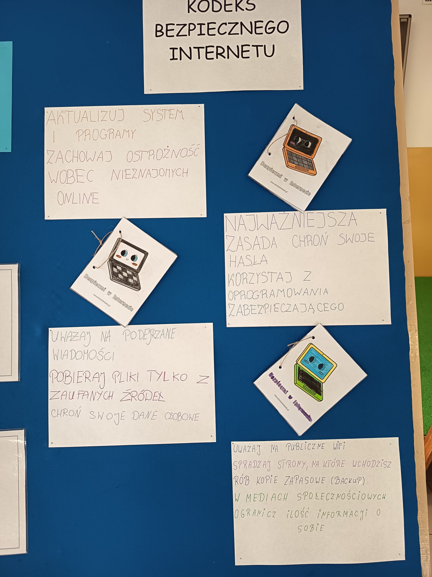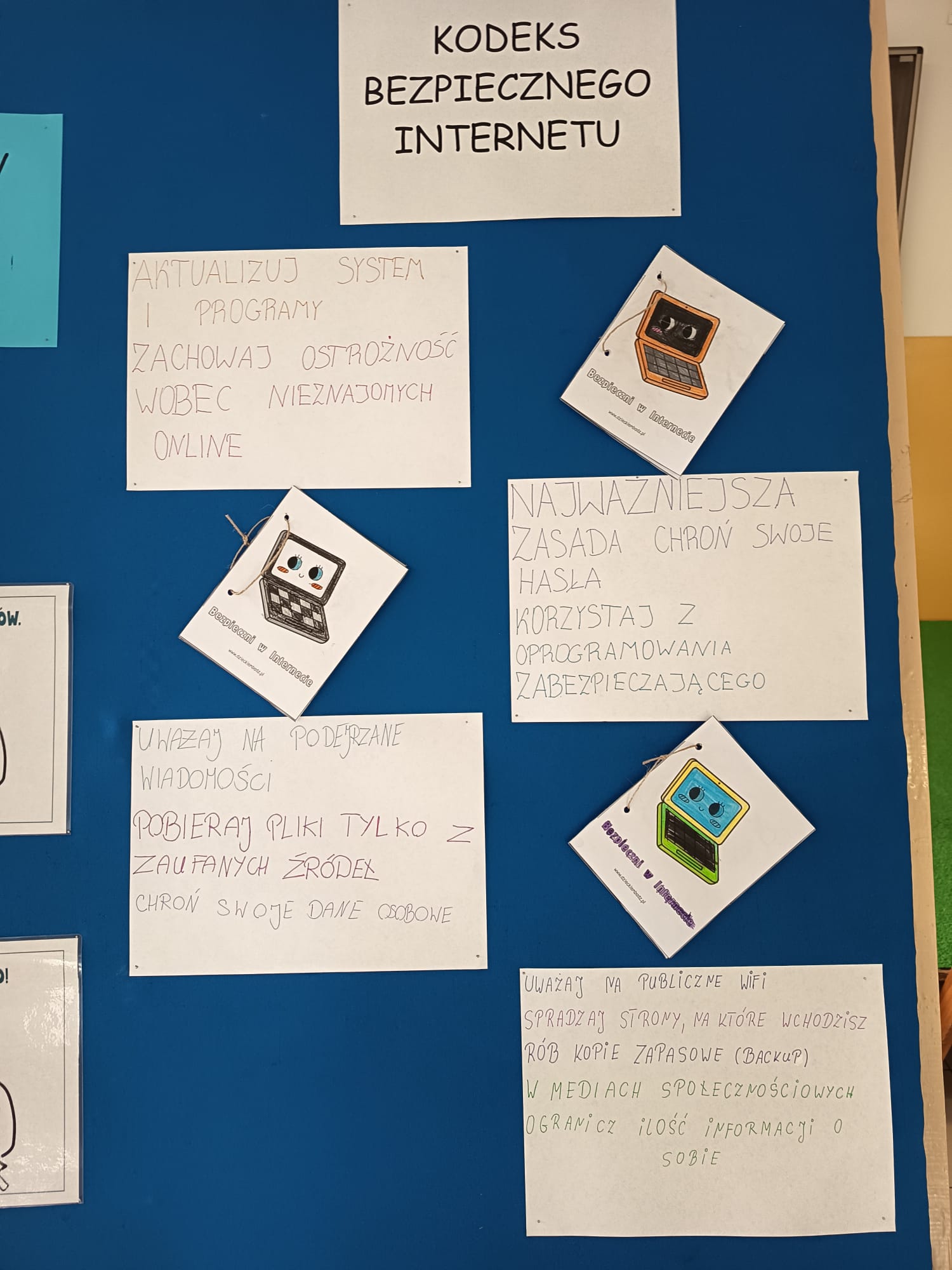 W dniach 18.02.–25.02.2026 w związku z Dniem Bezpiecznego Internetu w naszej szkole zostały przeprowadzone następujące działania: Dzieci ze starszego oddziału przedszkolnego pod opieką Pani Marioli Łasińskiej po wysłuchaniu pogadanki dotyczącej bezpieczeństwa w sieci wykonały konkursowe prace plastyczne na temat „Superbohater – obrońca Internetu”. Uczniowie klas I–III podczas zajęć komputerowych przeprowadzonych przez Panią Małgorzatę Kalinowską uzupełnili karty pracy dotyczące prywatności w sieci, bezpieczeństwa w Internecie oraz odpowiedzieli na pytanie: „Co zamiast Internetu?”. Wychowawcy klas IV–VIII podczas zajęć z wychowawcą przeprowadzili lekcje dotyczące hejtu oraz netykiety. Ponadto, pod opieką Pana Jarosława Łasińskiego i Pani Marii Daczko, uczniowie stworzyli Kodeks Bezpiecznego Internetu na podstawie haseł odczytanych z kodów QR umieszczonych w różnych miejscach sali gimnastycznej. Kodeks oraz prace uczniów można podziwiać w holu szkoły, do czego serdecznie zachęcamy. Nasza szkolna inicjatywa została zgłoszona do Polskie Centrum Programu Safer Internet (PCPSI), dzięki czemu uzyskaliśmy certyfikat. Wszystkie działania miały na celu promowanie bezpiecznego i odpowiedzialnego korzystania z Internetu. Mamy nadzieję, że udało nam się podnieść świadomość uczniów w tej materii.