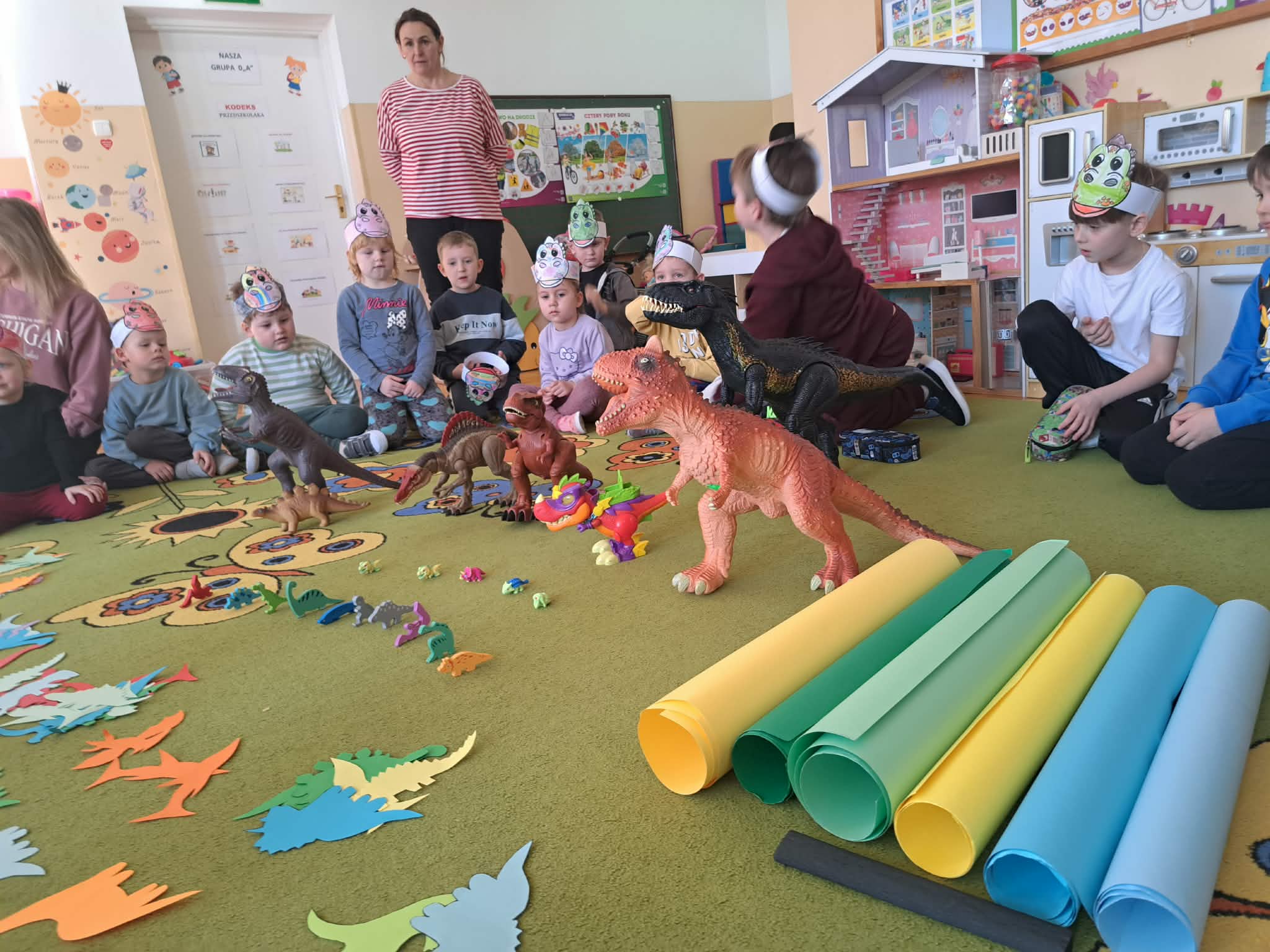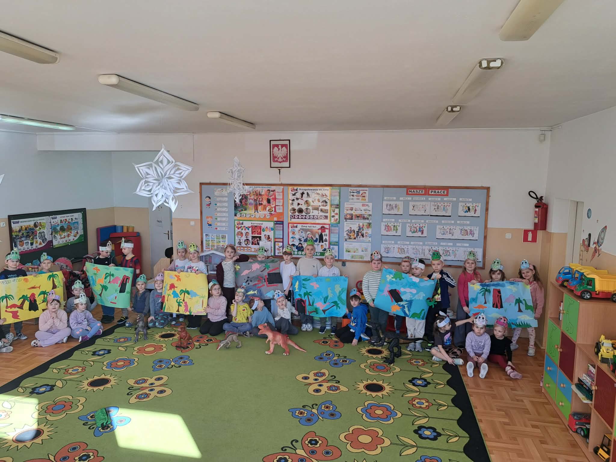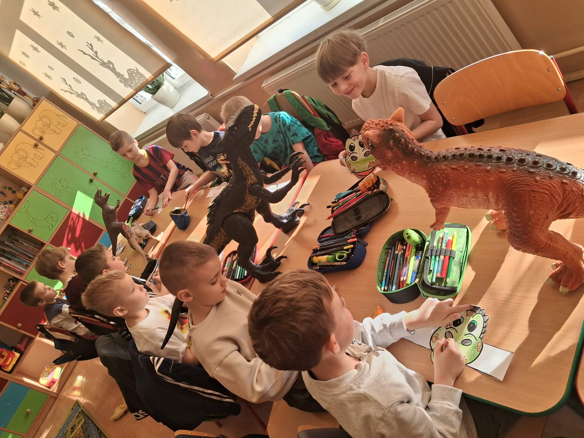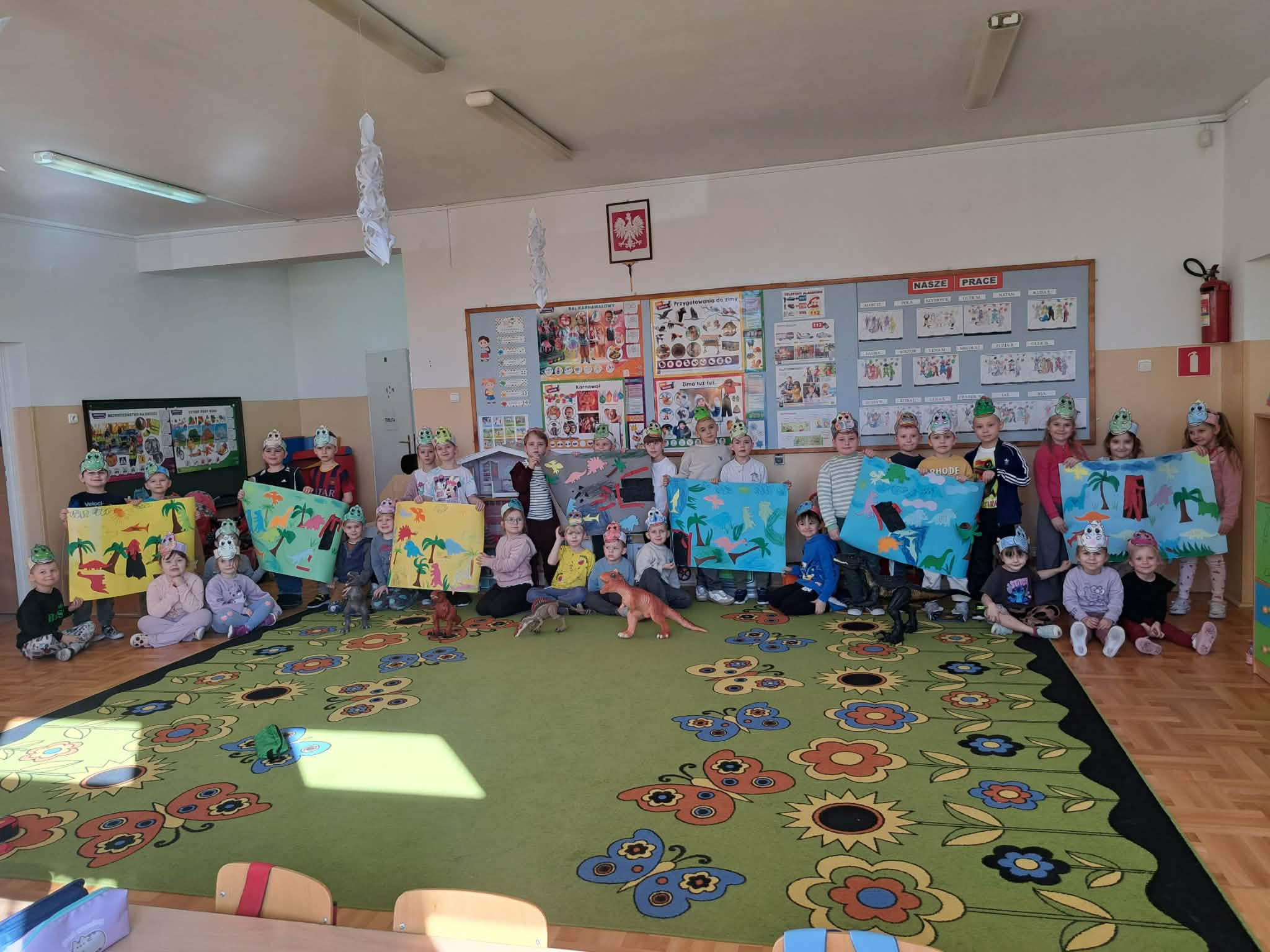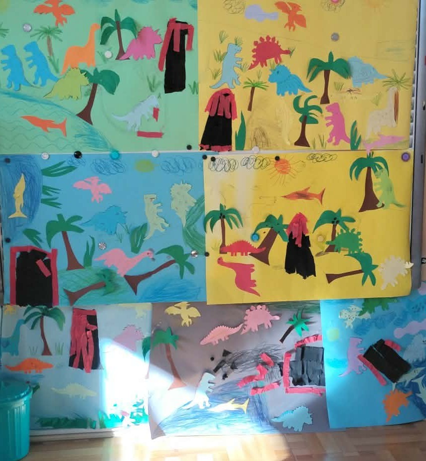 W naszych oddziałach przedszkolnych obchodziliśmy wyjątkowe święto – Dzień Dinozaura! Tego dnia sala zamieniła się w prawdziwy prehistoryczny świat pełen ciekawostek, zabawy i odkryć. Dzieci poznały fascynujące informacje o dinozaurach, takich jak Tyrannosaurus rex, Triceratops oraz Stegosaurus. Dowiedziały się, czym się żywiły, jak wyglądały oraz dlaczego wyginęły. Nie zabrakło wspólnego oglądania książek i ilustracji przedstawiających te niezwykłe stworzenia. Przedszkolaki uczestniczyły w wielu kreatywnych aktywnościach – wykonały prace plastyczne w grupach przedstawiające „Świat Dinozaurów” .Ogromną radość sprawiło dzieciom naśladowanie odgłosów i ruchów prehistorycznych gadów, podczas zabawy ruchowej przy piosence „Jakie dinozaury” . Dzień Dinozaura był doskonałą okazją do rozwijania ciekawości świata, poszerzania wiedzy przyrodniczej oraz wspólnej, radosnej zabawy. To był dzień pełen emocji i uśmiechu, który na długo pozostanie w pamięci naszych przedszkolaków!