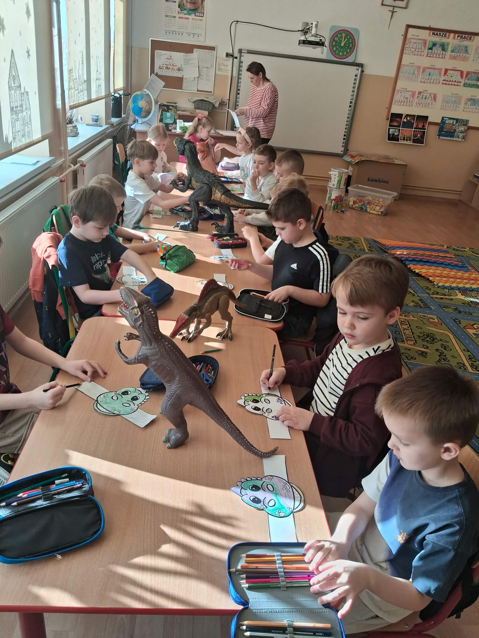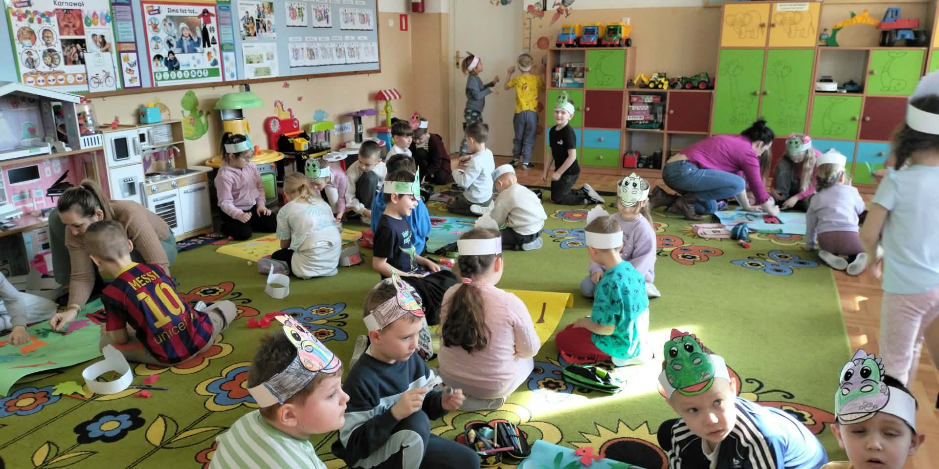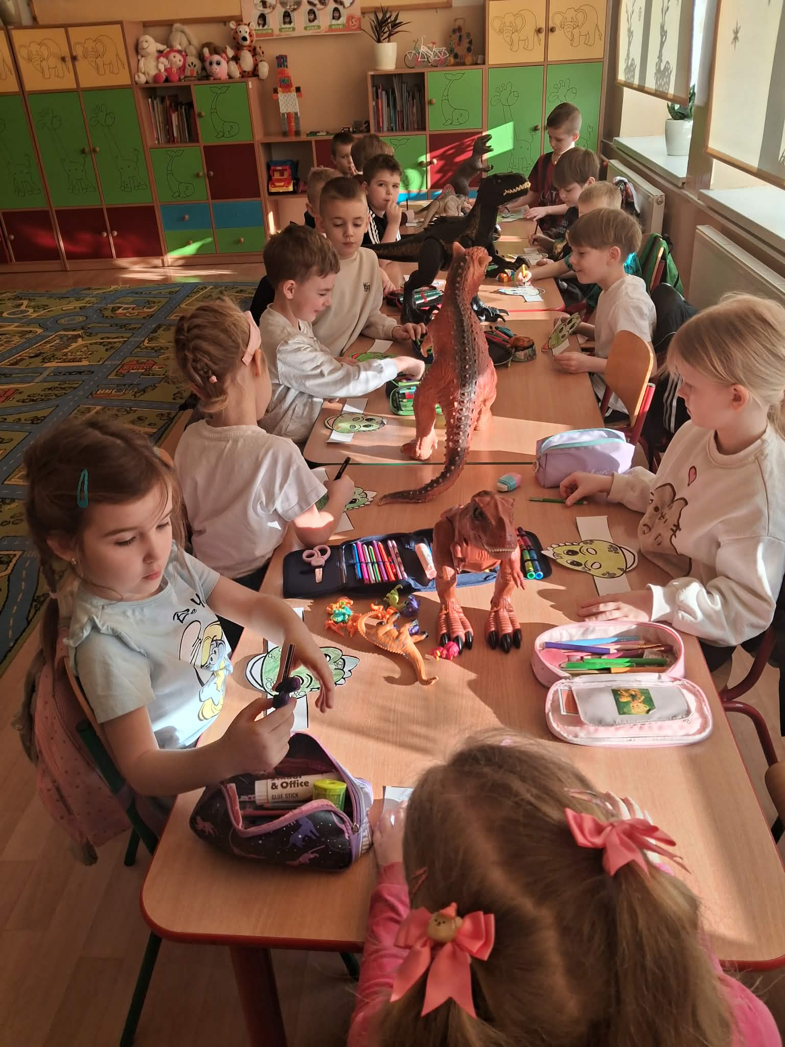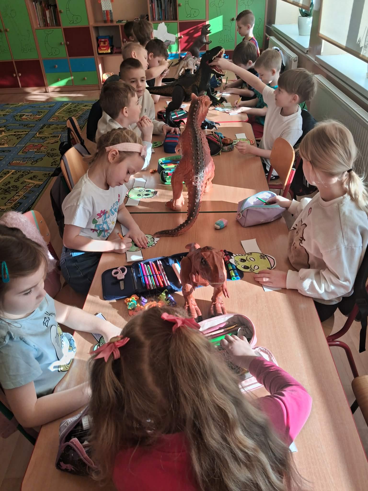 W naszych oddziałach przedszkolnych obchodziliśmy wyjątkowe święto – Dzień Dinozaura! Tego dnia sala zamieniła się w prawdziwy prehistoryczny świat pełen ciekawostek, zabawy i odkryć. Dzieci poznały fascynujące informacje o dinozaurach, takich jak Tyrannosaurus rex, Triceratops oraz Stegosaurus. Dowiedziały się, czym się żywiły, jak wyglądały oraz dlaczego wyginęły. Nie zabrakło wspólnego oglądania książek i ilustracji przedstawiających te niezwykłe stworzenia. Przedszkolaki uczestniczyły w wielu kreatywnych aktywnościach – wykonały prace plastyczne w grupach przedstawiające „Świat Dinozaurów” .Ogromną radość sprawiło dzieciom naśladowanie odgłosów i ruchów prehistorycznych gadów, podczas zabawy ruchowej przy piosence „Jakie dinozaury” . Dzień Dinozaura był doskonałą okazją do rozwijania ciekawości świata, poszerzania wiedzy przyrodniczej oraz wspólnej, radosnej zabawy. To był dzień pełen emocji i uśmiechu, który na długo pozostanie w pamięci naszych przedszkolaków!