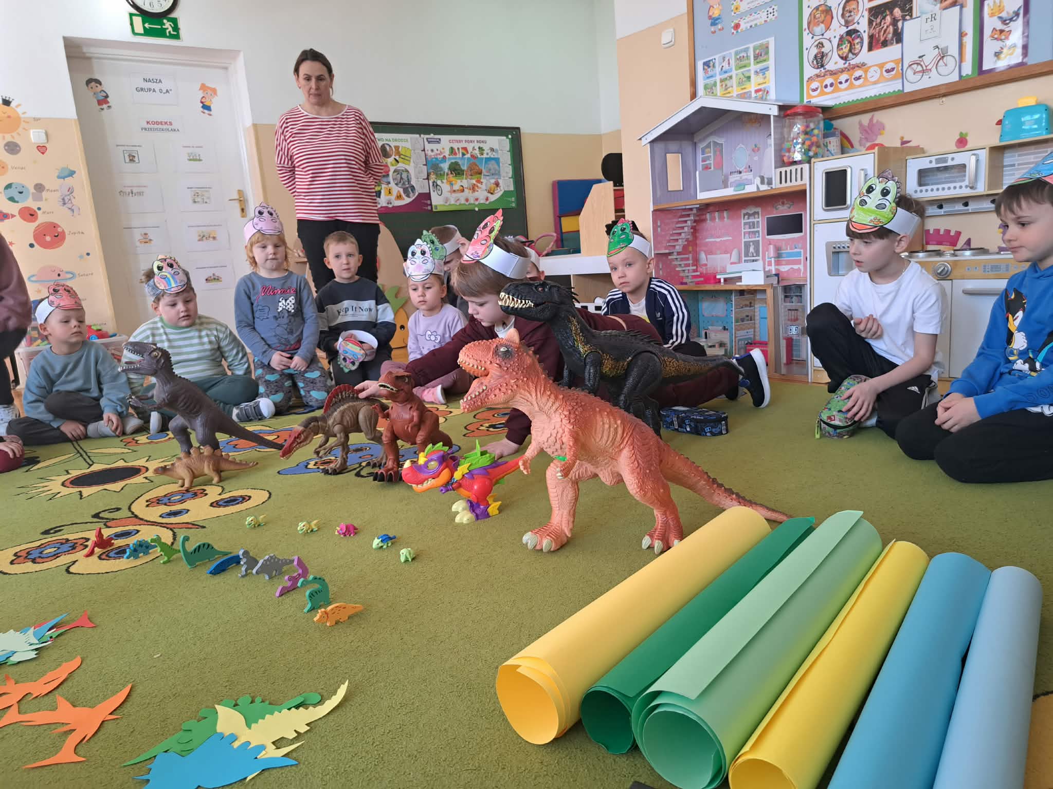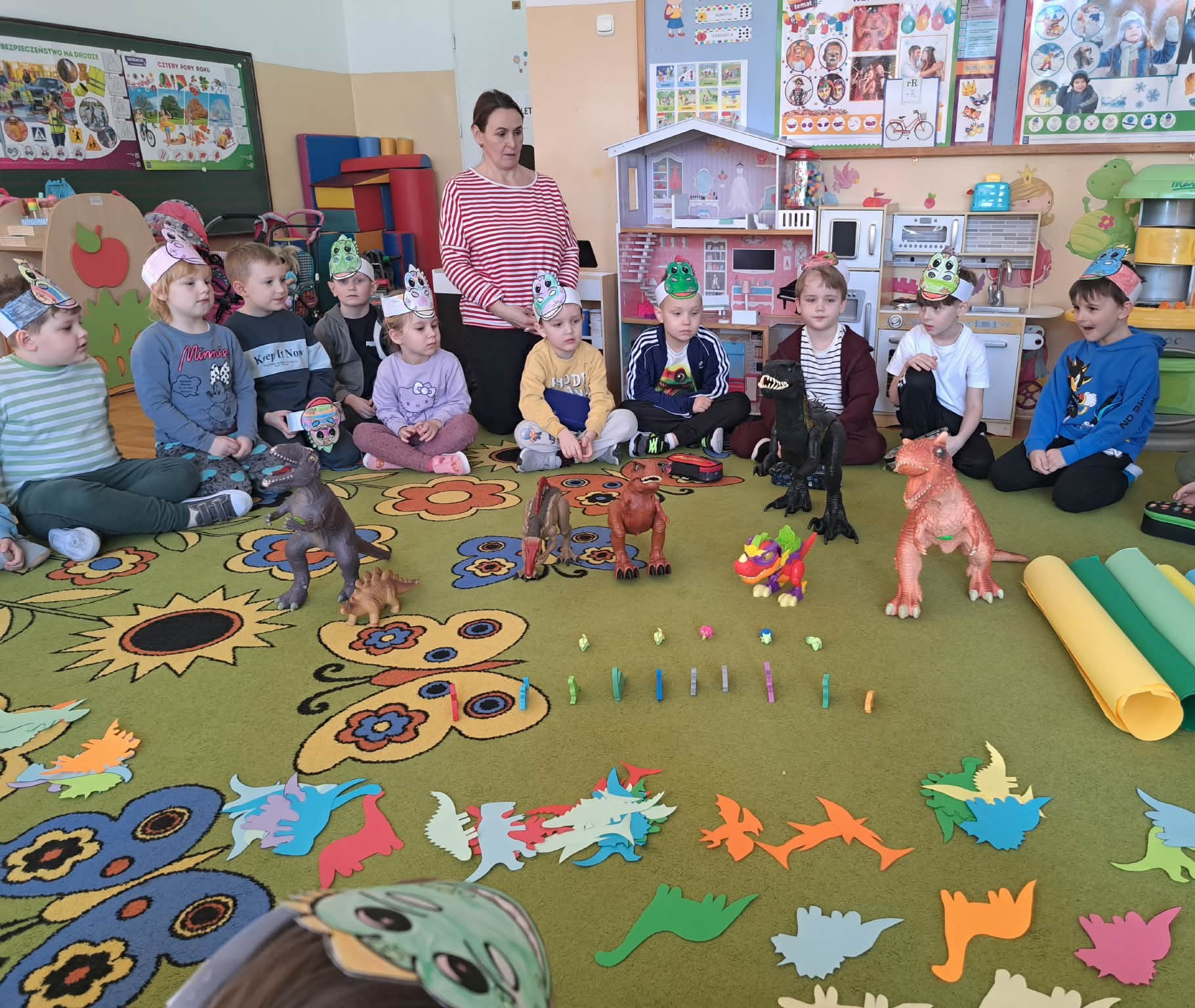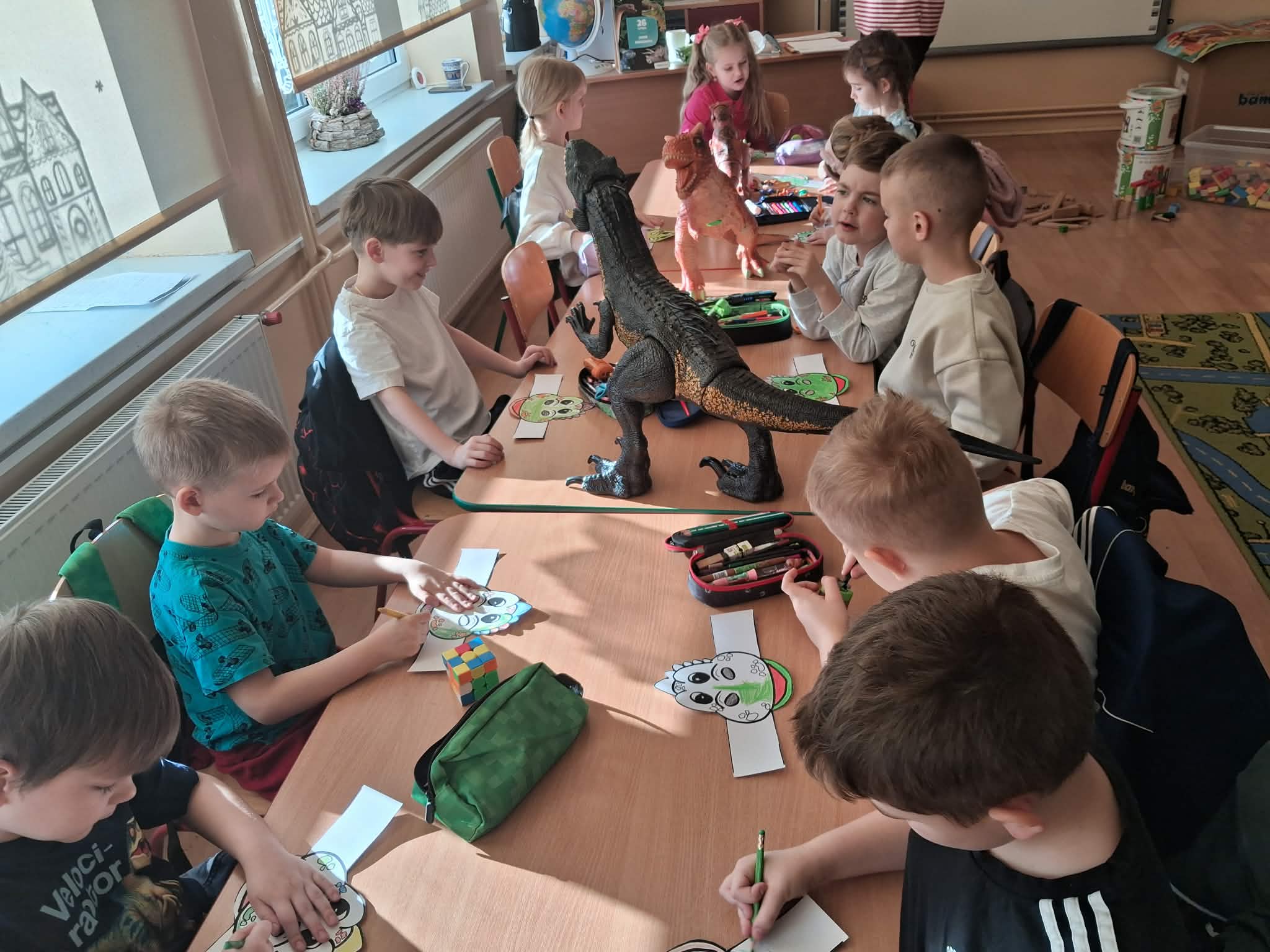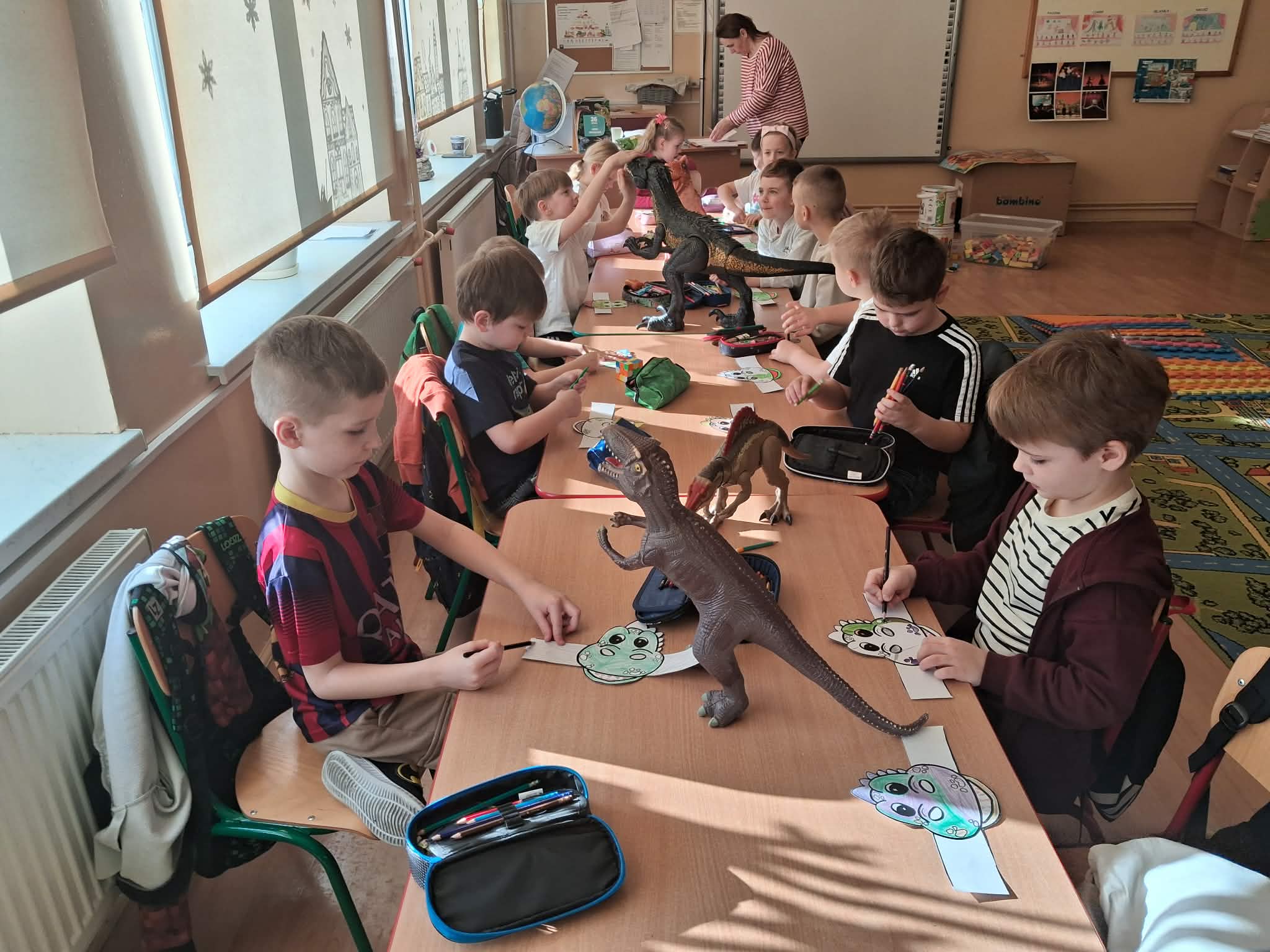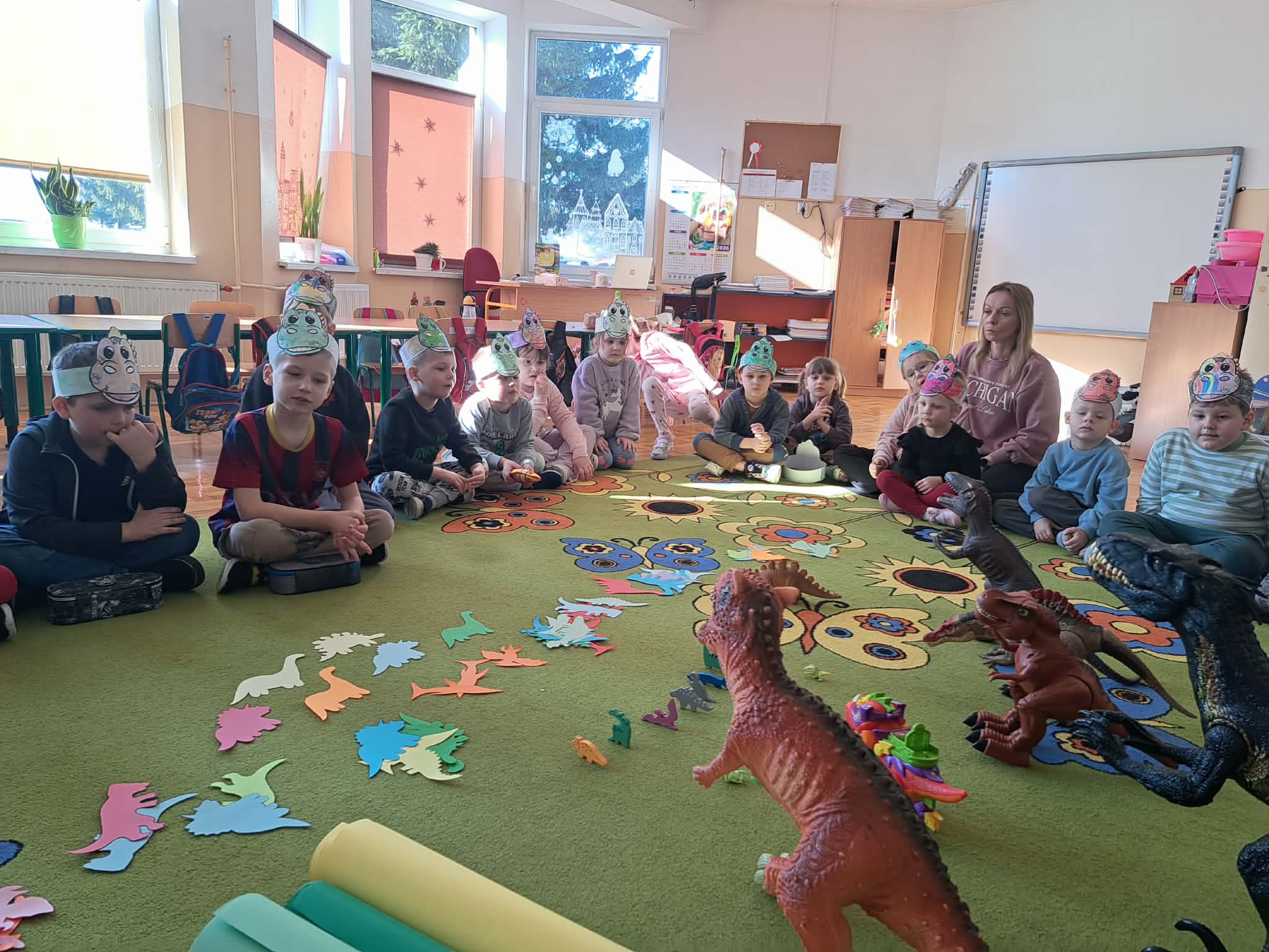W naszych oddziałach przedszkolnych obchodziliśmy wyjątkowe święto – Dzień Dinozaura! Tego dnia sala zamieniła się w prawdziwy prehistoryczny świat pełen ciekawostek, zabawy i odkryć. Dzieci poznały fascynujące informacje o dinozaurach, takich jak Tyrannosaurus rex, Triceratops oraz Stegosaurus. Dowiedziały się, czym się żywiły, jak wyglądały oraz dlaczego wyginęły. Nie zabrakło wspólnego oglądania książek i ilustracji przedstawiających te niezwykłe stworzenia. Przedszkolaki uczestniczyły w wielu kreatywnych aktywnościach – wykonały prace plastyczne w grupach przedstawiające „Świat Dinozaurów” .Ogromną radość sprawiło dzieciom naśladowanie odgłosów i ruchów prehistorycznych gadów, podczas zabawy ruchowej przy piosence „Jakie dinozaury” . Dzień Dinozaura był doskonałą okazją do rozwijania ciekawości świata, poszerzania wiedzy przyrodniczej oraz wspólnej, radosnej zabawy. To był dzień pełen emocji i uśmiechu, który na długo pozostanie w pamięci naszych przedszkolaków!