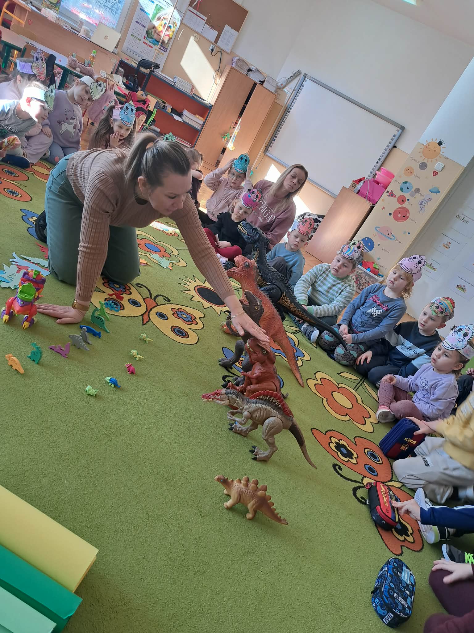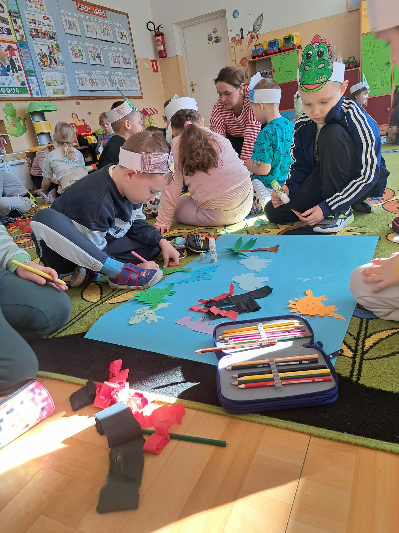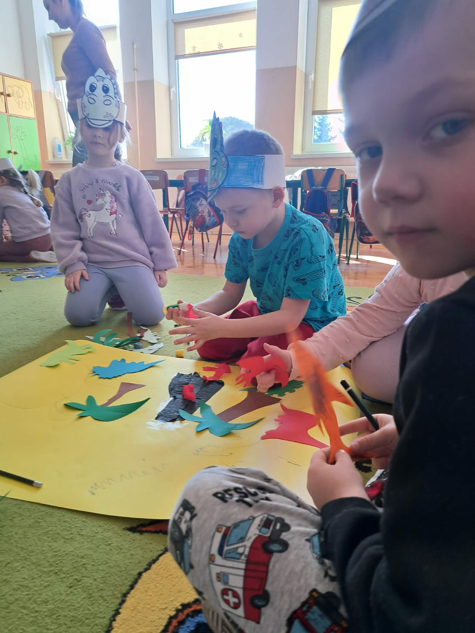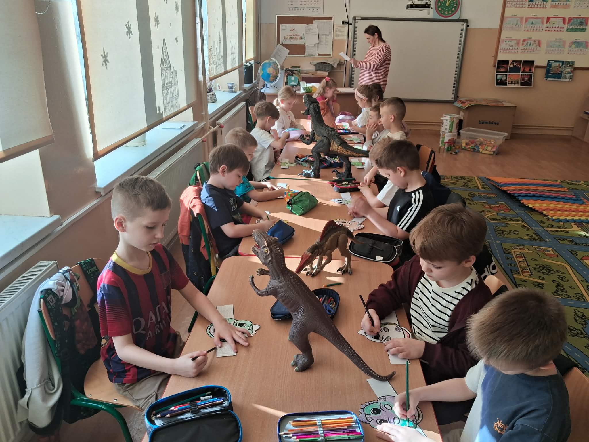 W naszych oddziałach przedszkolnych obchodziliśmy wyjątkowe święto – Dzień Dinozaura! Tego dnia sala zamieniła się w prawdziwy prehistoryczny świat pełen ciekawostek, zabawy i odkryć. Dzieci poznały fascynujące informacje o dinozaurach, takich jak Tyrannosaurus rex, Triceratops oraz Stegosaurus. Dowiedziały się, czym się żywiły, jak wyglądały oraz dlaczego wyginęły. Nie zabrakło wspólnego oglądania książek i ilustracji przedstawiających te niezwykłe stworzenia. Przedszkolaki uczestniczyły w wielu kreatywnych aktywnościach – wykonały prace plastyczne w grupach przedstawiające „Świat Dinozaurów” .Ogromną radość sprawiło dzieciom naśladowanie odgłosów i ruchów prehistorycznych gadów, podczas zabawy ruchowej przy piosence „Jakie dinozaury” . Dzień Dinozaura był doskonałą okazją do rozwijania ciekawości świata, poszerzania wiedzy przyrodniczej oraz wspólnej, radosnej zabawy. To był dzień pełen emocji i uśmiechu, który na długo pozostanie w pamięci naszych przedszkolaków!