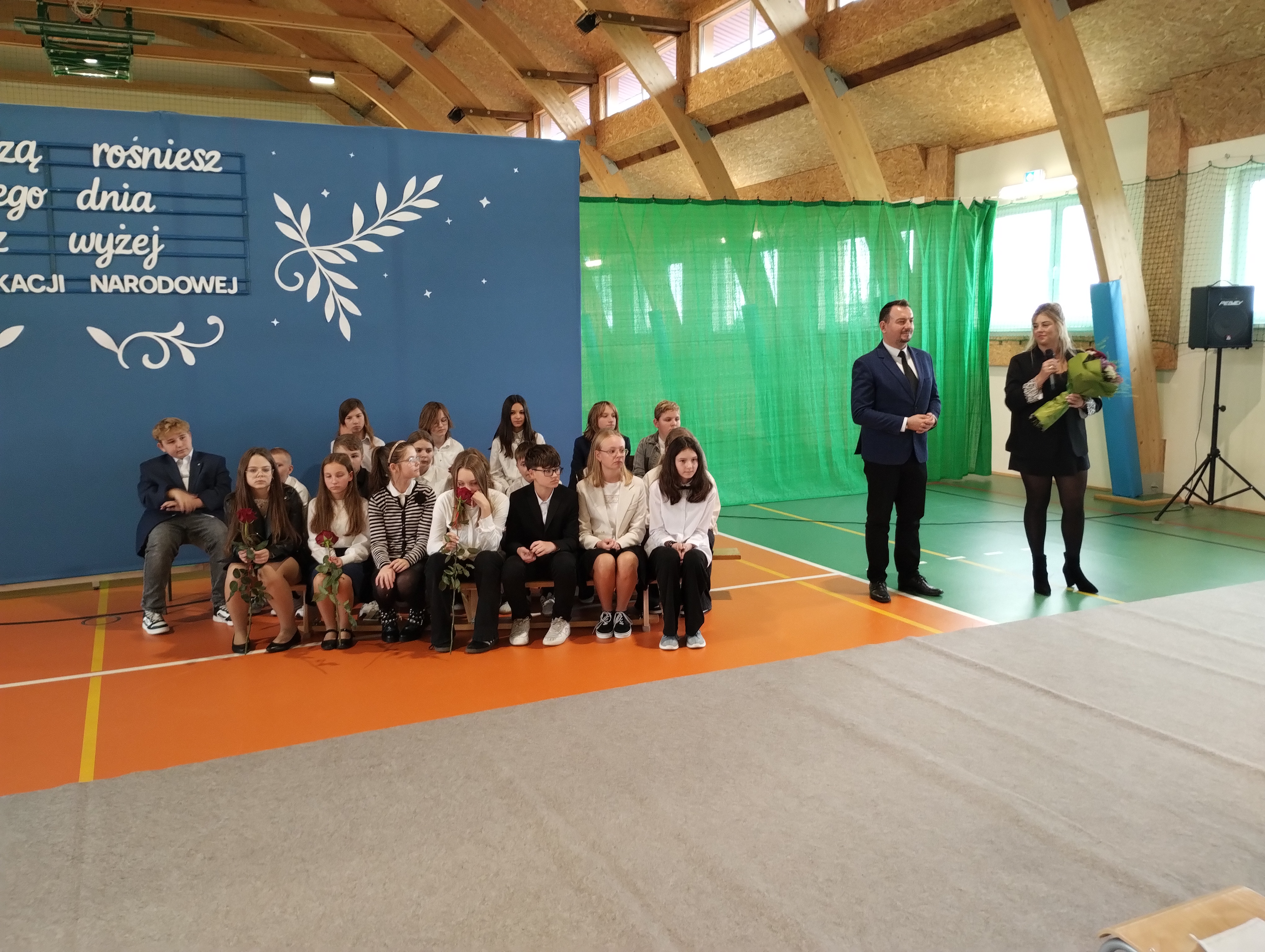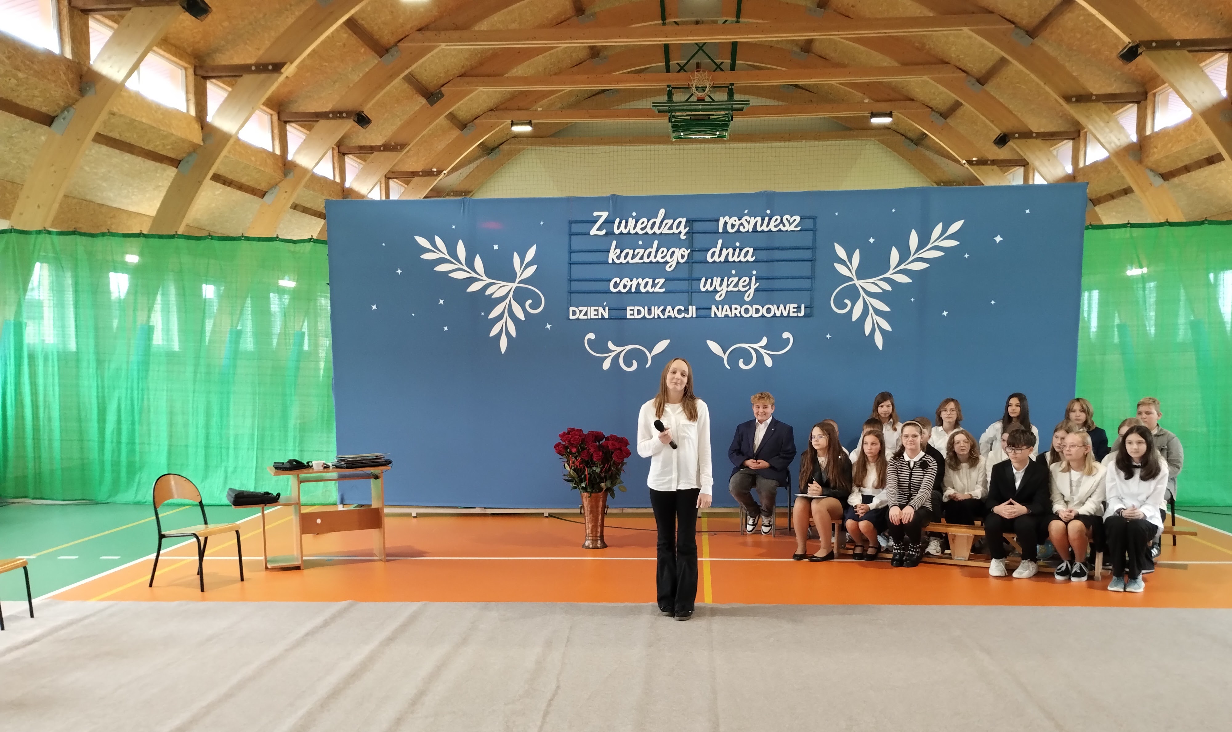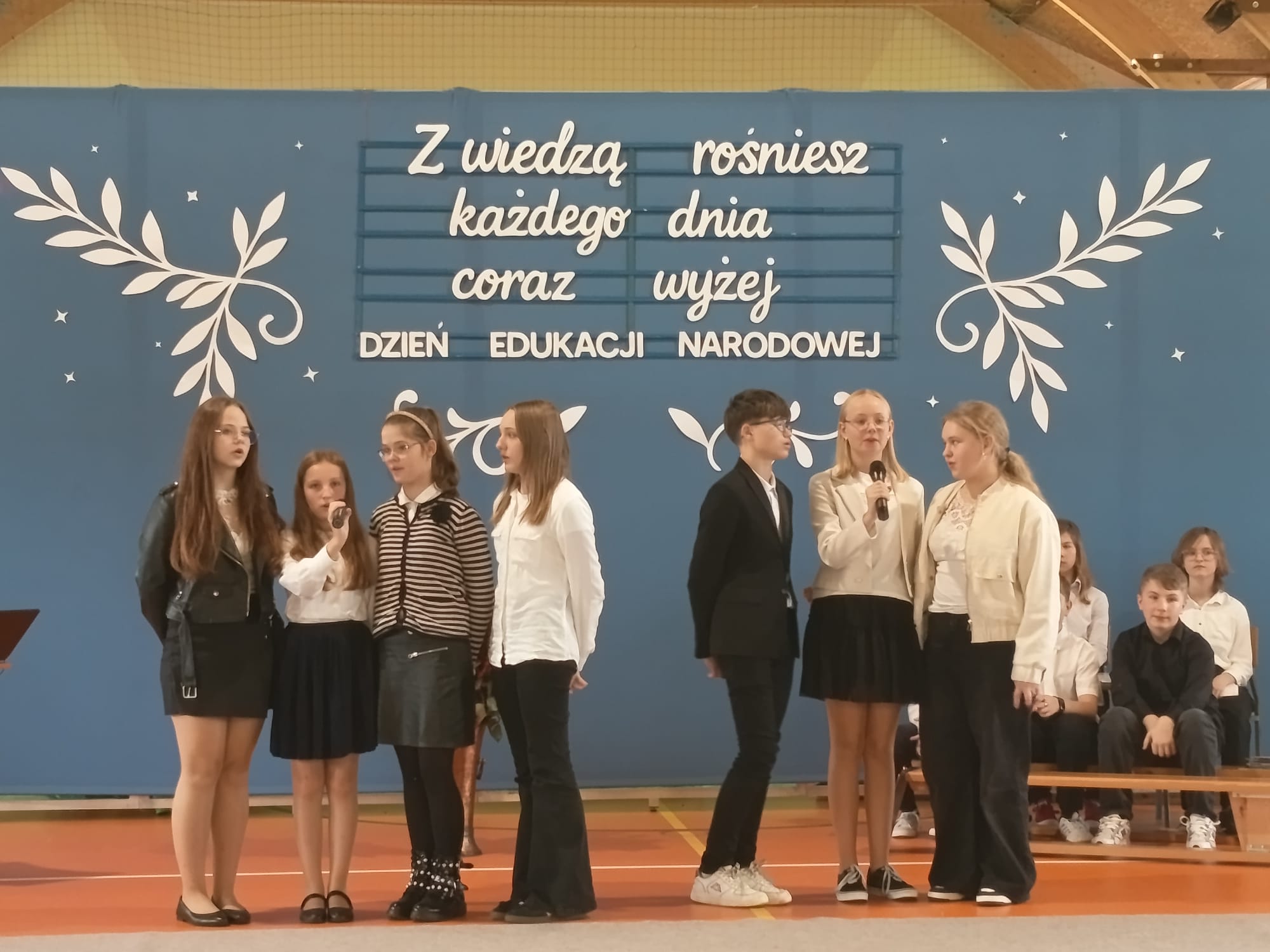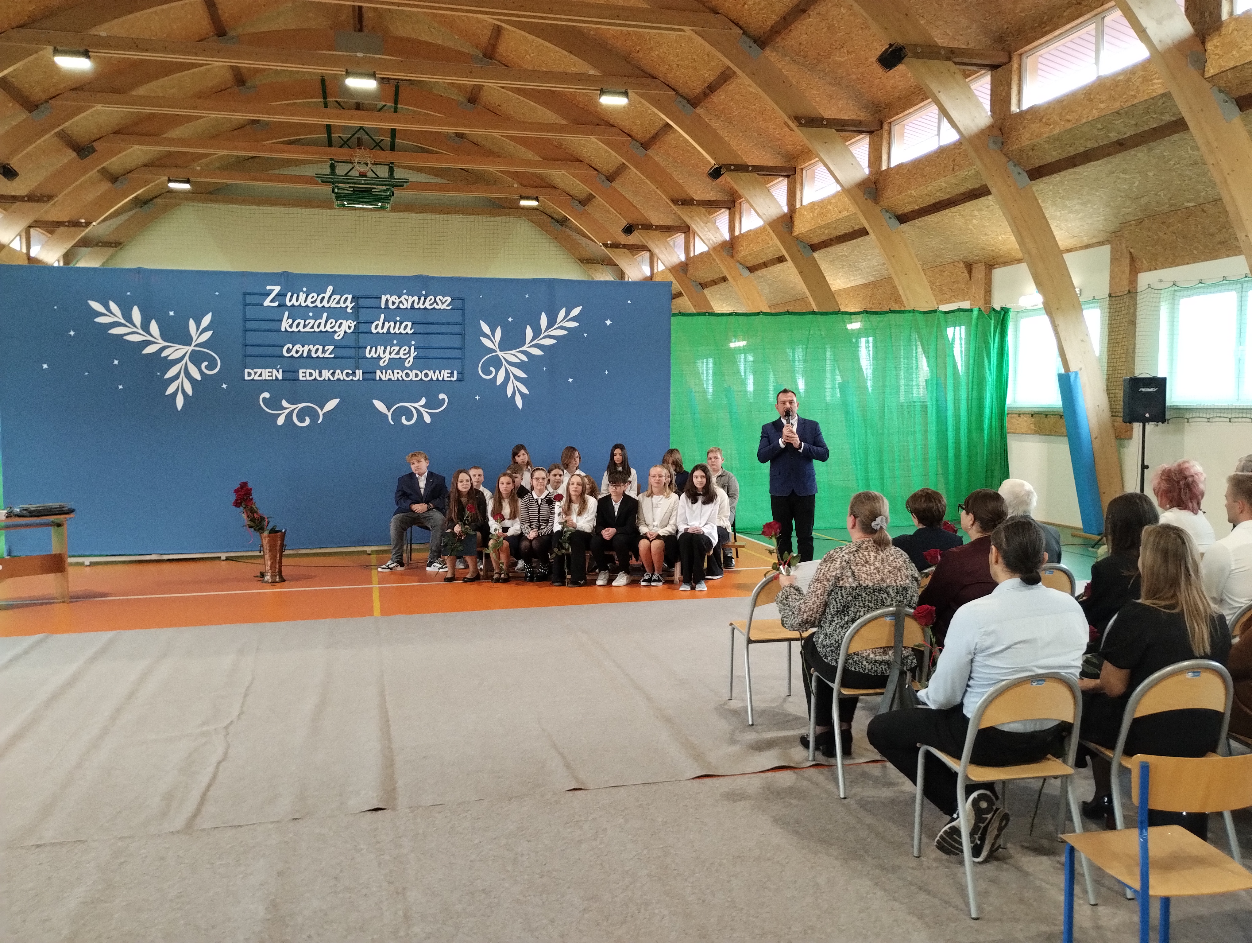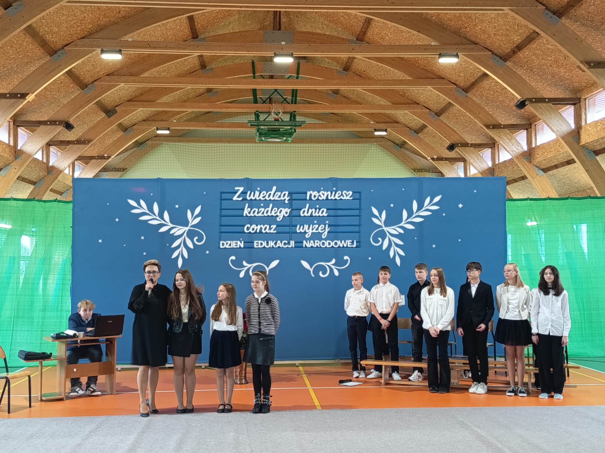 17 października 2025 roku w naszej szkole odbyła się uroczystość z okazji Dnia Edukacji Narodowej. W wydarzeniu wzięli udział uczniowie, nauczyciele, pracownicy szkoły oraz zaproszeni goście – w tym emerytowani nauczyciele i pracownicy naszej placówki. Uczniowie przygotowali i zaprezentowali humorystyczne przedstawienie, które przeplatane było wierszami i piosenkami. Występ dostarczył wszystkim wielu wzruszeń i uśmiechu, a młodzi artyści zostali nagrodzeni gromkimi brawami. Pan Dyrektor Sylwester Ziomek złożył serdeczne życzenia wszystkim nauczycielom i pracownikom oświaty, dziękując im za codzienny trud, zaangażowanie i serce wkładane w wychowanie młodego pokolenia. Głos zabrał również zaproszony gość – były dyrektor szkoły, Pan Kazimierz Rojek, który skierował do zebranych ciepłe słowa i wspomnienia związane z pracą w naszej szkole. W imieniu Rady Rodziców, Pani Paulina Siemiątkowska, przewodnicząca Rady, złożyła nauczycielom i pracownikom życzenia z okazji ich święta oraz przekazała na ręce Pana Dyrektora piękne kwiaty jako wyraz wdzięczności i uznania za pracę pedagogiczną.