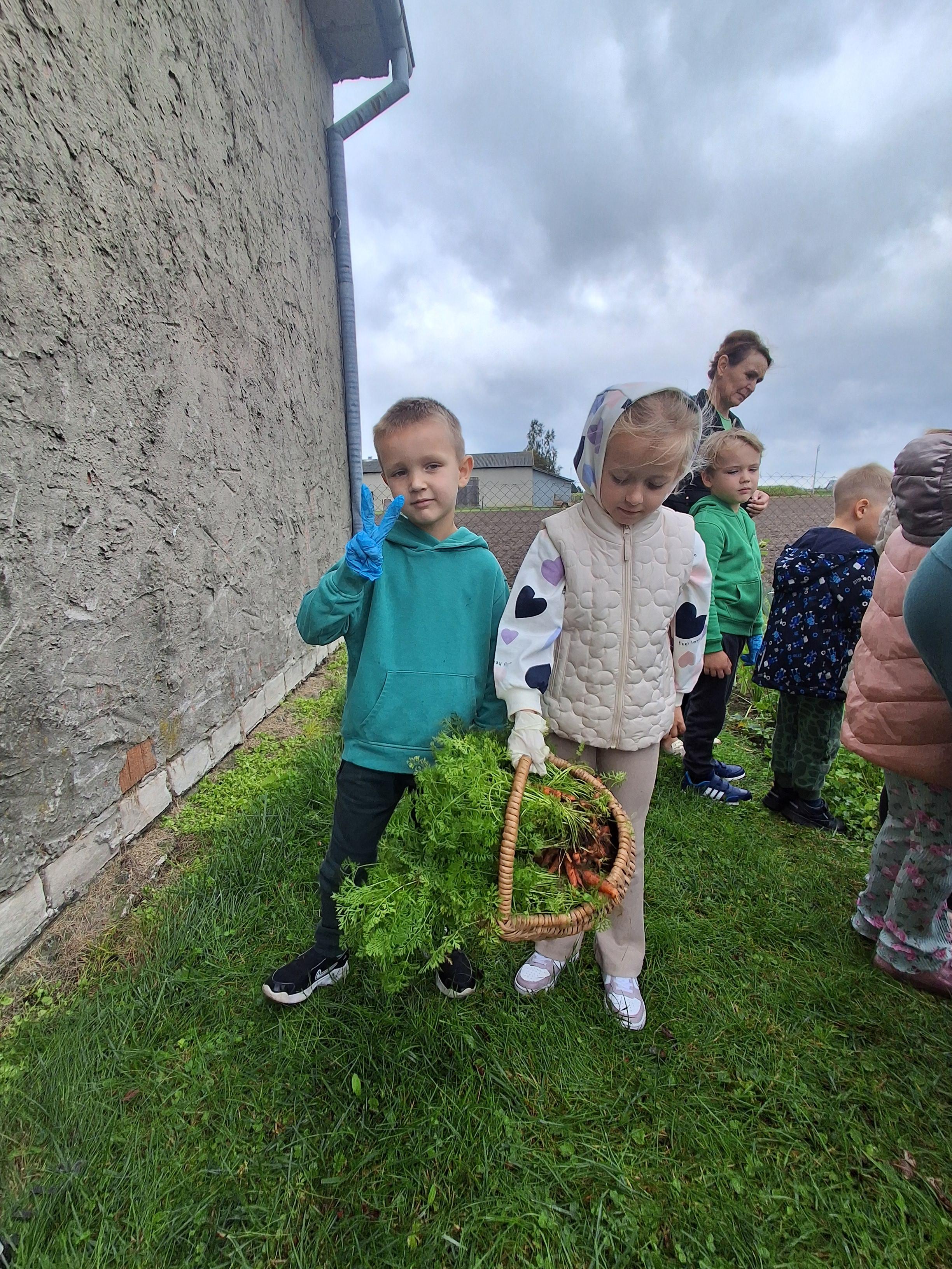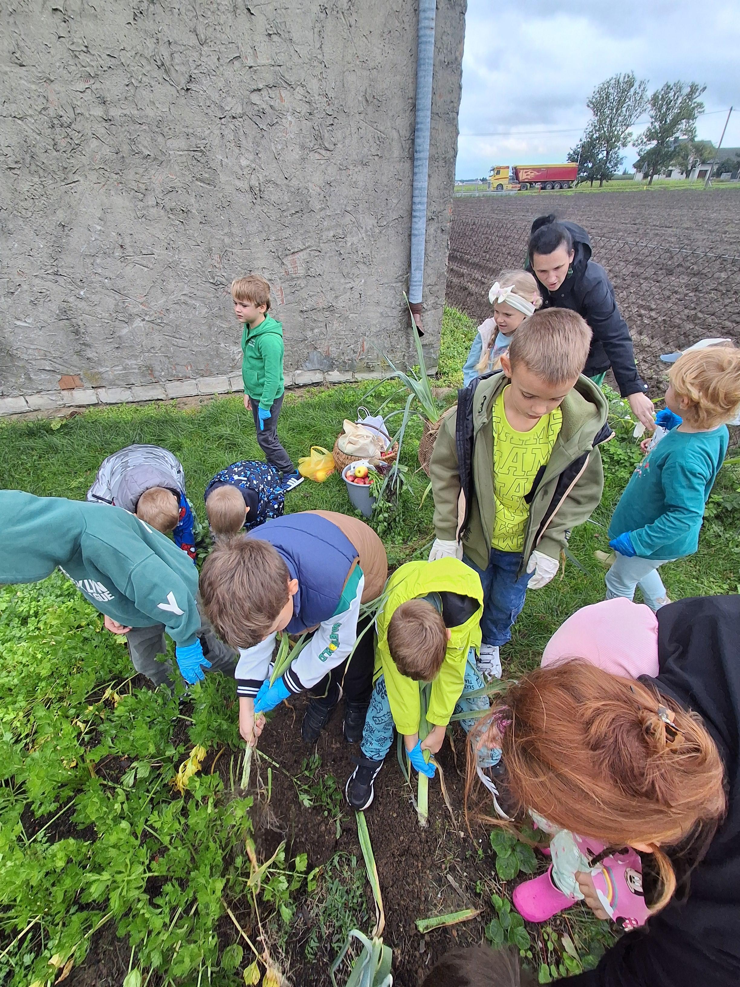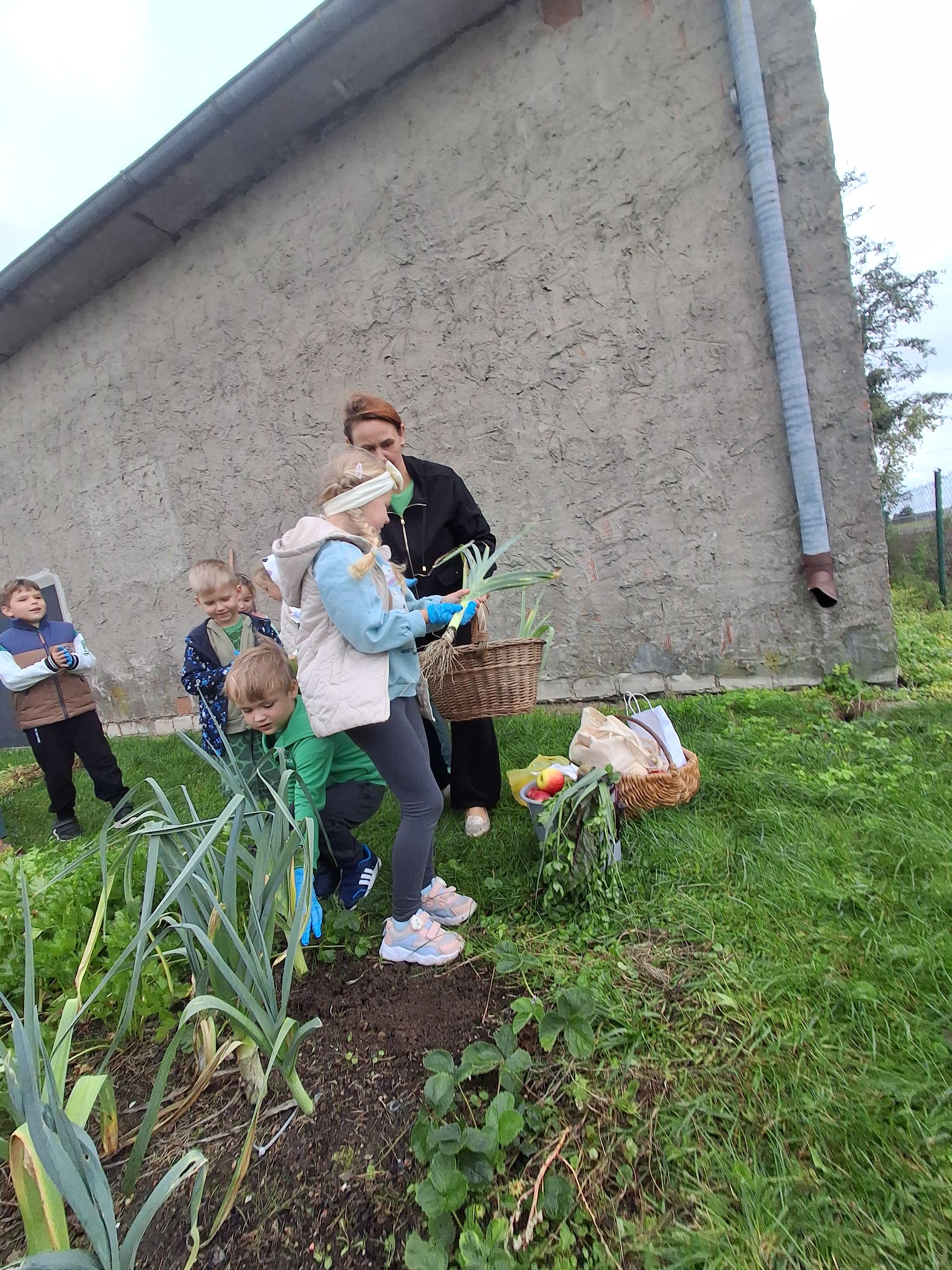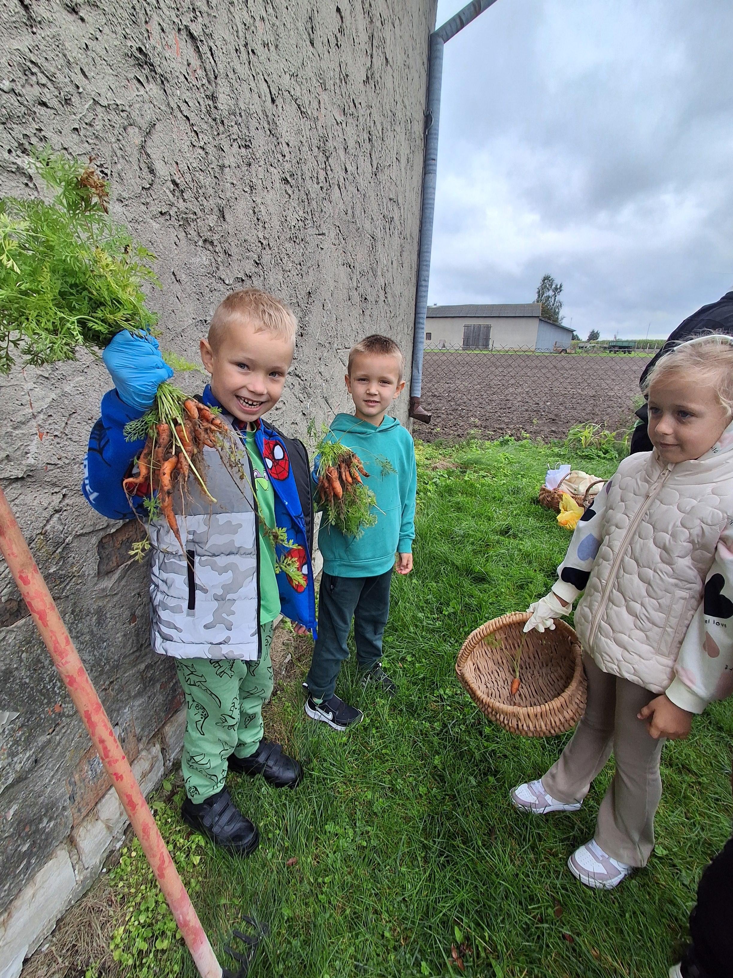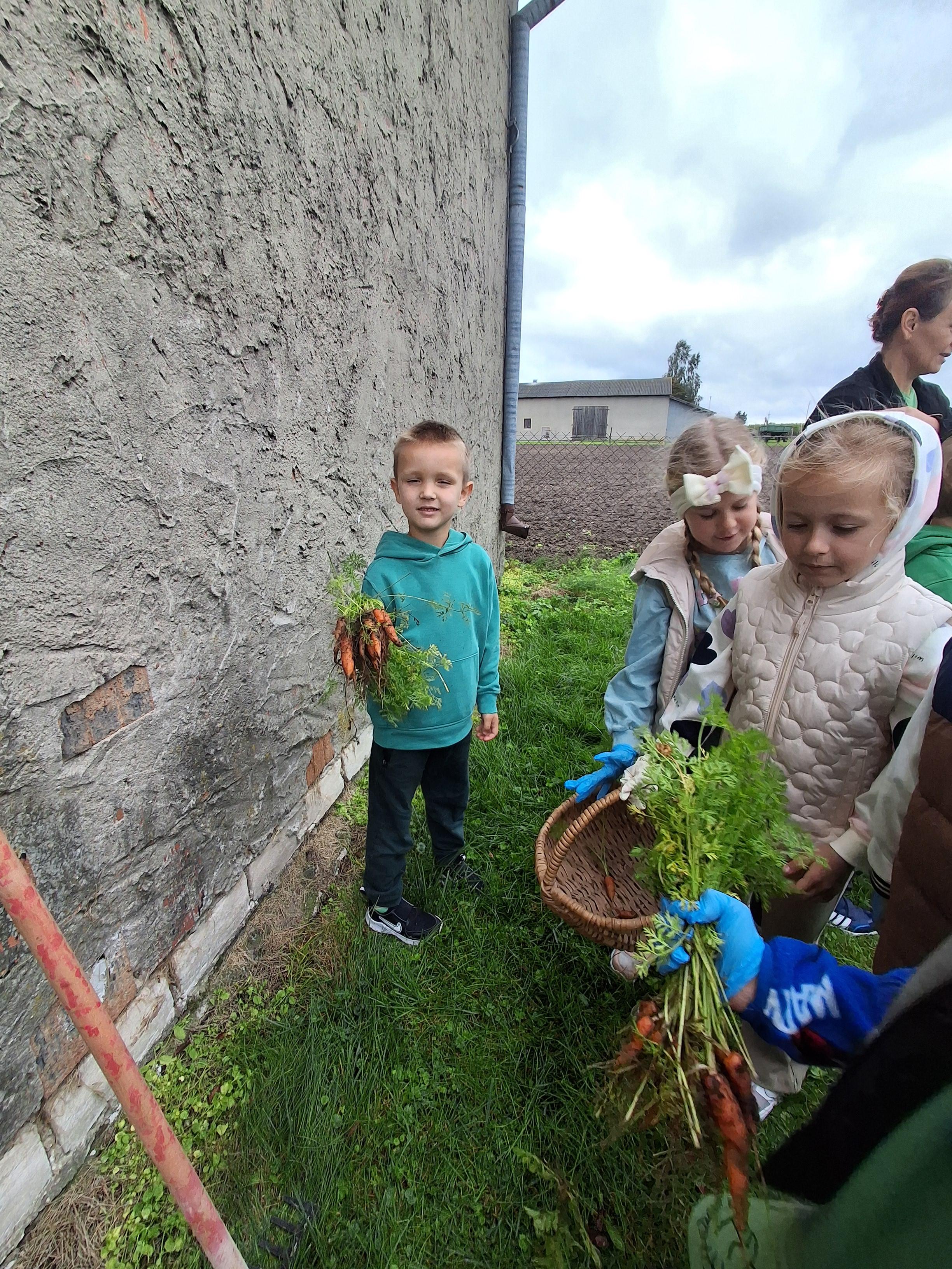 Przedszkolaki z wielkim zaangażowaniem wykopywały warzywa, które urosły latem – marchewki, buraki i pietruszkę, selery i pory. Była to dla nich świetna zabawa, a jednocześnie nauka, skąd biorą się zdrowe warzywa. Dzieci z radością zbierały plony i z dumą układały je w koszykach.