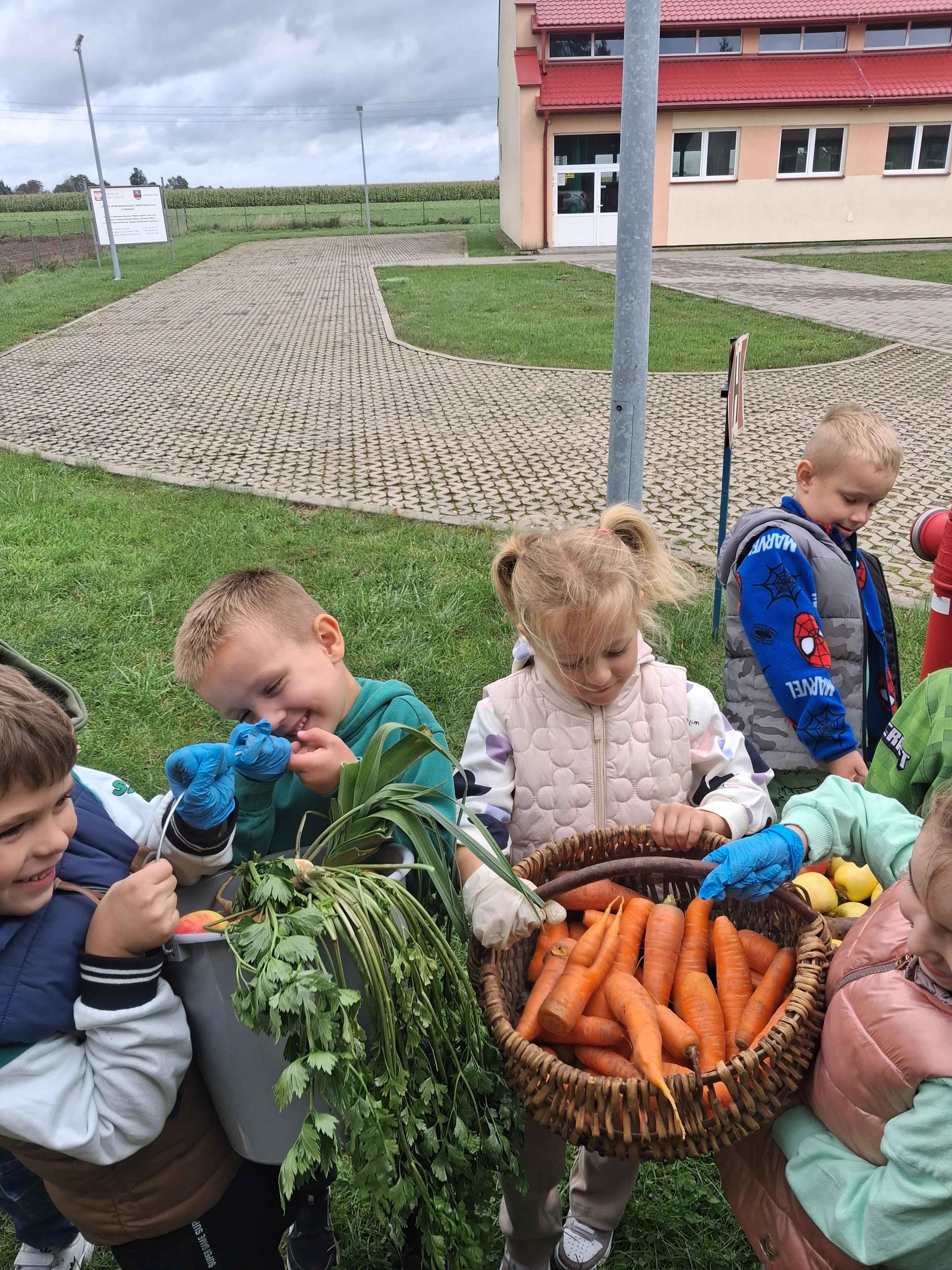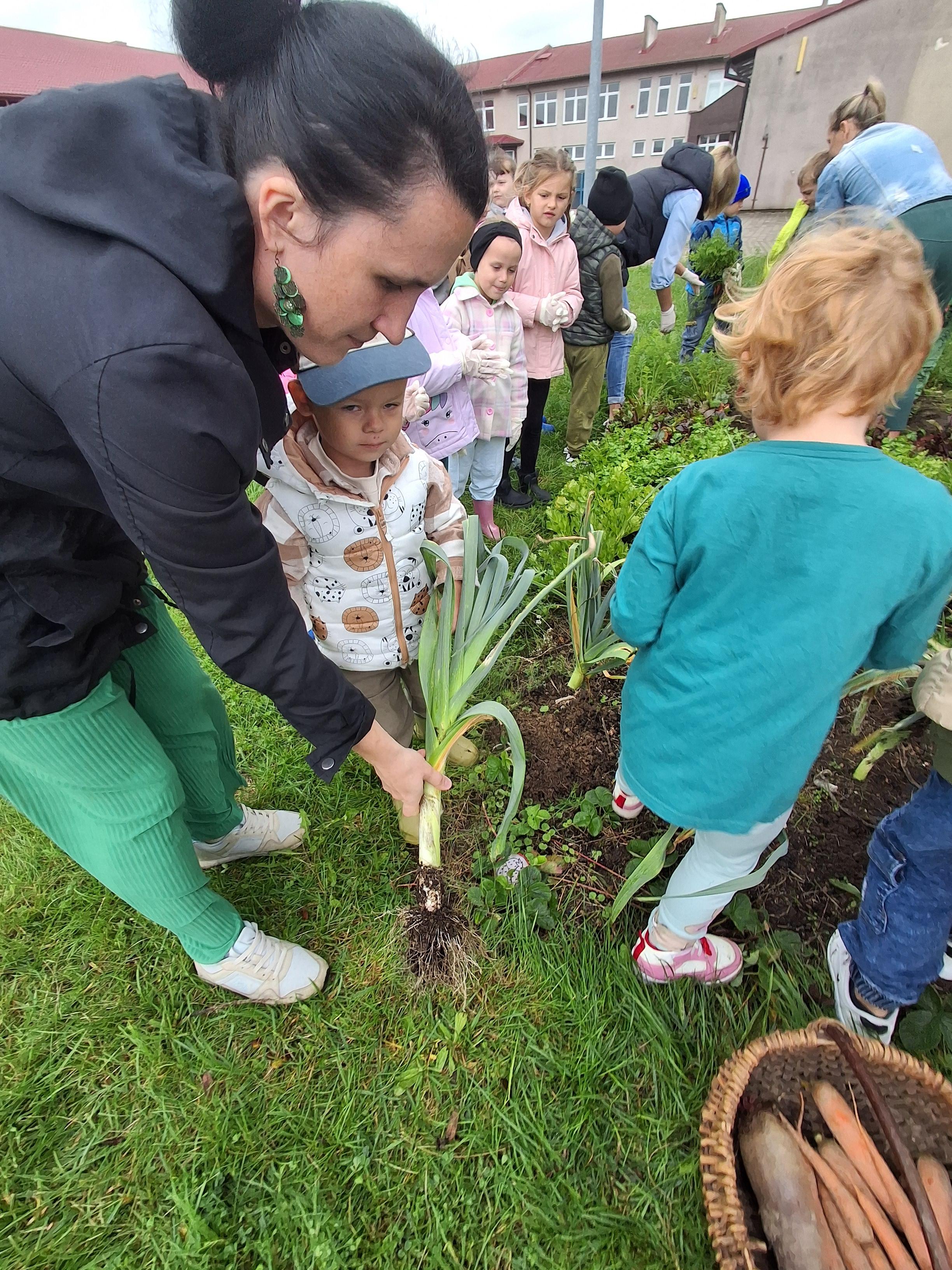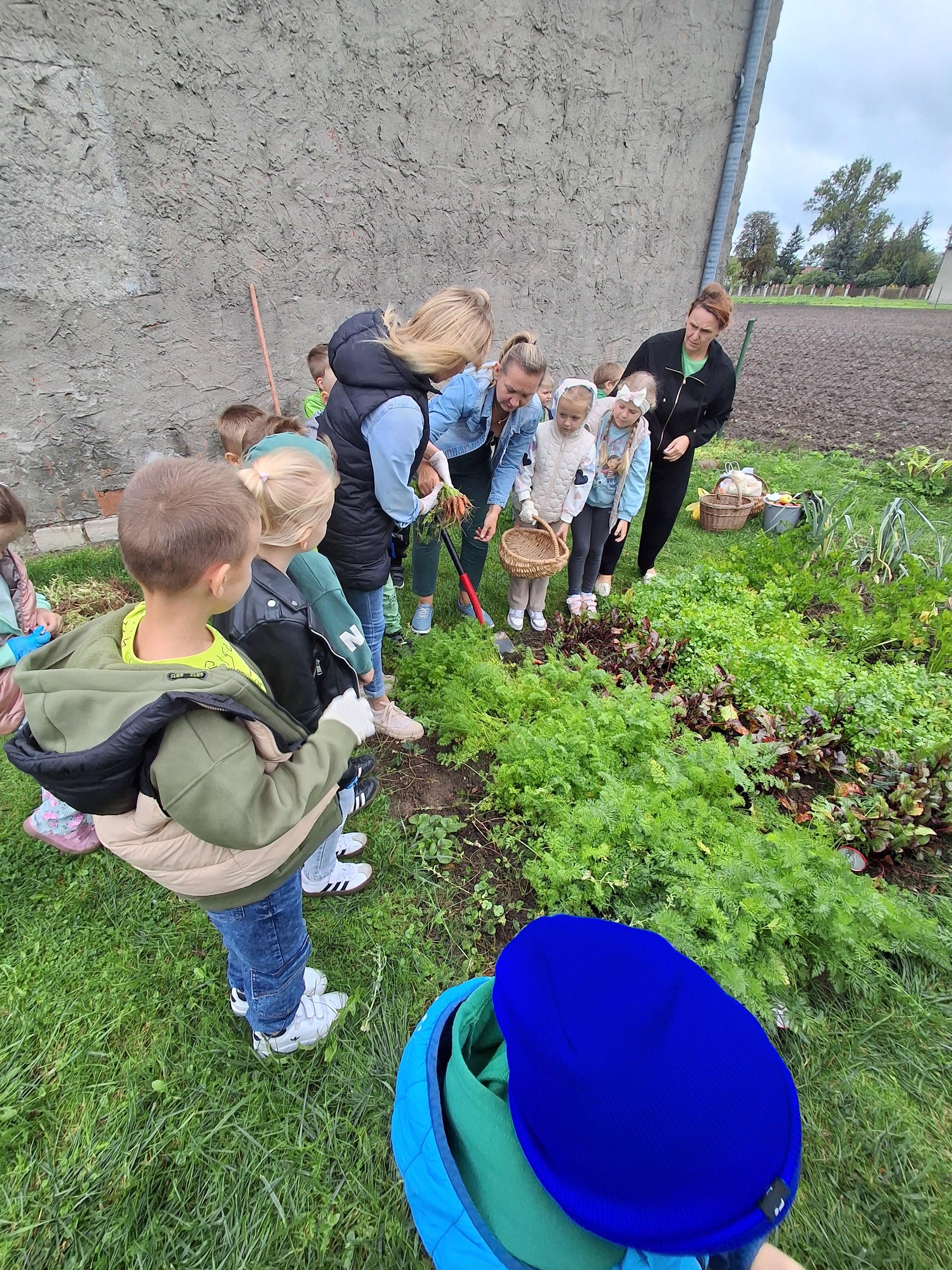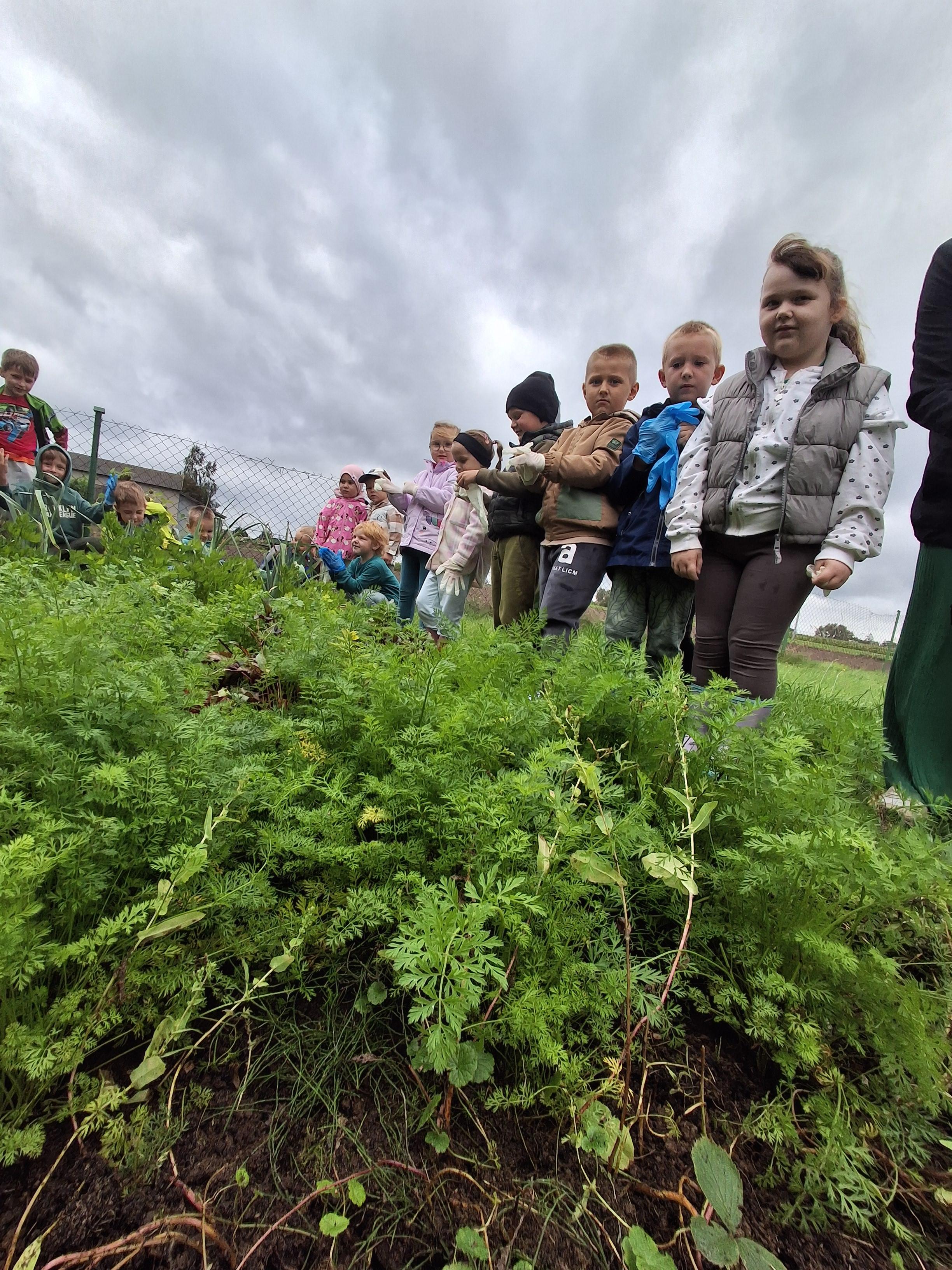 Przedszkolaki z wielkim zaangażowaniem wykopywały warzywa, które urosły latem – marchewki, buraki i pietruszkę, selery i pory. Była to dla nich świetna zabawa, a jednocześnie nauka, skąd biorą się zdrowe warzywa. Dzieci z radością zbierały plony i z dumą układały je w koszykach.