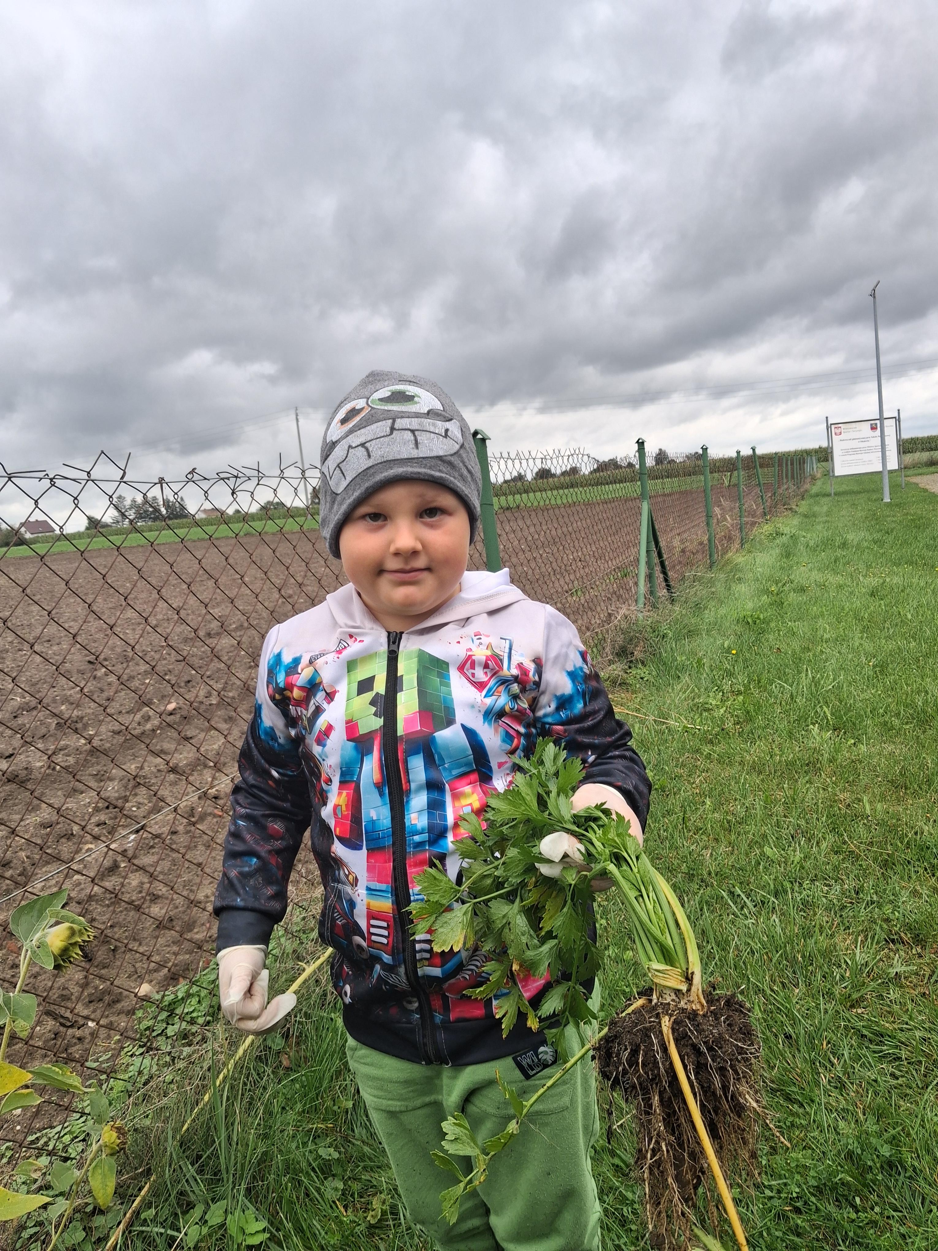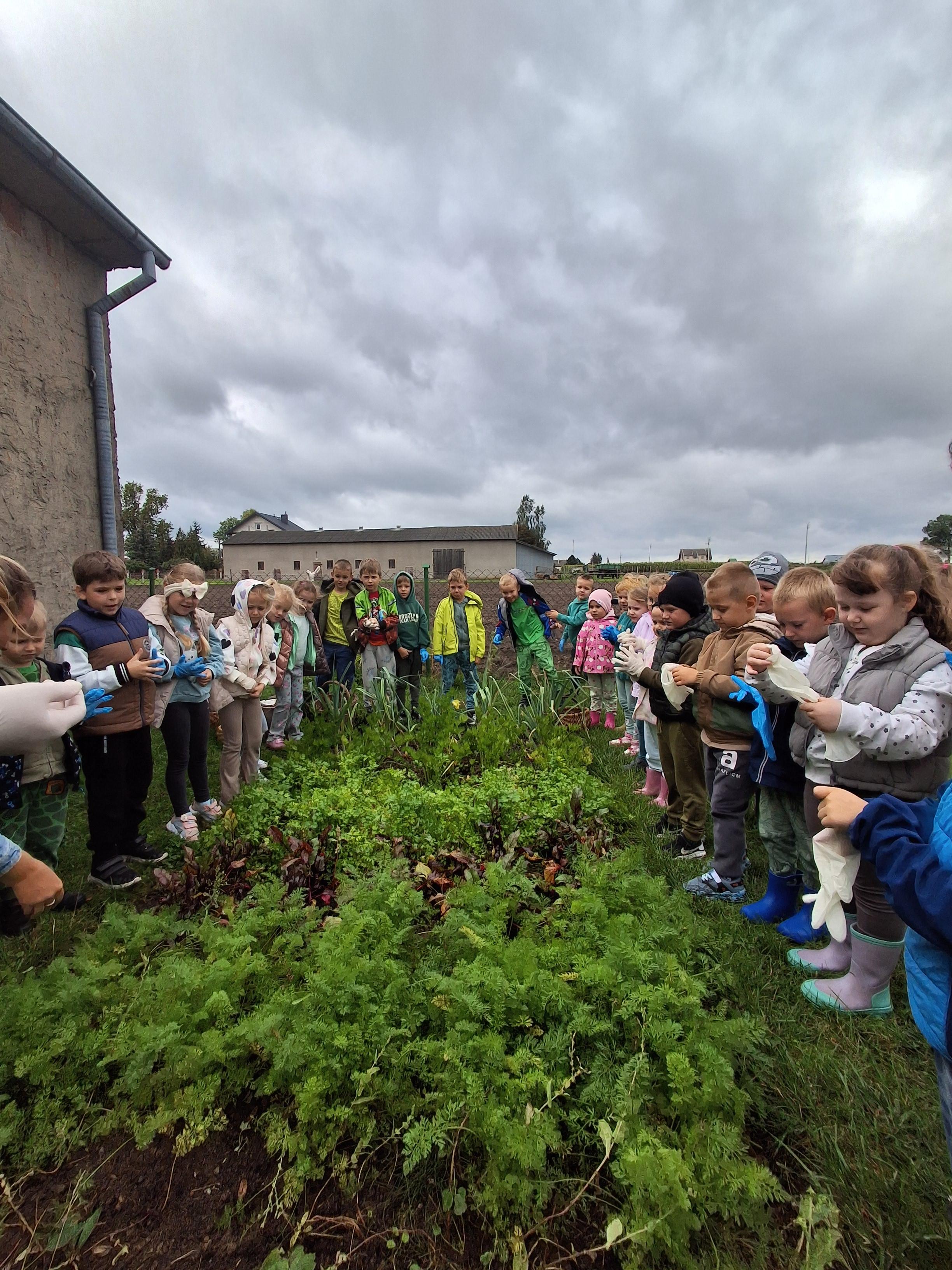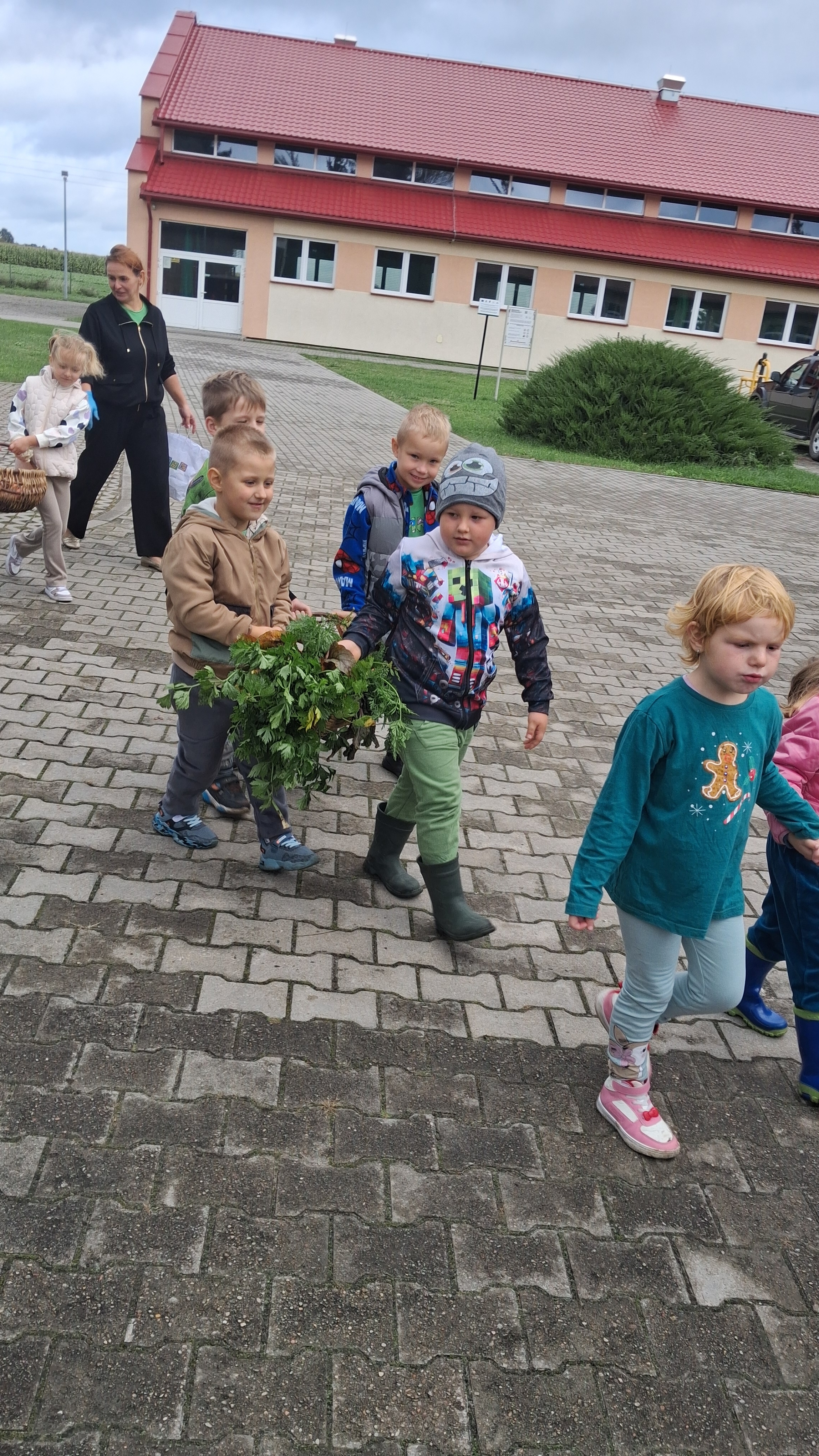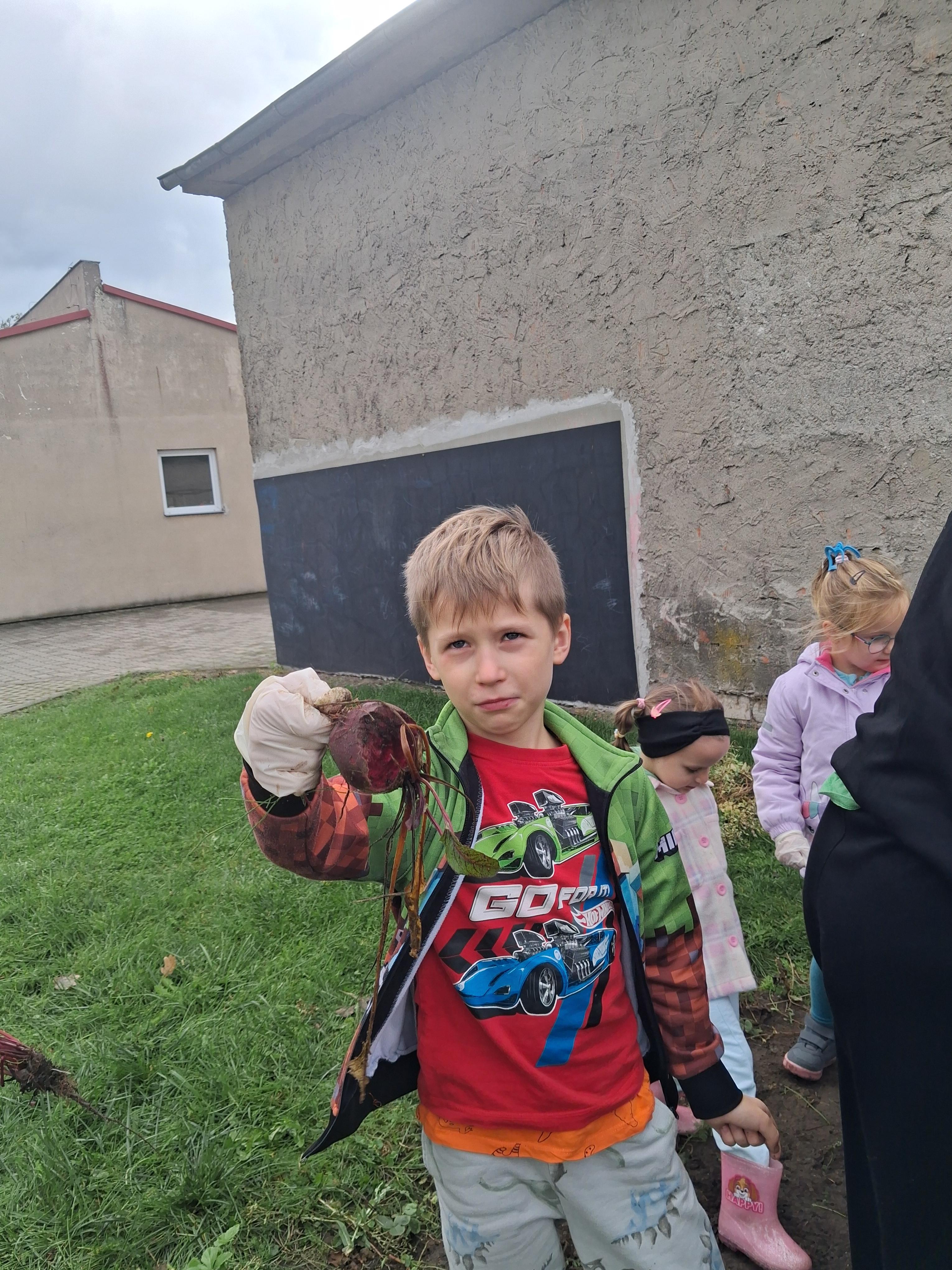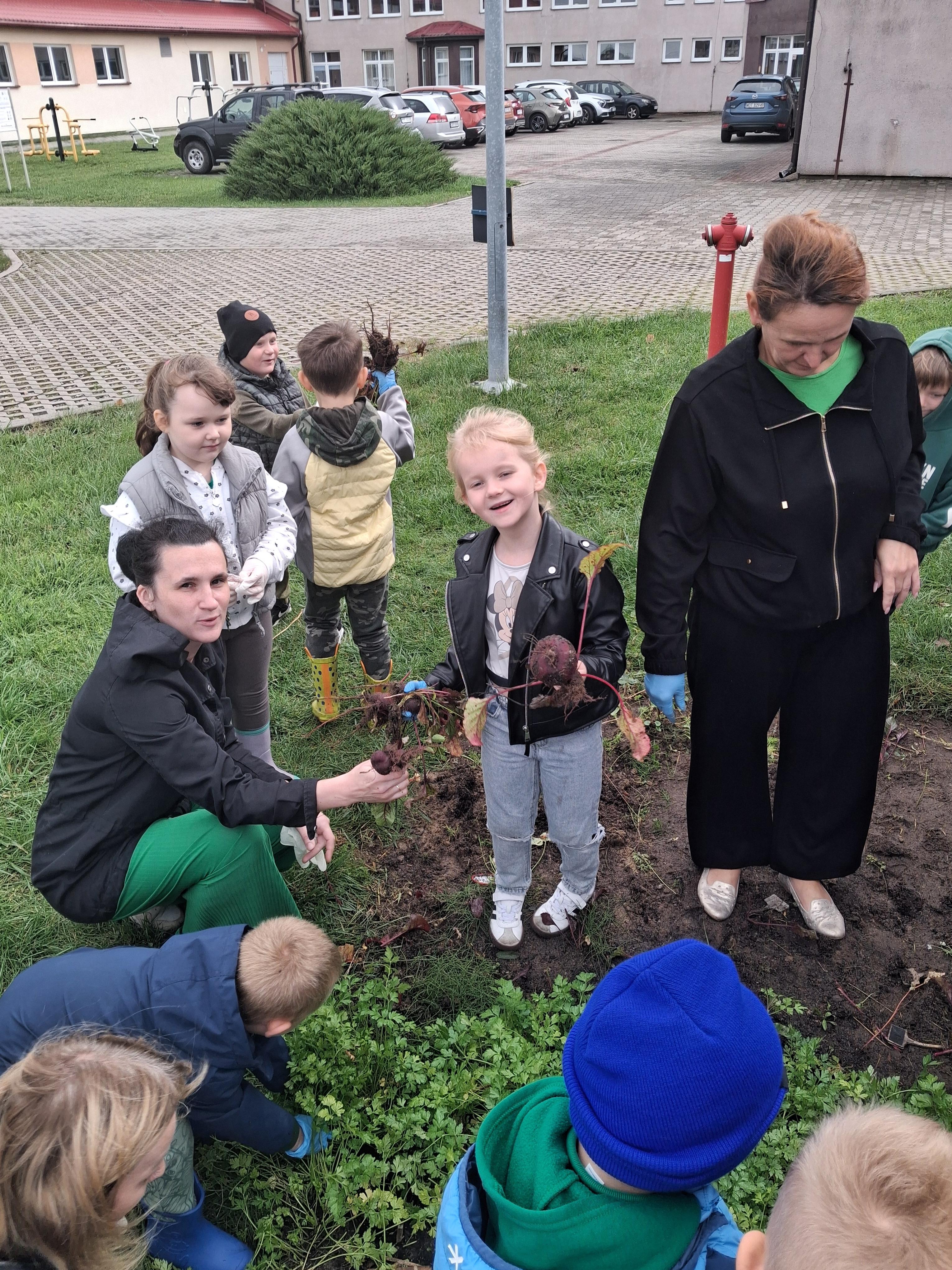 Przedszkolaki z wielkim zaangażowaniem wykopywały warzywa, które urosły latem – marchewki, buraki i pietruszkę, selery i pory. Była to dla nich świetna zabawa, a jednocześnie nauka, skąd biorą się zdrowe warzywa. Dzieci z radością zbierały plony i z dumą układały je w koszykach.