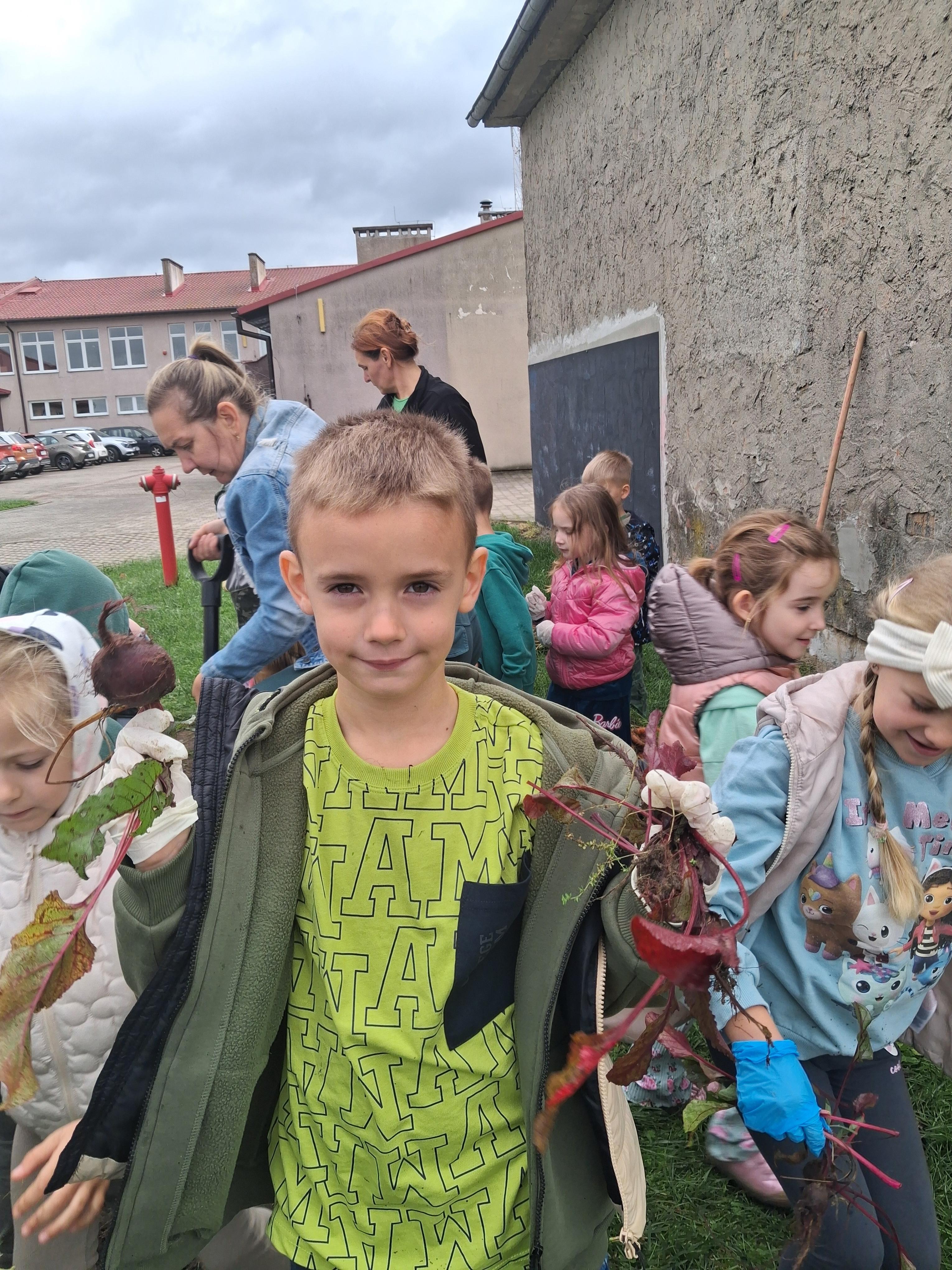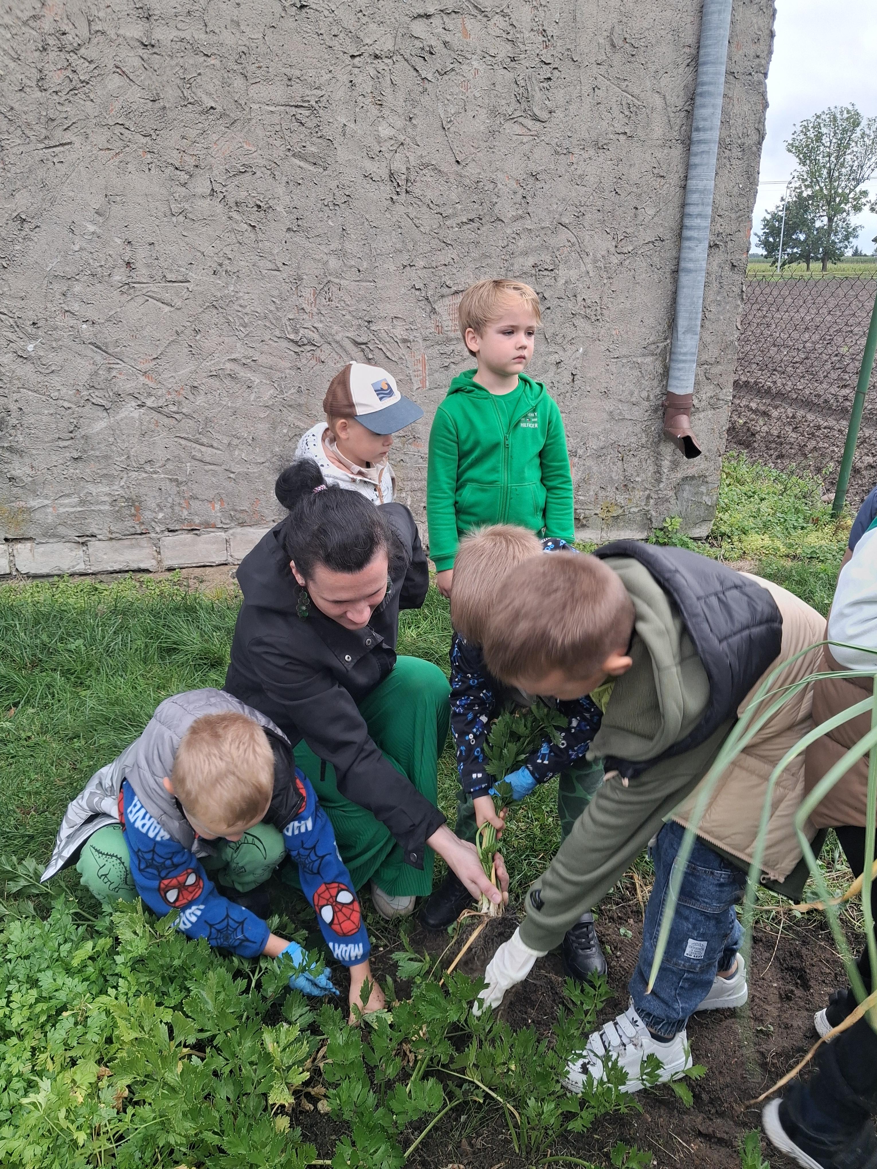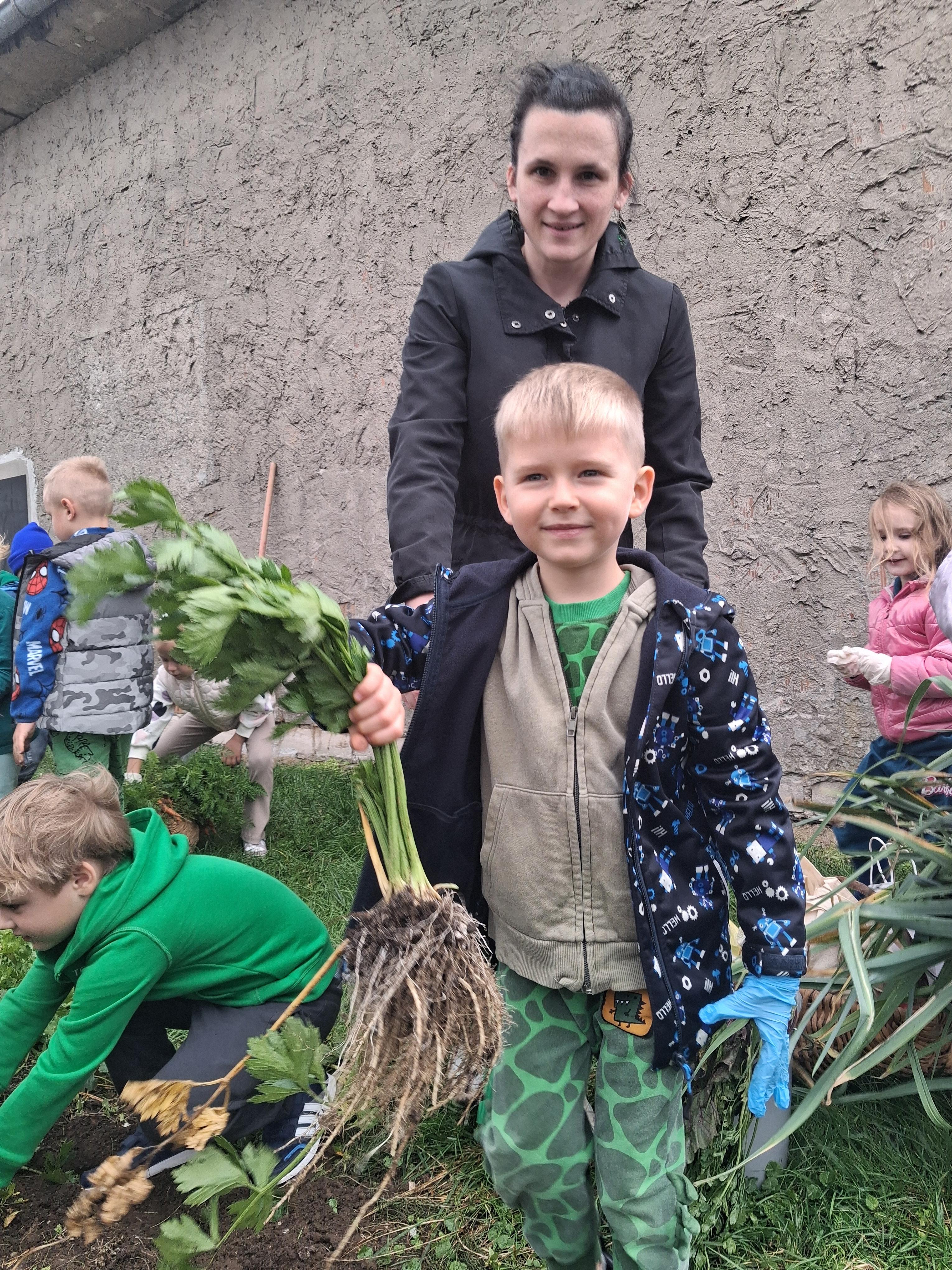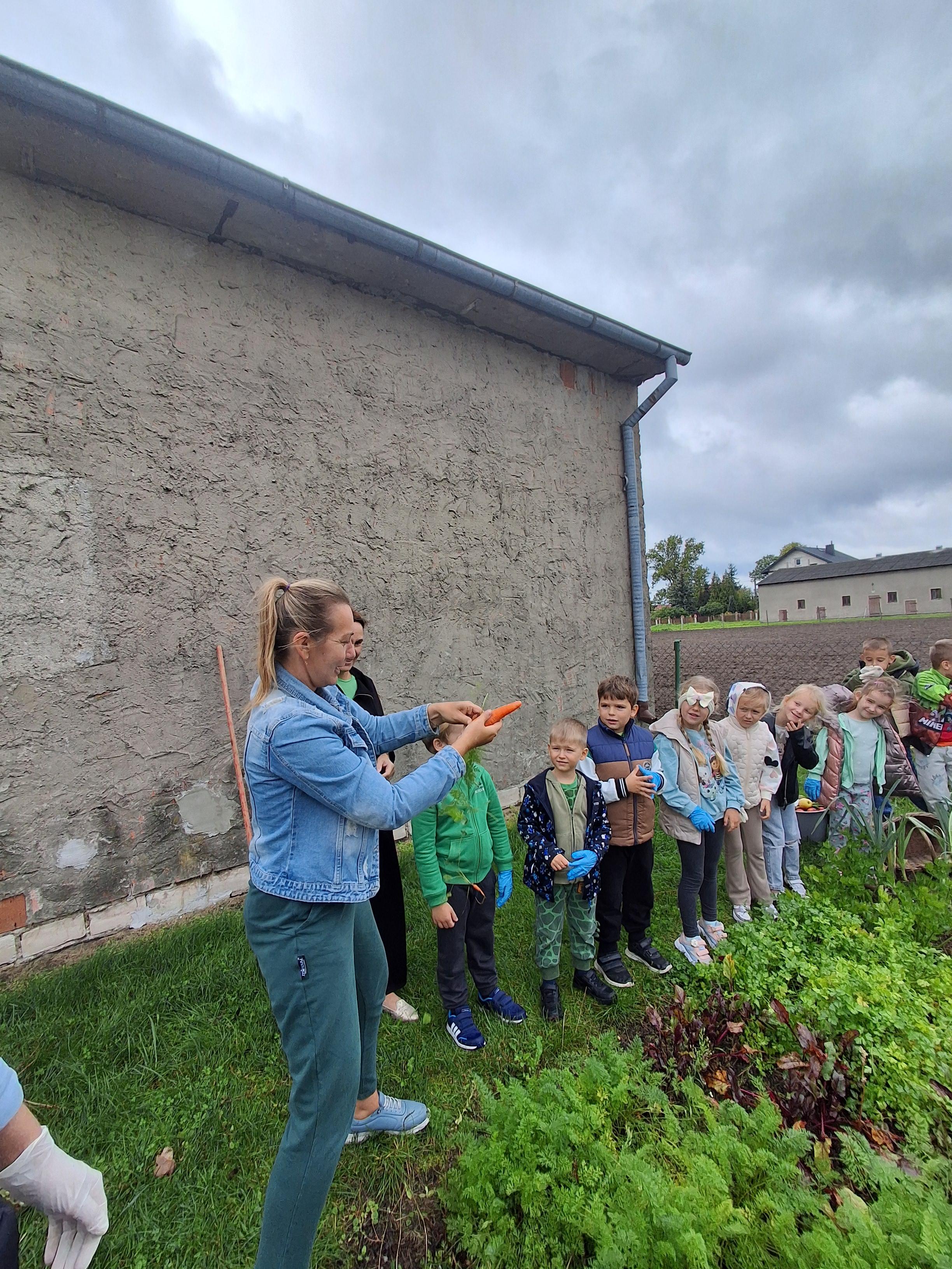 Przedszkolaki z wielkim zaangażowaniem wykopywały warzywa, które urosły latem – marchewki, buraki i pietruszkę, selery i pory. Była to dla nich świetna zabawa, a jednocześnie nauka, skąd biorą się zdrowe warzywa. Dzieci z radością zbierały plony i z dumą układały je w koszykach.