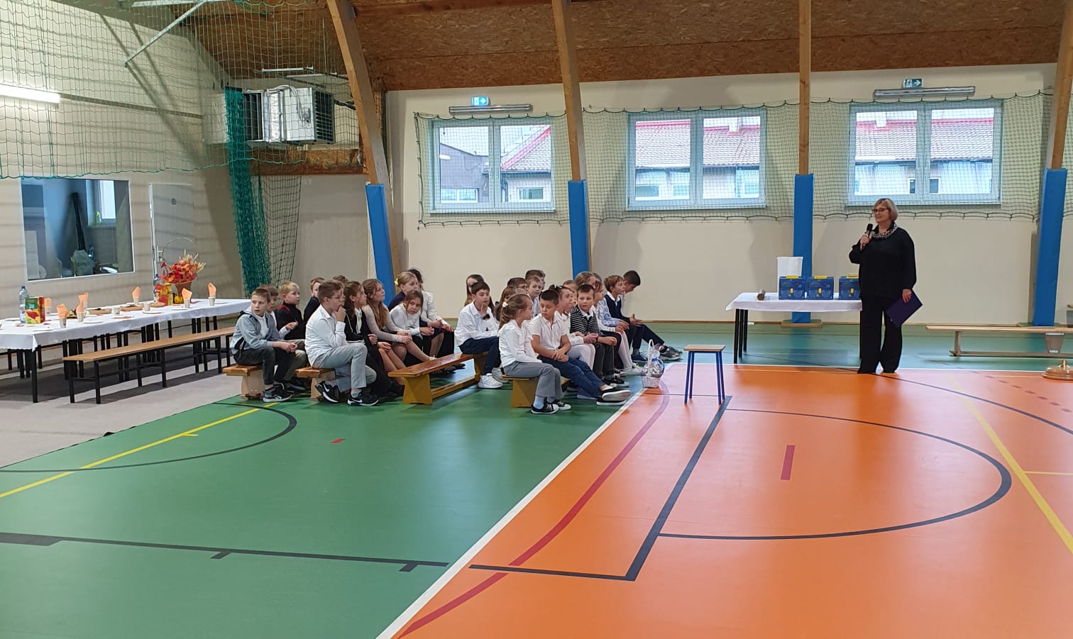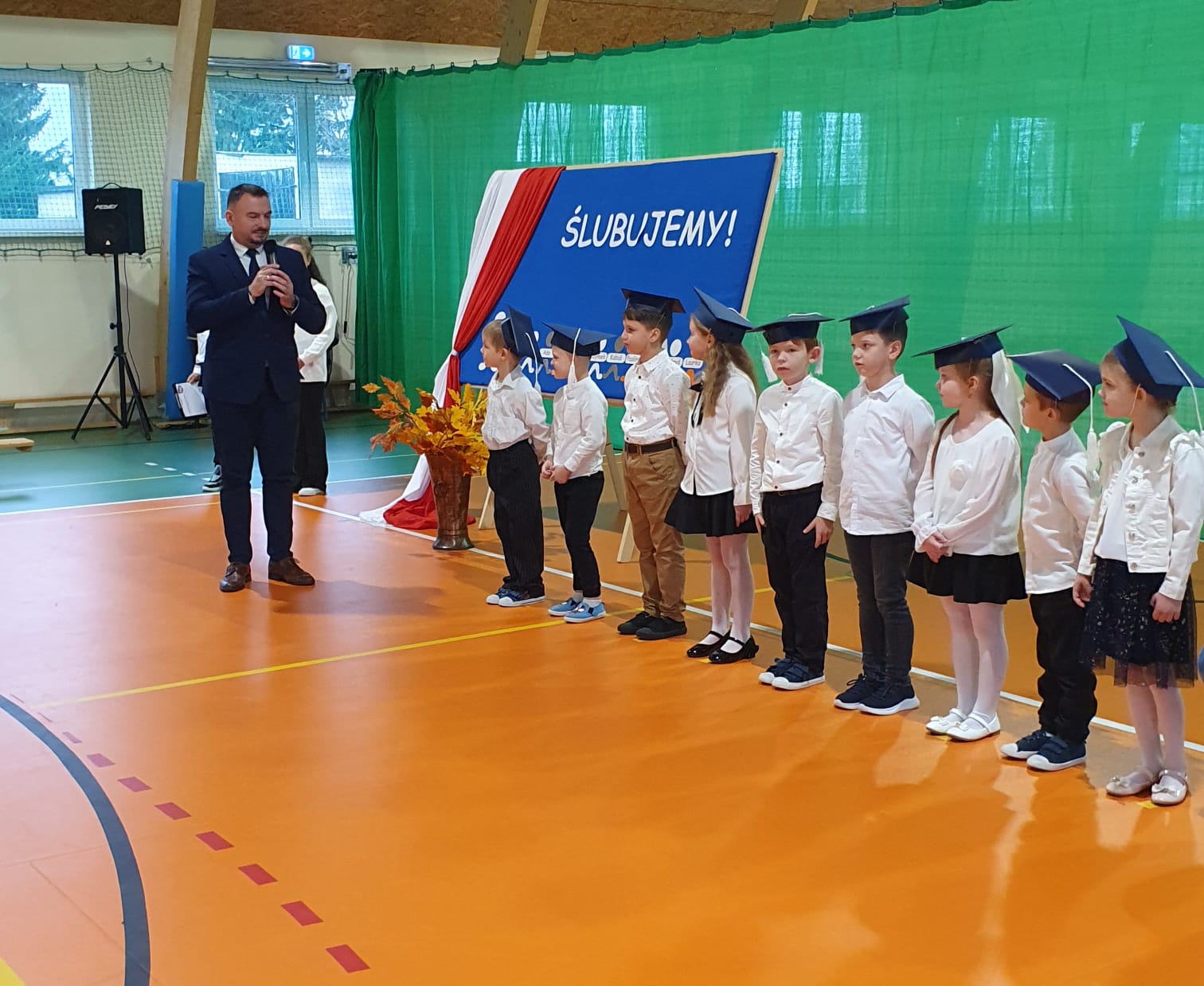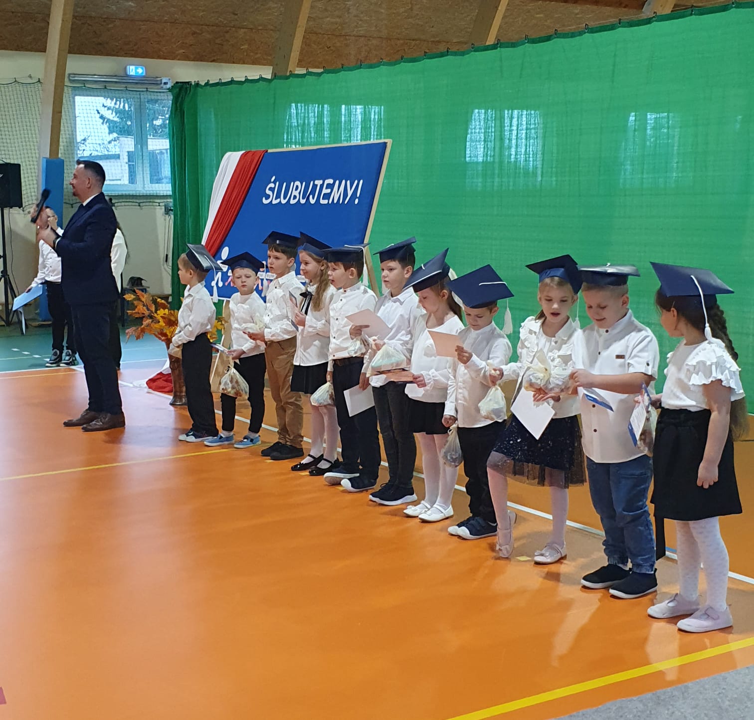 Dnia 24 października 2025 roku w naszej szkole odbyło się uroczyste Ślubowanie uczniów klasy pierwszej. W tym wyjątkowym wydarzeniu, oprócz pierwszaków i ich wychowawczyni, pani Katarzyny Żuchowskiej, udział wzięli zaproszeni goście: pani Paulina Siemiątkowska, rodzice oraz wychowawczynie klasy II i III — pani Małgorzata Kalinowska i pani Beata Krajewska — wraz ze swoimi wychowankami. Gości powitała pani wychowawczyni, po czym dzieci zaprezentowały przygotowaną część artystyczną. Głos zabrał również Dyrektor Szkoły, pan Sylwester Ziomek, który rozpoczął uroczystość, cytując słowa Isaaca Newtona: