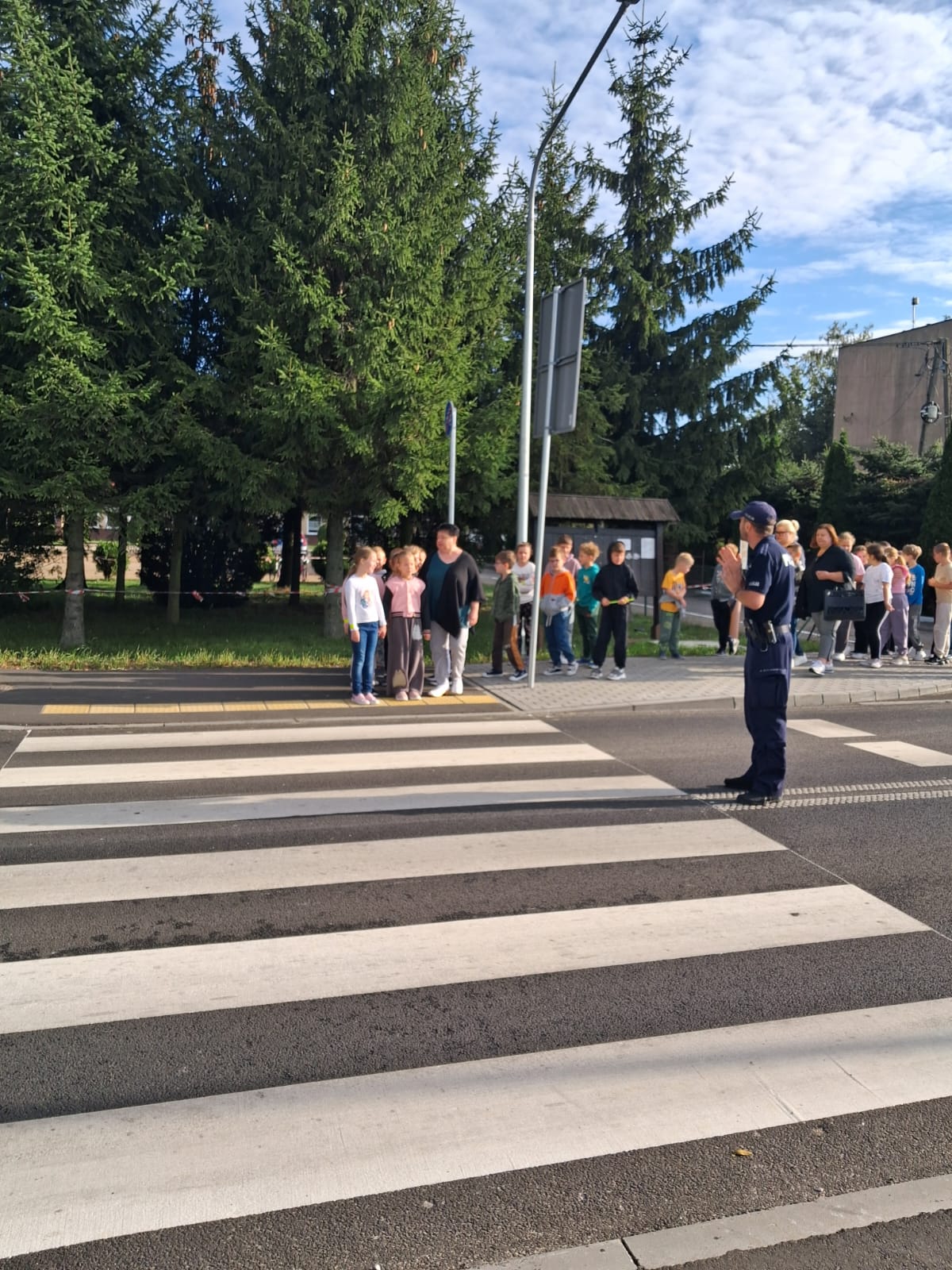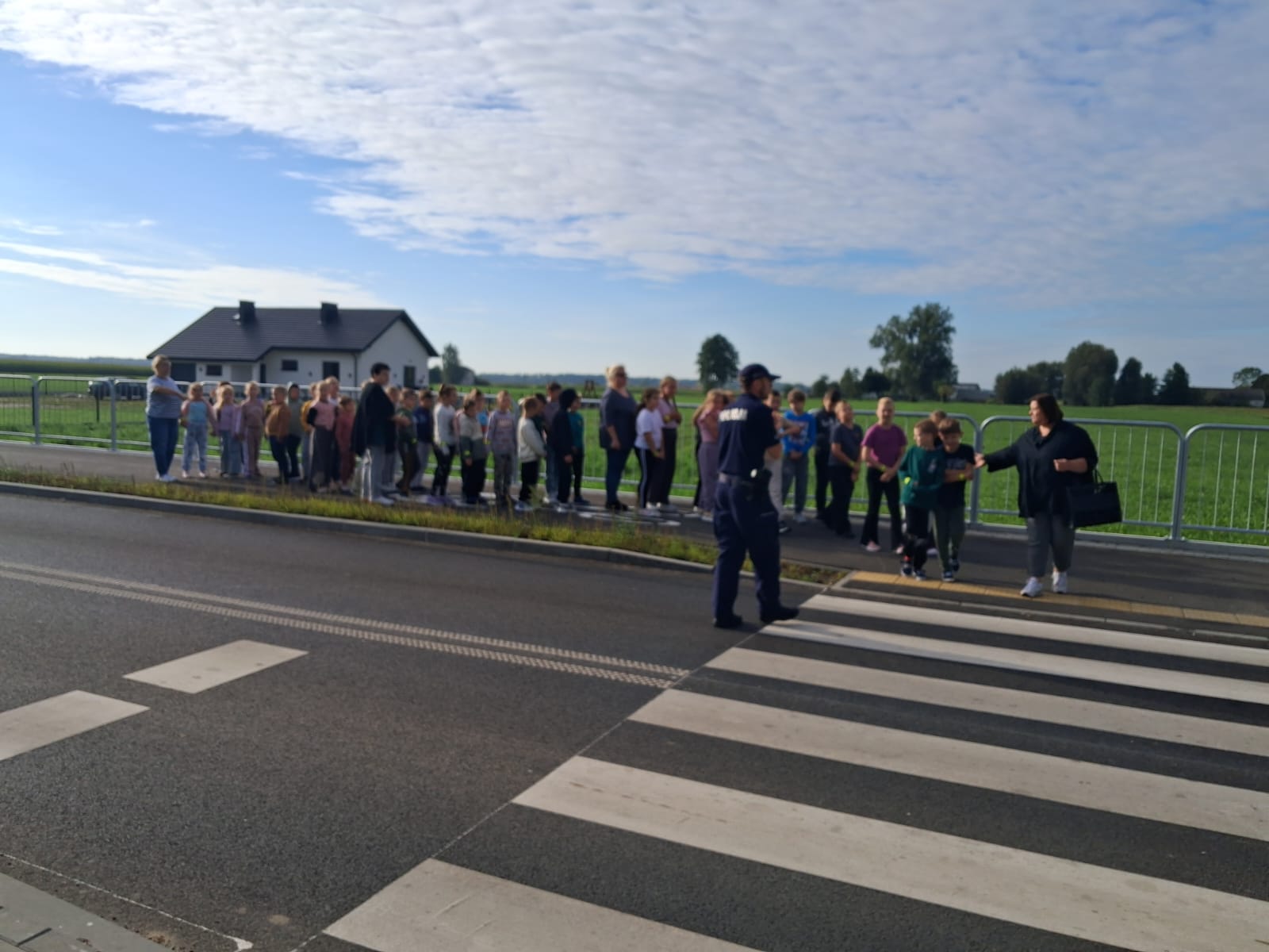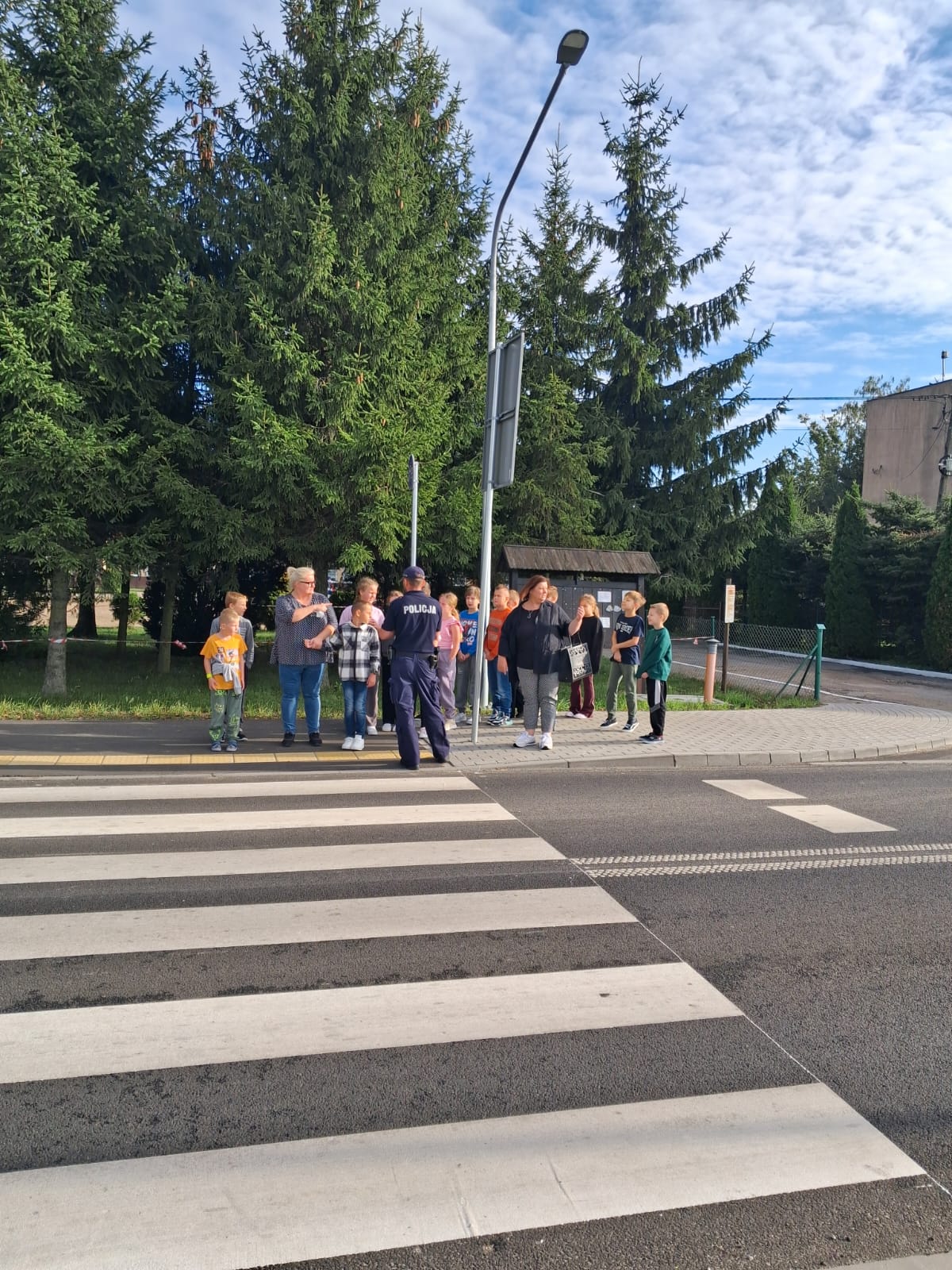 Funkcjonariusze omówili z uczniami podstawowe zasady bezpiecznego poruszania się po drogach, zarówno pieszego uczestnika ruchu, jak i rowerzysty.