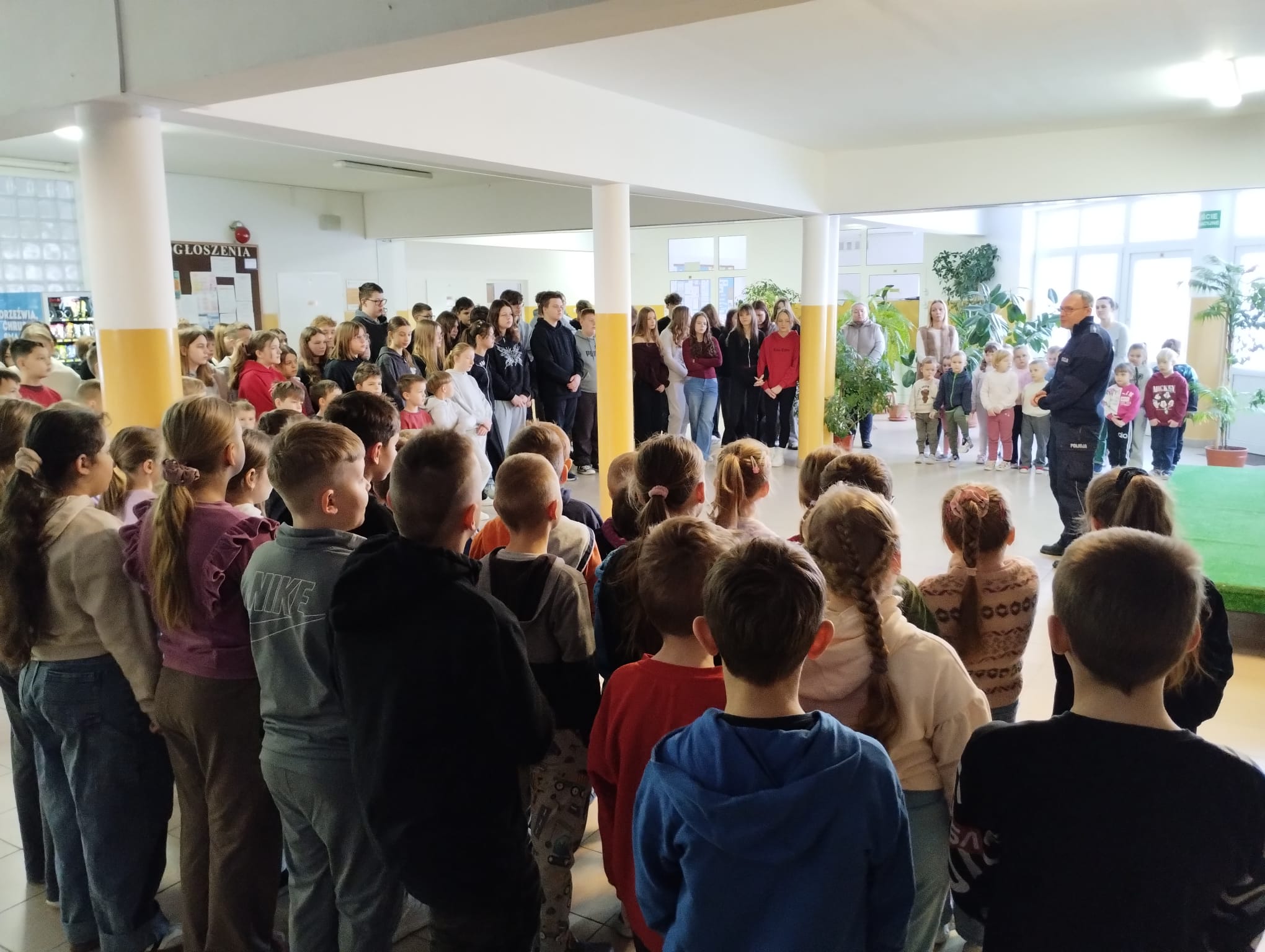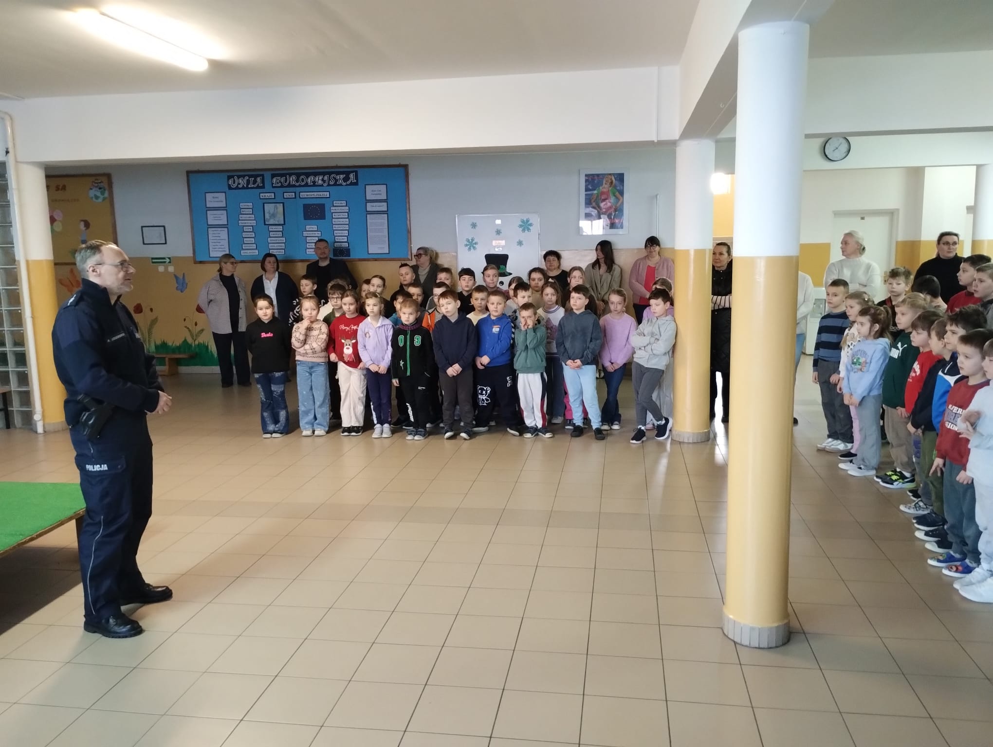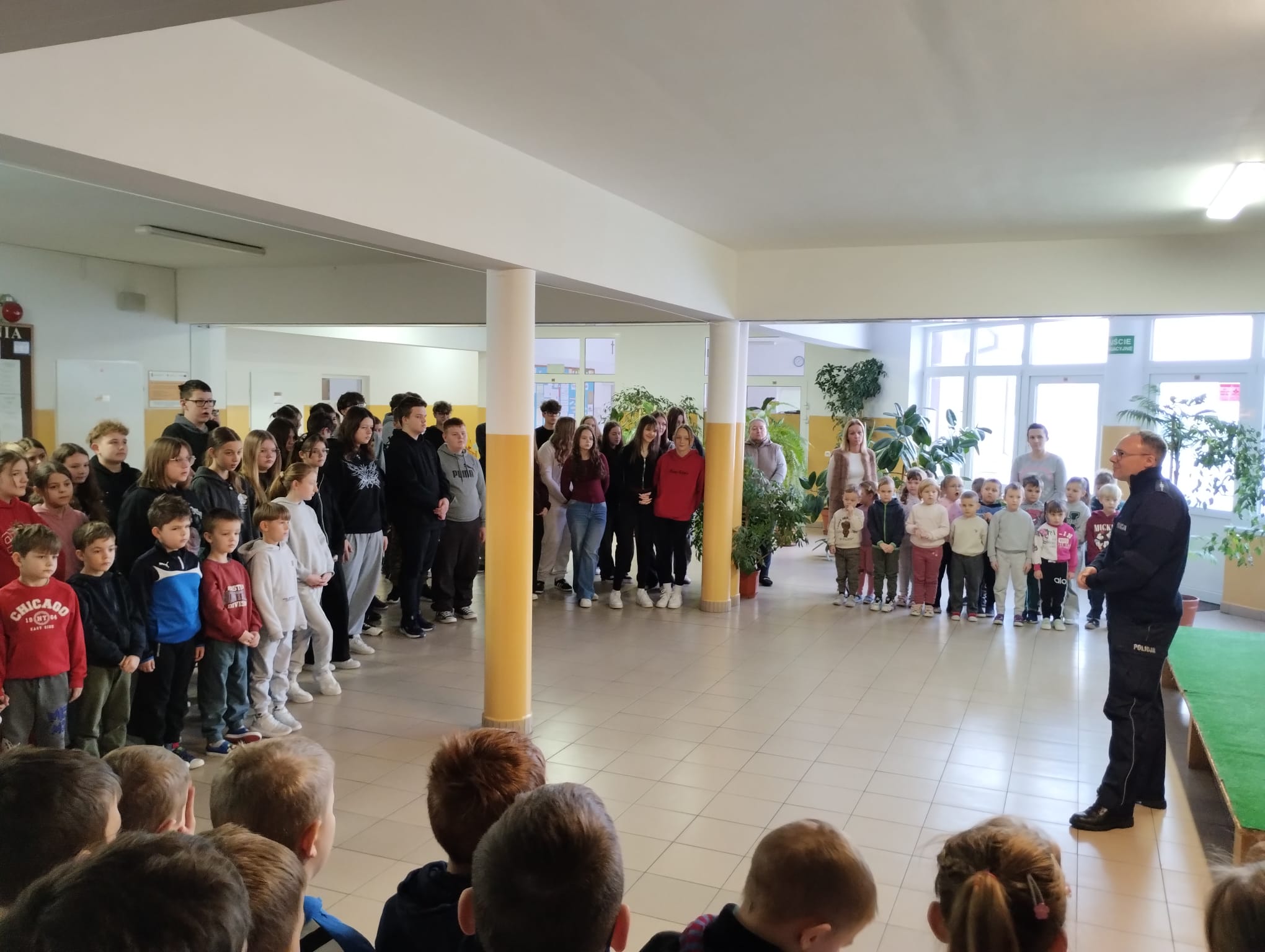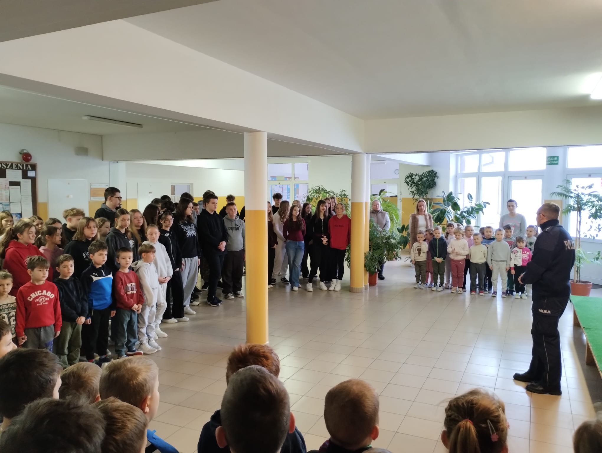 W dniu 22 stycznia 2026 r. w naszej szkole odbyło się spotkanie profilaktyczne z udziałem dzieci z oddziałów przedszkolnych oraz uczniów klas I–VIII, które poprowadził funkcjonariusz Policji. Tematem przewodnim wydarzenia było bezpieczne spędzanie ferii zimowych.