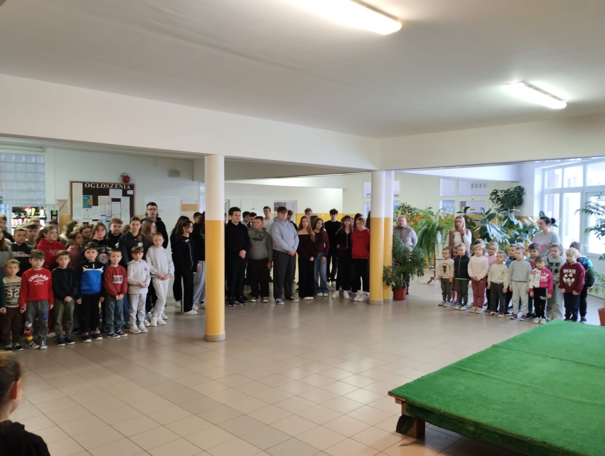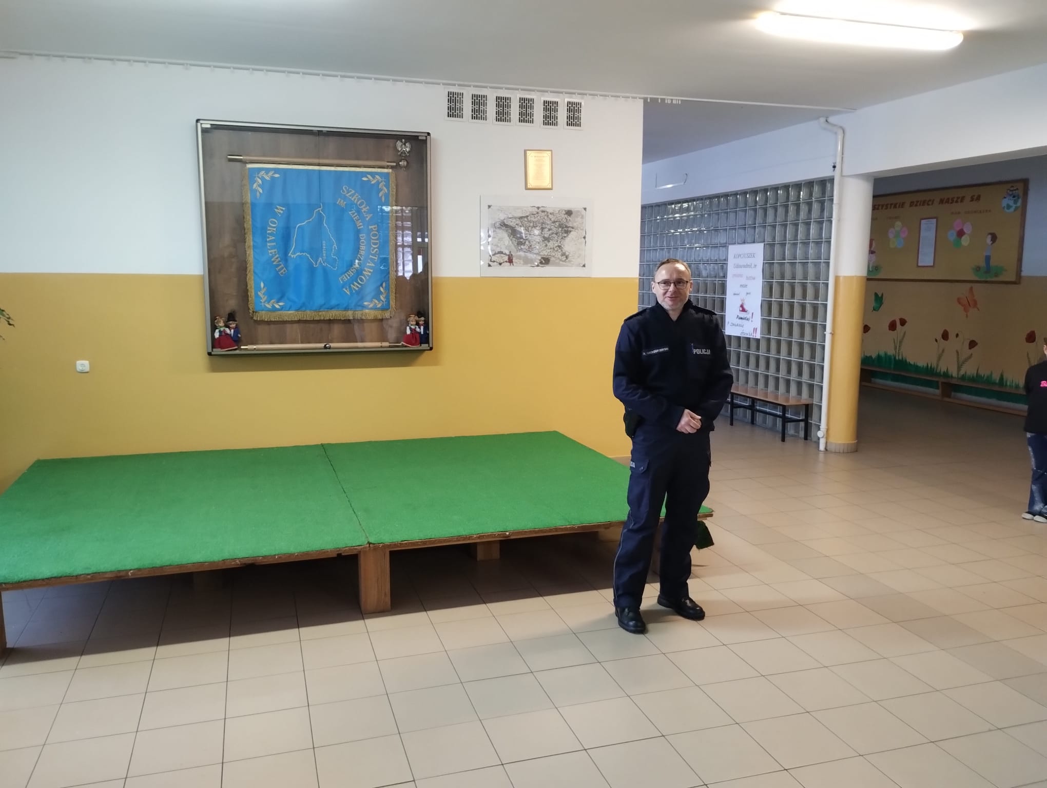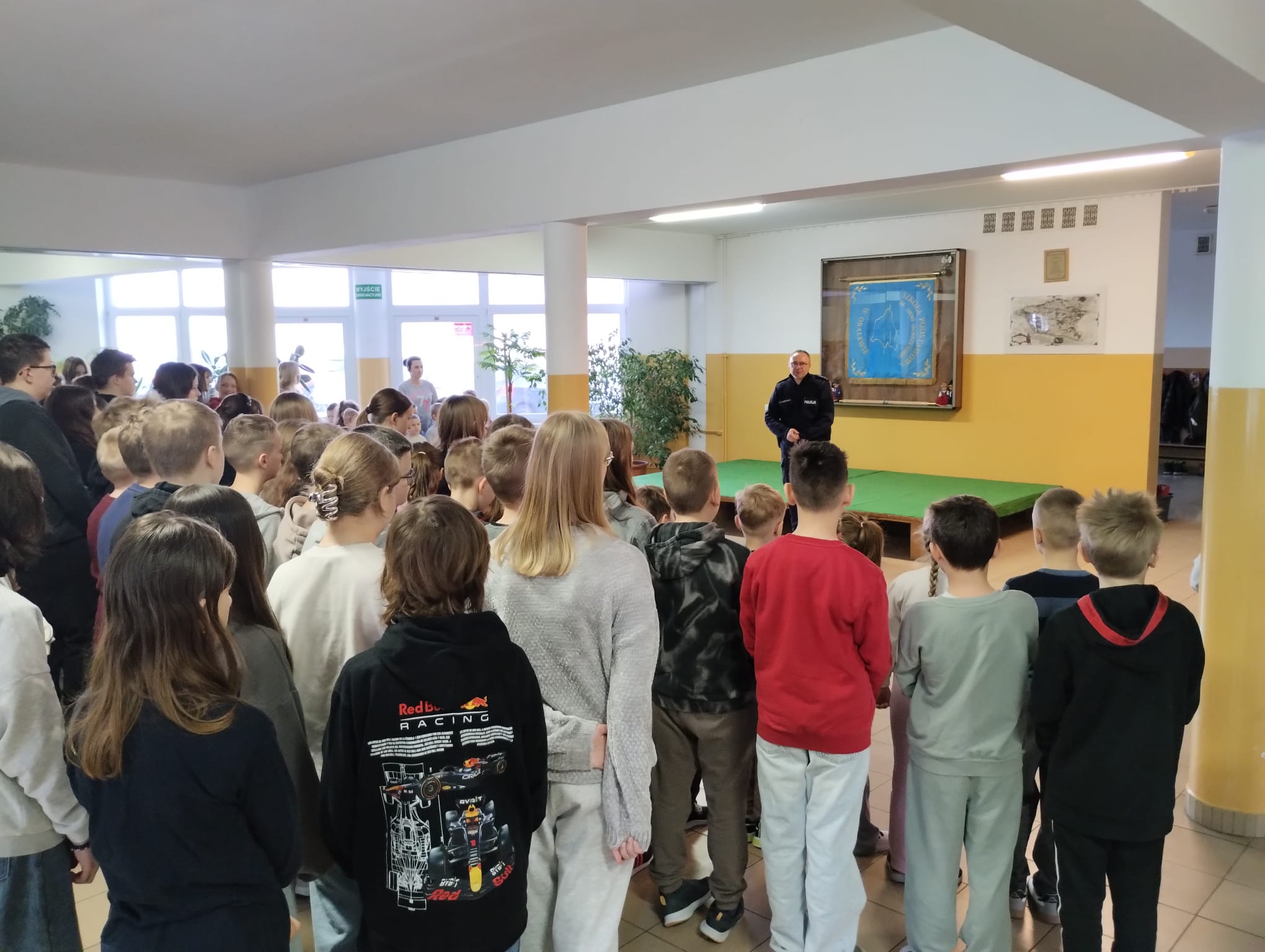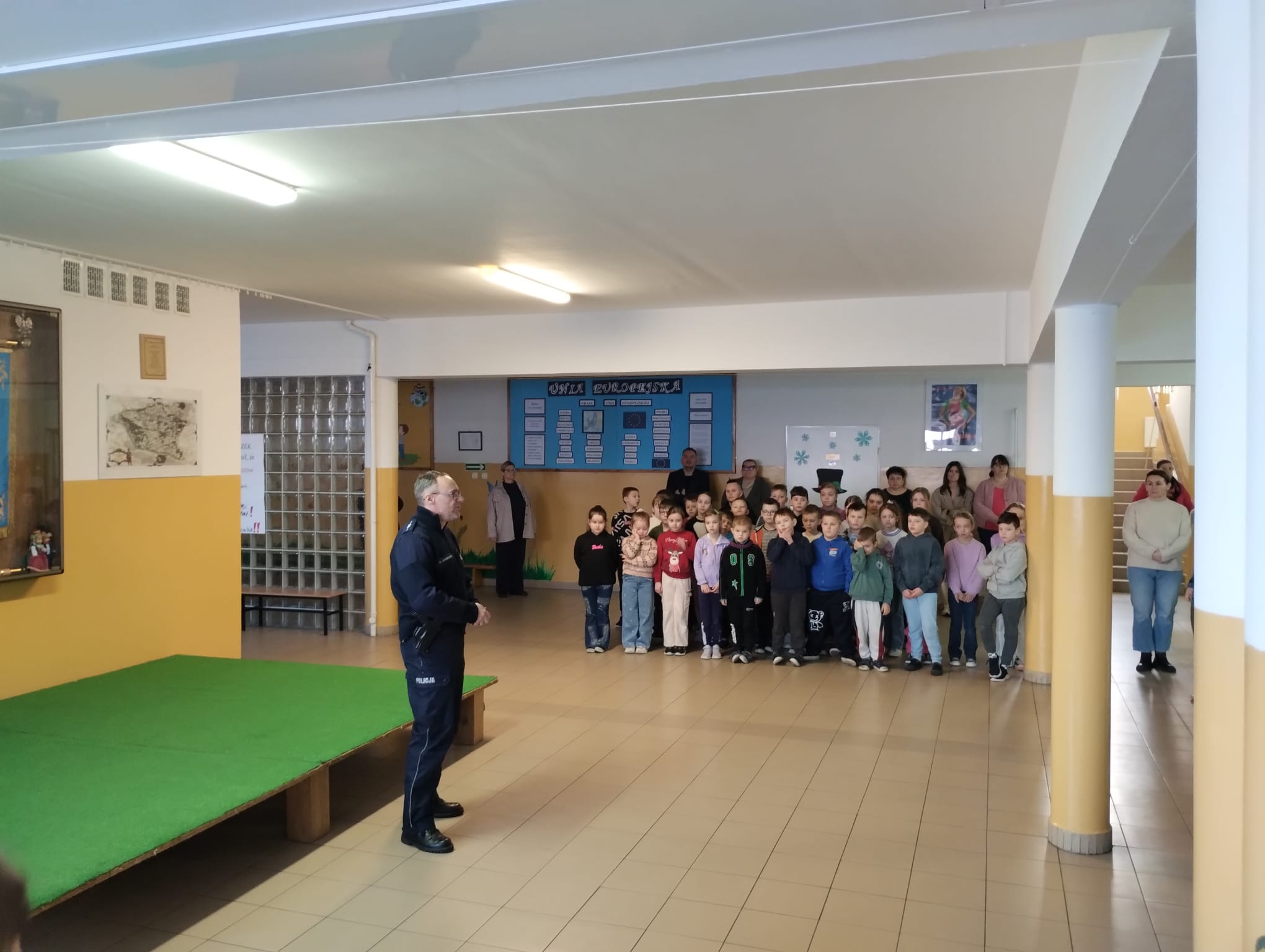 W dniu 22 stycznia 2026 r. w naszej szkole odbyło się spotkanie profilaktyczne z udziałem dzieci z oddziałów przedszkolnych oraz uczniów klas I–VIII, które poprowadził funkcjonariusz Policji. Tematem przewodnim wydarzenia było bezpieczne spędzanie ferii zimowych.