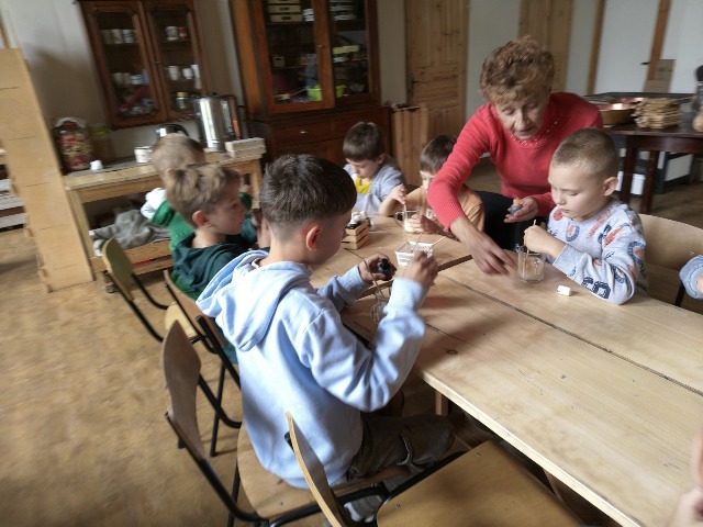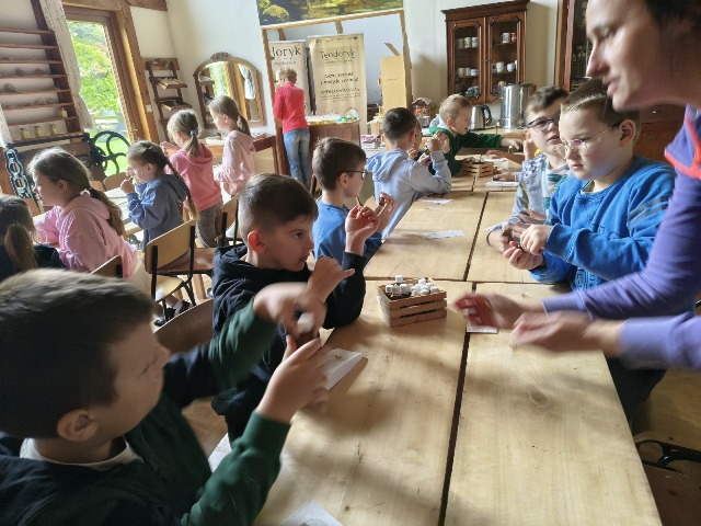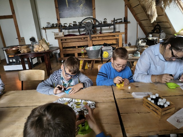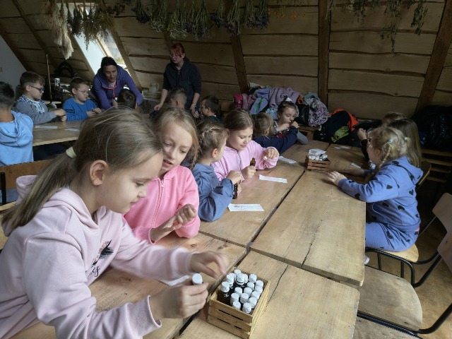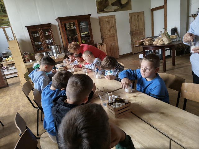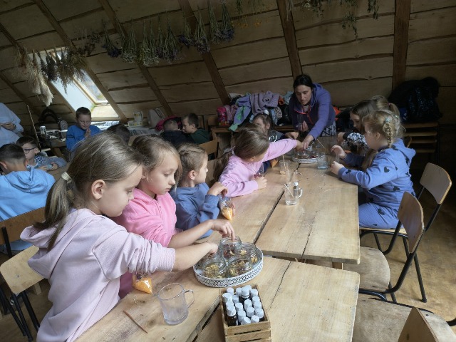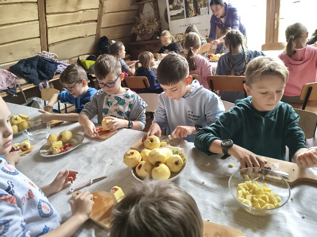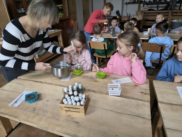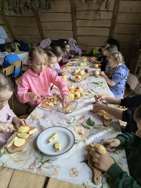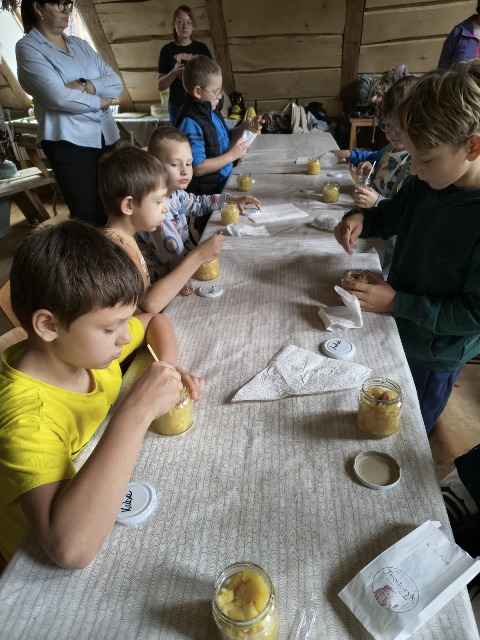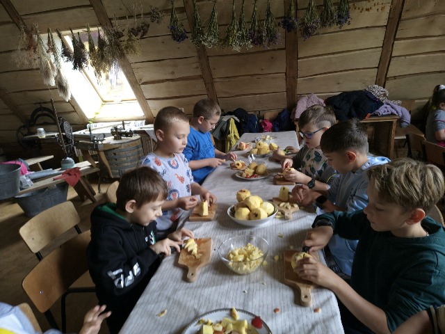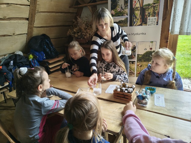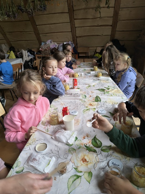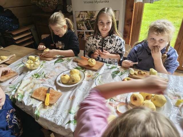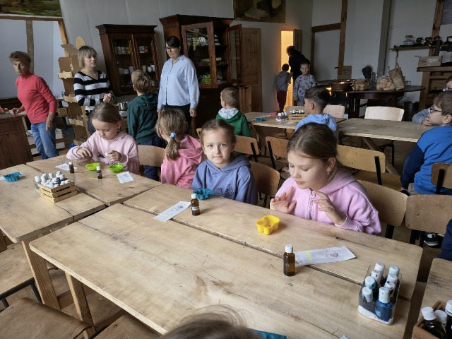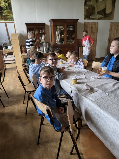 30 września 2025r. uczniowie klas drugiej wraz z opiekunami wybrali się na wycieczkę do Wioski Mydlarskiej w Fiałkach nieopodal Górzna. W czasie tej wycieczki dzieci brały udział w 2 warsztatach. W czasie pierwszego warsztatu poznały proces powstawania mydła glicerynowego z roślinnymi dodatkami. Własnoręcznie wykonały mydło, tworząc kompozycję zapachową oraz dobierając dodatki roślinne i kolor. Drugim produktem wykonanym własnoręcznie była sól do kąpieli. Uczestnicy warsztatów zabrali ze sobą mydło i sól do kąpieli, które sami zrobili. W czasie drugiego warsztatu uczniowie wykonali powidła z jabłek. Samodzielnie przygotowali niezbędne składniki, a następnie pod okiem pani instruktor prażyli jabłuszka w dużych, miedzianych misach, na piecu opalanym drewnem. Zadanie to sprawiło uczniom wiele frajdy, a jeszcze więcej dostarczyła degustacja samodzielnie przygotowanych konfitur. Każdy z uczestników otrzymał słoiczek z powidłami. W międzyczasie dzieci obejrzały sprzęt pralniczy, który kiedyś używano. W czasie wycieczki spotkała nas niespodzianka, ponieważ zanieśliśmyskórki i ogryzki od jabłek koniom. To było wyjątkowa przygoda pełnego wrażeń dnia. Po warsztatach nadszedł czas na posiłek – pieczone kiełbaski.