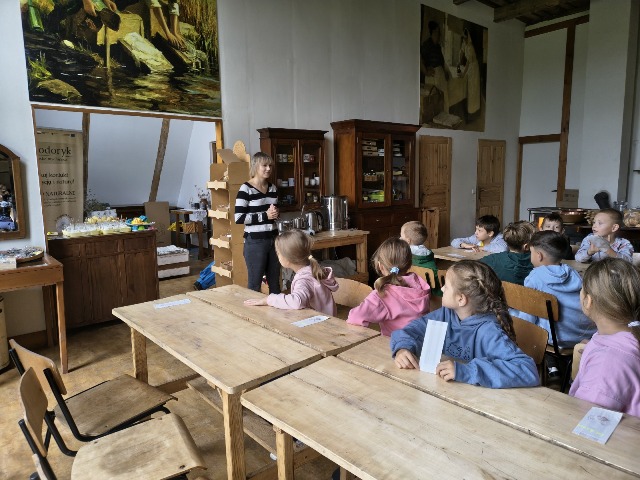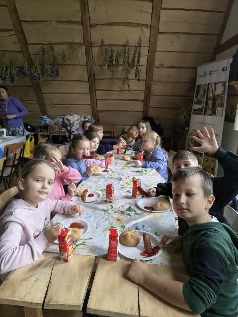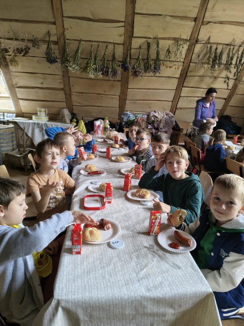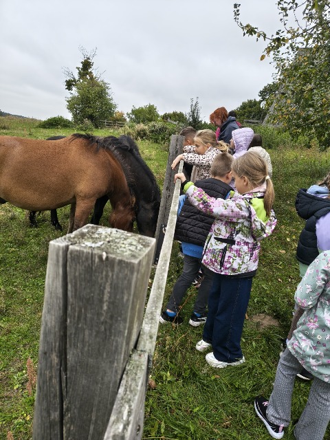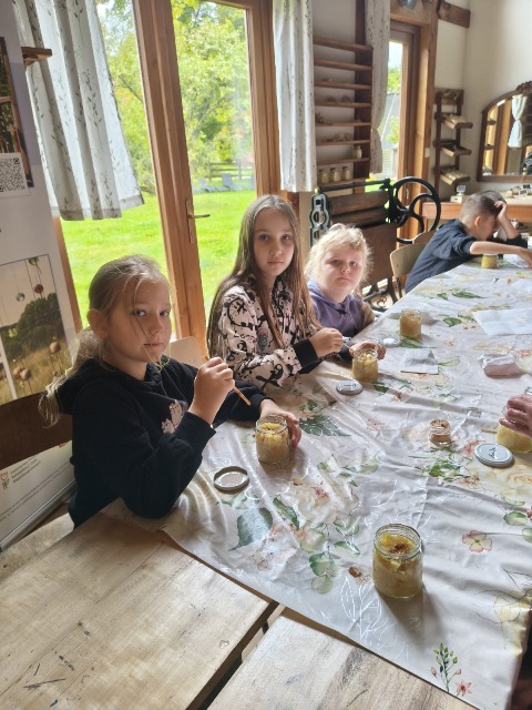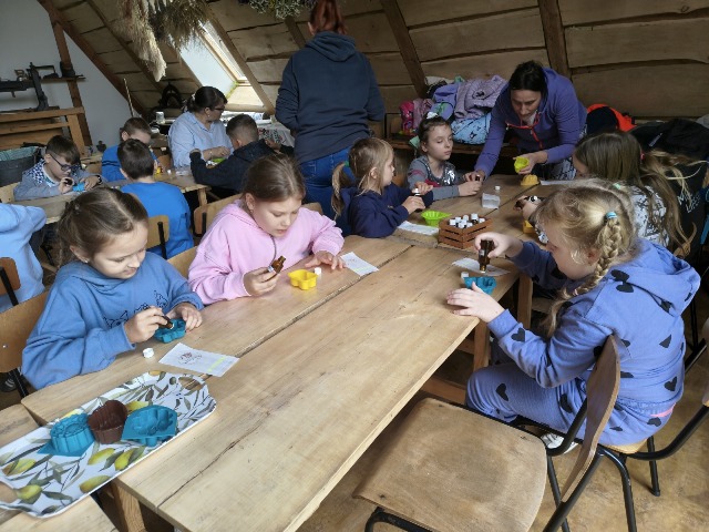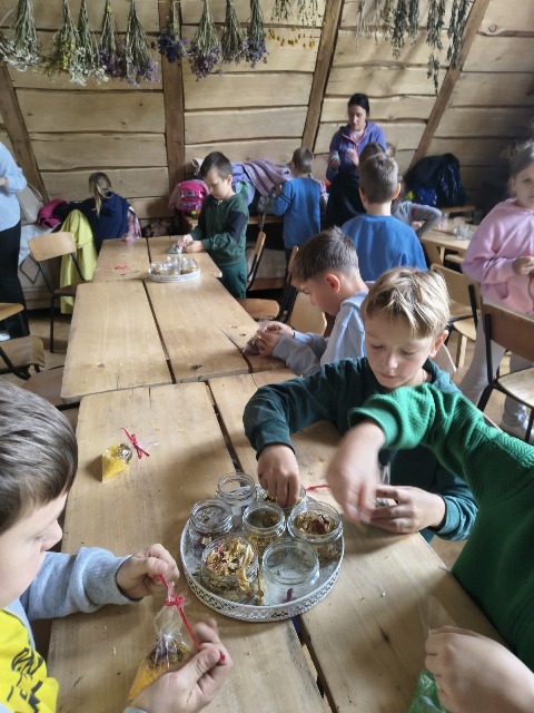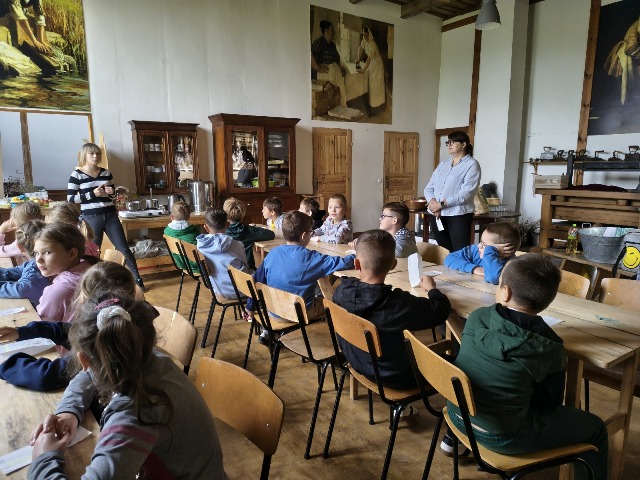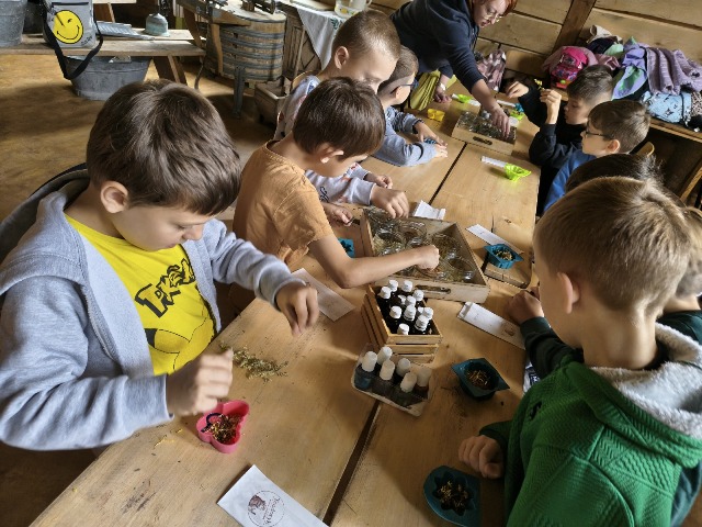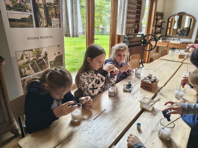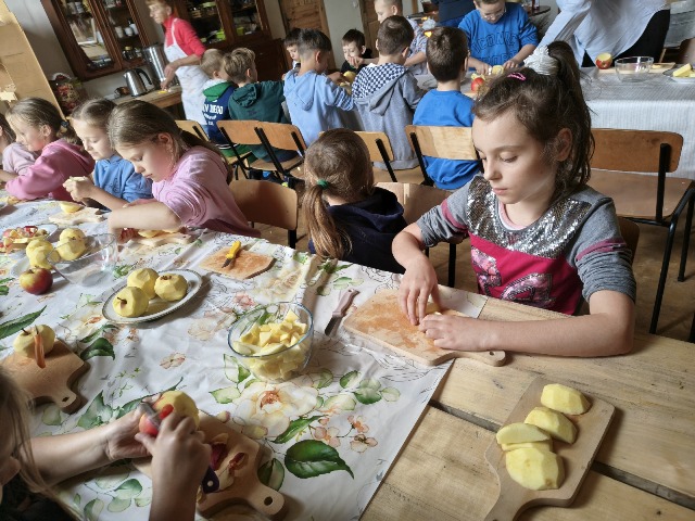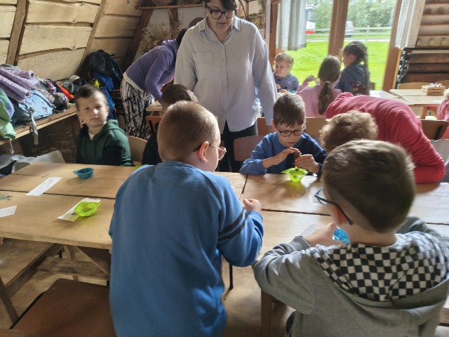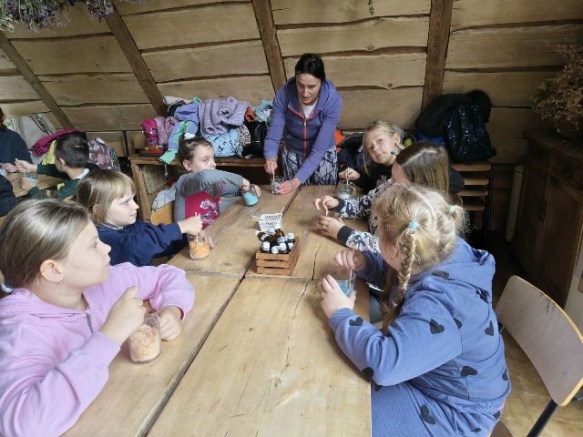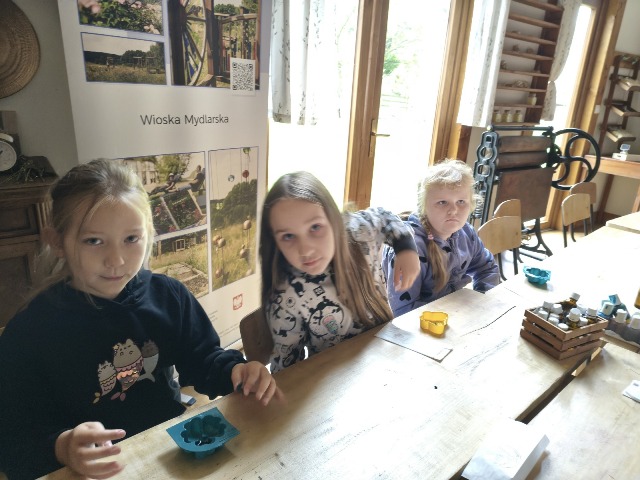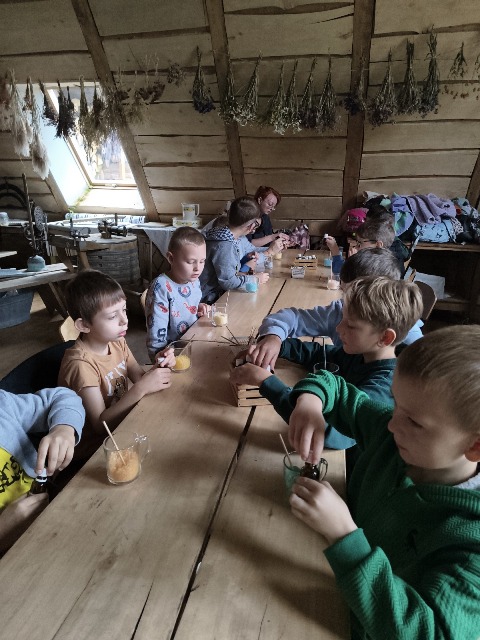 30 września 2025r. uczniowie klas drugiej wraz z opiekunami wybrali się na wycieczkę do Wioski Mydlarskiej w Fiałkach nieopodal Górzna. W czasie tej wycieczki dzieci brały udział w 2 warsztatach. W czasie pierwszego warsztatu poznały proces powstawania mydła glicerynowego z roślinnymi dodatkami. Własnoręcznie wykonały mydło, tworząc kompozycję zapachową oraz dobierając dodatki roślinne i kolor. Drugim produktem wykonanym własnoręcznie była sól do kąpieli. Uczestnicy warsztatów zabrali ze sobą mydło i sól do kąpieli, które sami zrobili. W czasie drugiego warsztatu uczniowie wykonali powidła z jabłek. Samodzielnie przygotowali niezbędne składniki, a następnie pod okiem pani instruktor prażyli jabłuszka w dużych, miedzianych misach, na piecu opalanym drewnem. Zadanie to sprawiło uczniom wiele frajdy, a jeszcze więcej dostarczyła degustacja samodzielnie przygotowanych konfitur. Każdy z uczestników otrzymał słoiczek z powidłami. W międzyczasie dzieci obejrzały sprzęt pralniczy, który kiedyś używano. W czasie wycieczki spotkała nas niespodzianka, ponieważ zanieśliśmyskórki i ogryzki od jabłek koniom. To było wyjątkowa przygoda pełnego wrażeń dnia. Po warsztatach nadszedł czas na posiłek – pieczone kiełbaski.