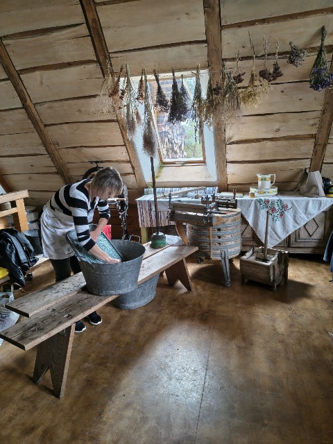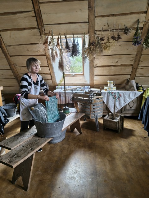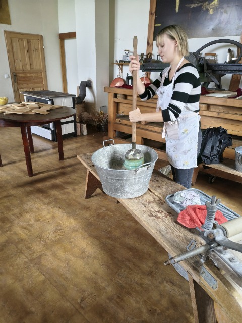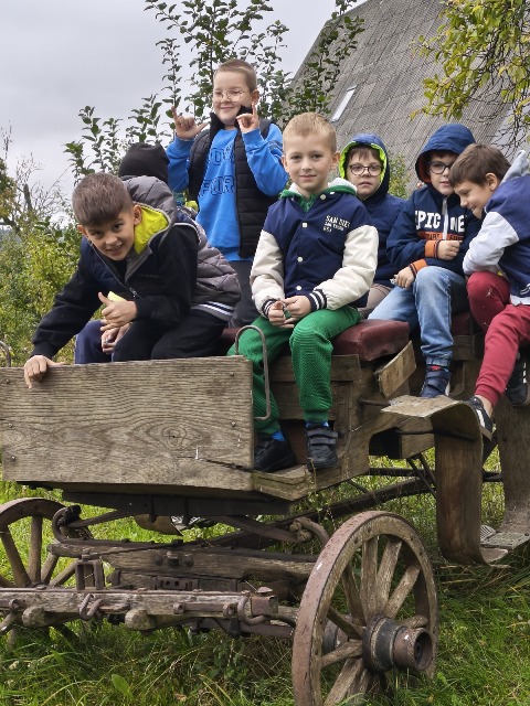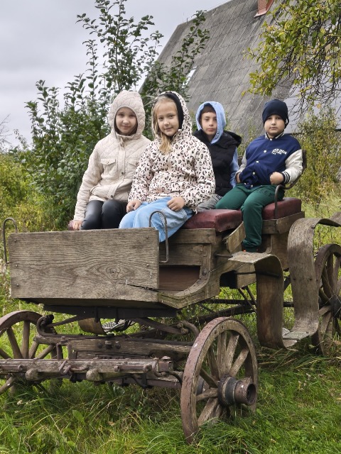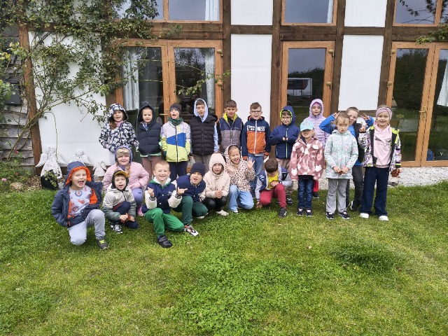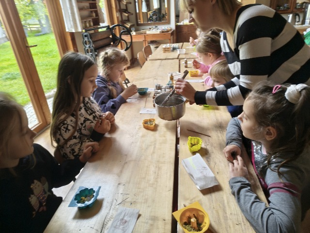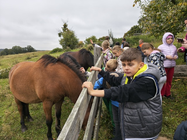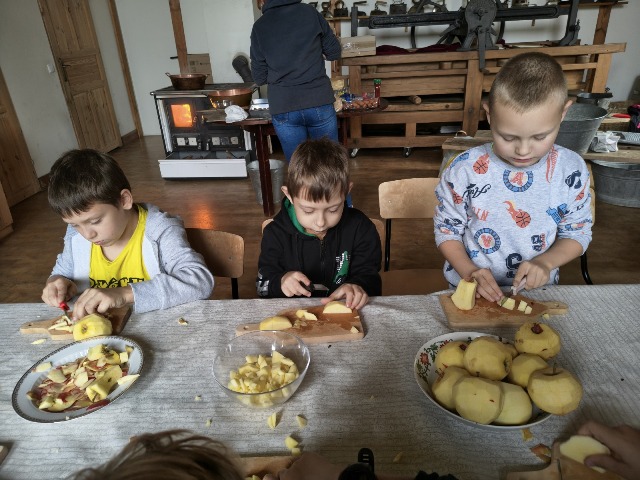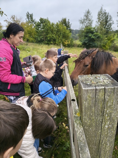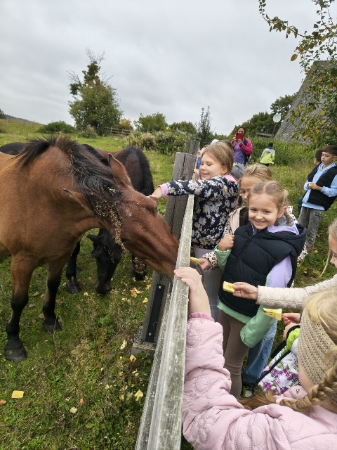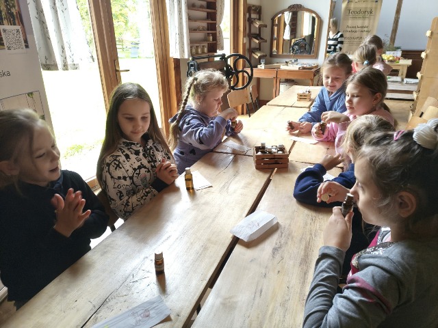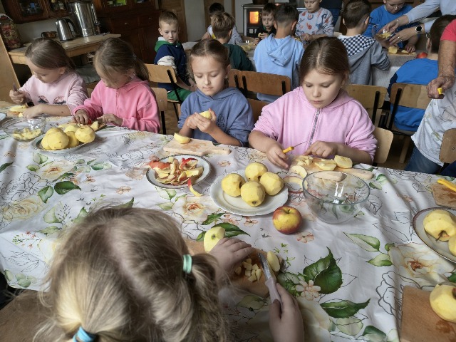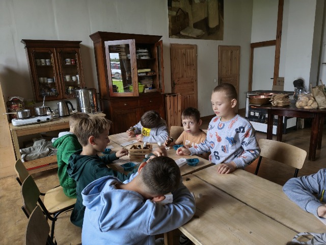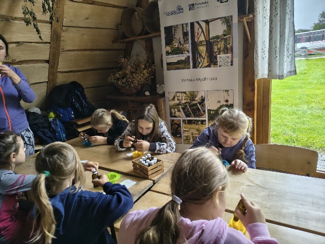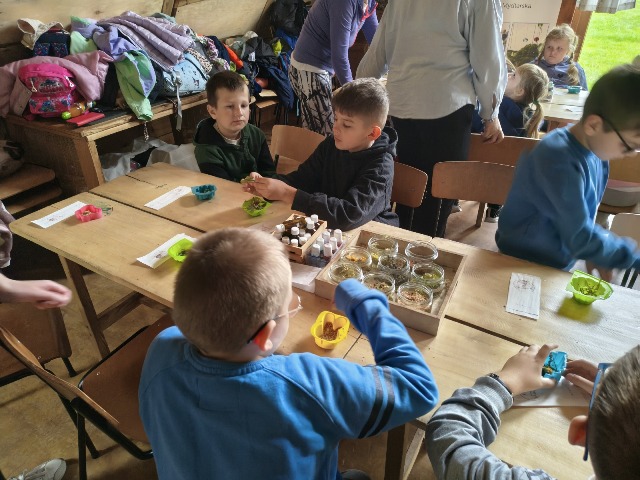 30 września 2025r. uczniowie klas drugiej wraz z opiekunami wybrali się na wycieczkę do Wioski Mydlarskiej w Fiałkach nieopodal Górzna. W czasie tej wycieczki dzieci brały udział w 2 warsztatach. W czasie pierwszego warsztatu poznały proces powstawania mydła glicerynowego z roślinnymi dodatkami. Własnoręcznie wykonały mydło, tworząc kompozycję zapachową oraz dobierając dodatki roślinne i kolor. Drugim produktem wykonanym własnoręcznie była sól do kąpieli. Uczestnicy warsztatów zabrali ze sobą mydło i sól do kąpieli, które sami zrobili. W czasie drugiego warsztatu uczniowie wykonali powidła z jabłek. Samodzielnie przygotowali niezbędne składniki, a następnie pod okiem pani instruktor prażyli jabłuszka w dużych, miedzianych misach, na piecu opalanym drewnem. Zadanie to sprawiło uczniom wiele frajdy, a jeszcze więcej dostarczyła degustacja samodzielnie przygotowanych konfitur. Każdy z uczestników otrzymał słoiczek z powidłami. W międzyczasie dzieci obejrzały sprzęt pralniczy, który kiedyś używano. W czasie wycieczki spotkała nas niespodzianka, ponieważ zanieśliśmyskórki i ogryzki od jabłek koniom. To było wyjątkowa przygoda pełnego wrażeń dnia. Po warsztatach nadszedł czas na posiłek – pieczone kiełbaski.
